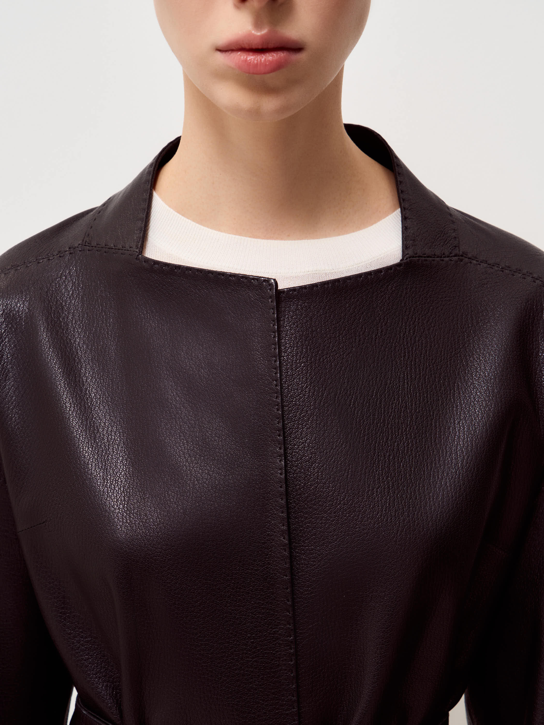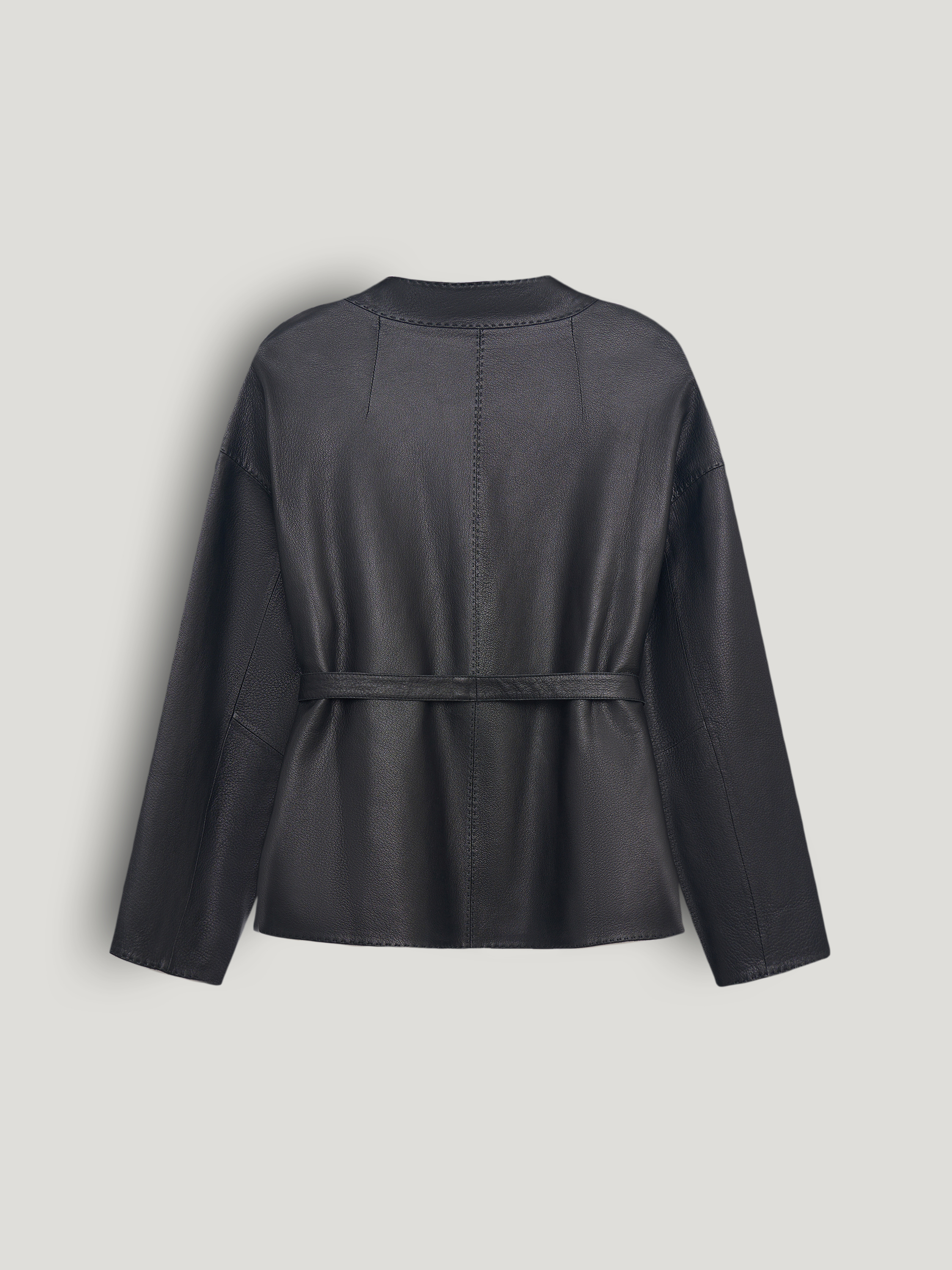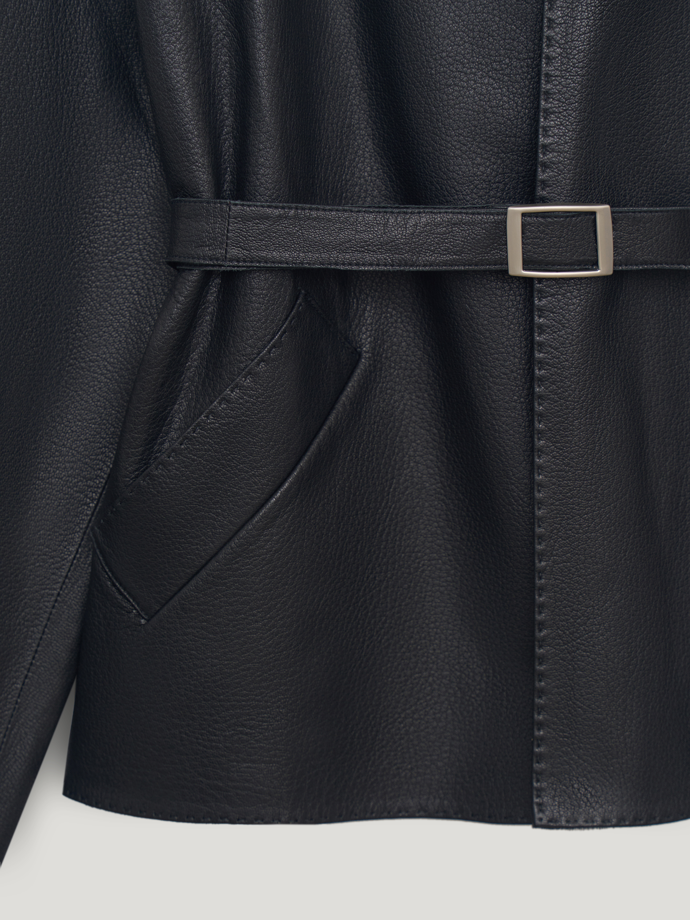 Жакет выполнен из натуральной кожи с мягкой, пластичной текстурой и деликатной матовой поверхностью. Материал хорошо драпируется, создает плавные линии и комфортен в носке. Силуэт свободный, с опущенной линией плеча и поясом, который позволяет аккуратно обозначить талию без жесткой фиксации формы. V-образный вырез и лаконичная застежка поддерживают сдержанный, современный характер модели. Карманы встроены в конструкцию и не утяжеляют общий вид. Подкладка из полиэстера облегчает надевание и повышает практичность. Глубокий черный оттенок подчеркивает фактуру кожи и легко сочетается с базовым гардеробом.