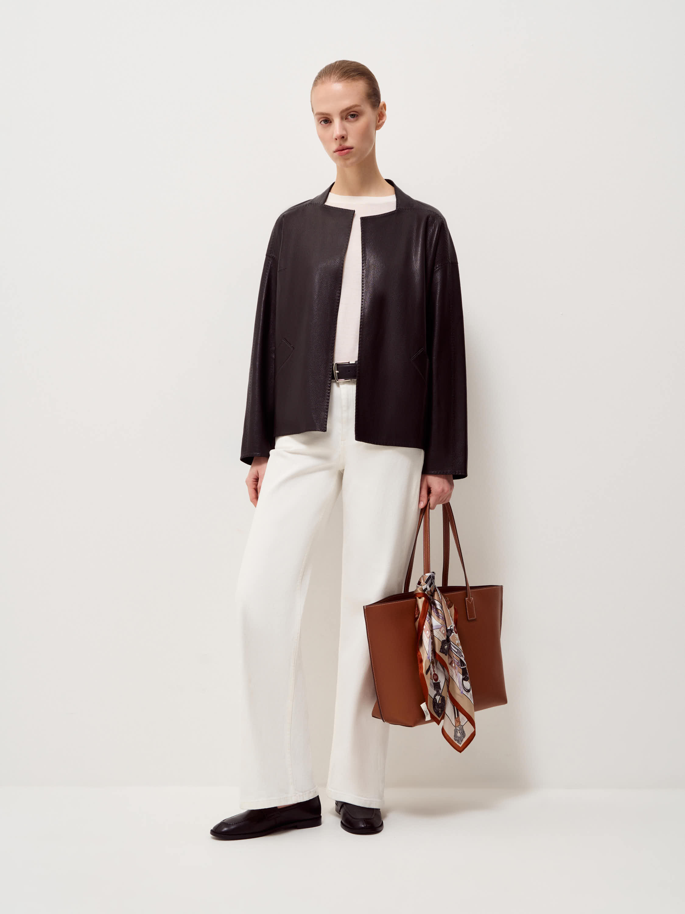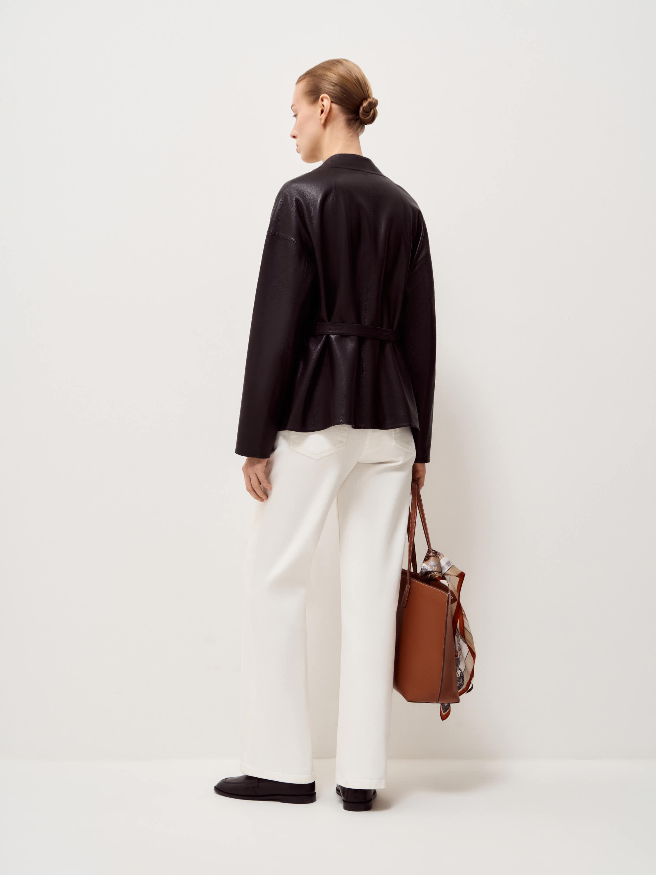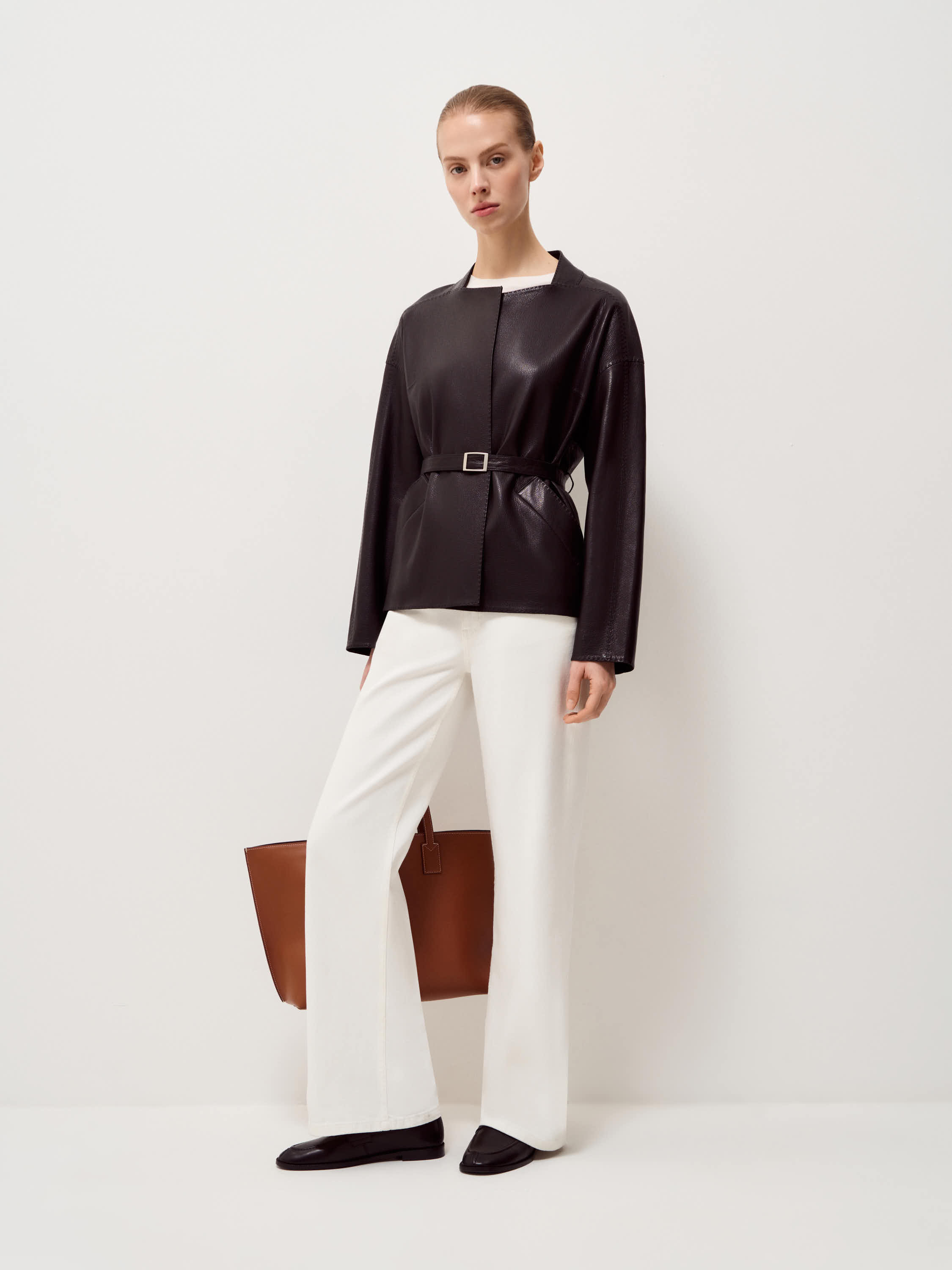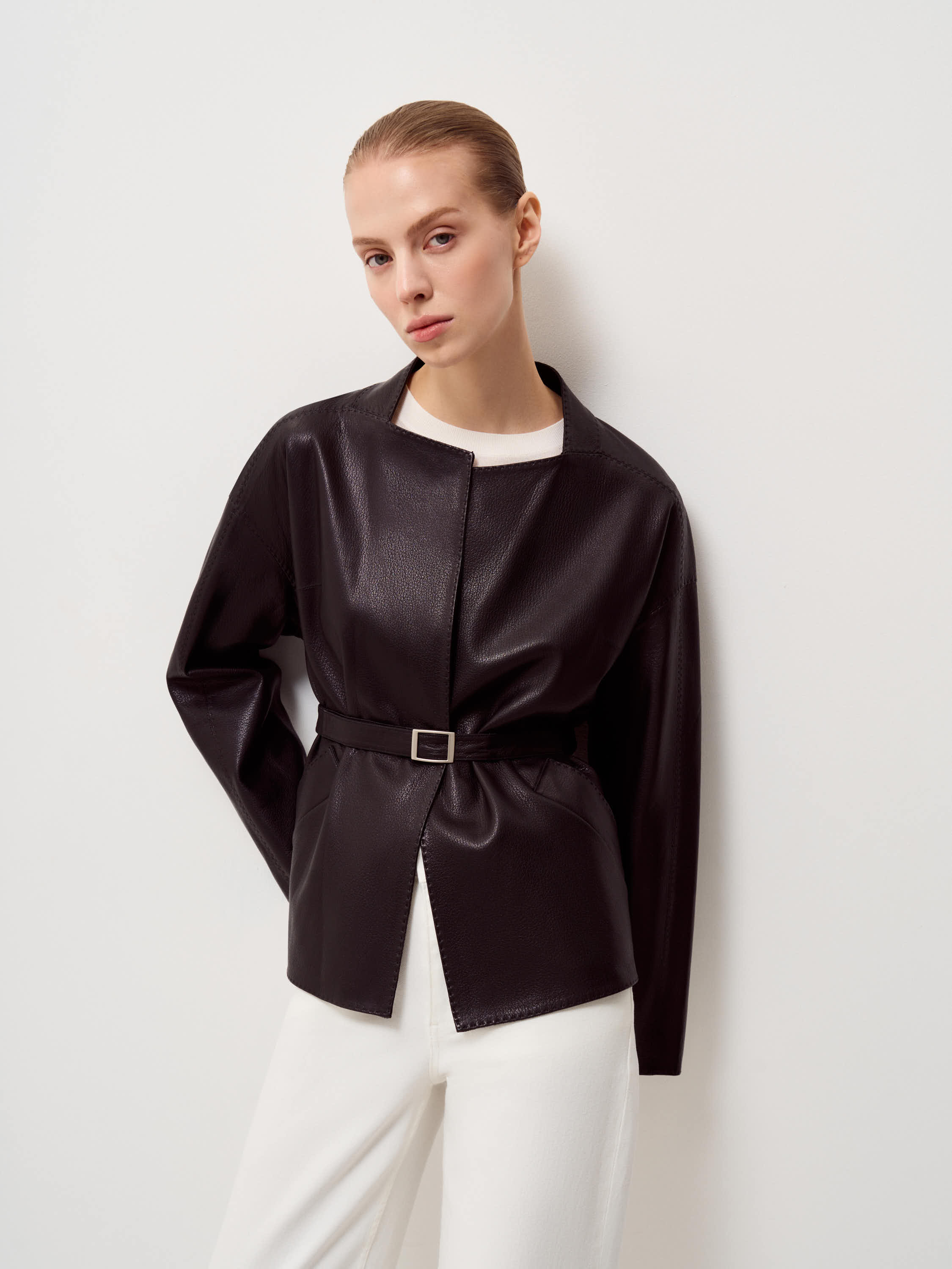 Жакет выполнен из натуральной кожи с мягкой, пластичной текстурой и деликатной матовой поверхностью. Материал хорошо драпируется, создает плавные линии и комфортен в носке. Силуэт свободный, с опущенной линией плеча и поясом, который позволяет аккуратно обозначить талию без жесткой фиксации формы. V-образный вырез и лаконичная застежка поддерживают сдержанный, современный характер модели. Карманы встроены в конструкцию и не утяжеляют общий вид. Подкладка из полиэстера облегчает надевание и повышает практичность. Глубокий черный оттенок подчеркивает фактуру кожи и легко сочетается с базовым гардеробом.