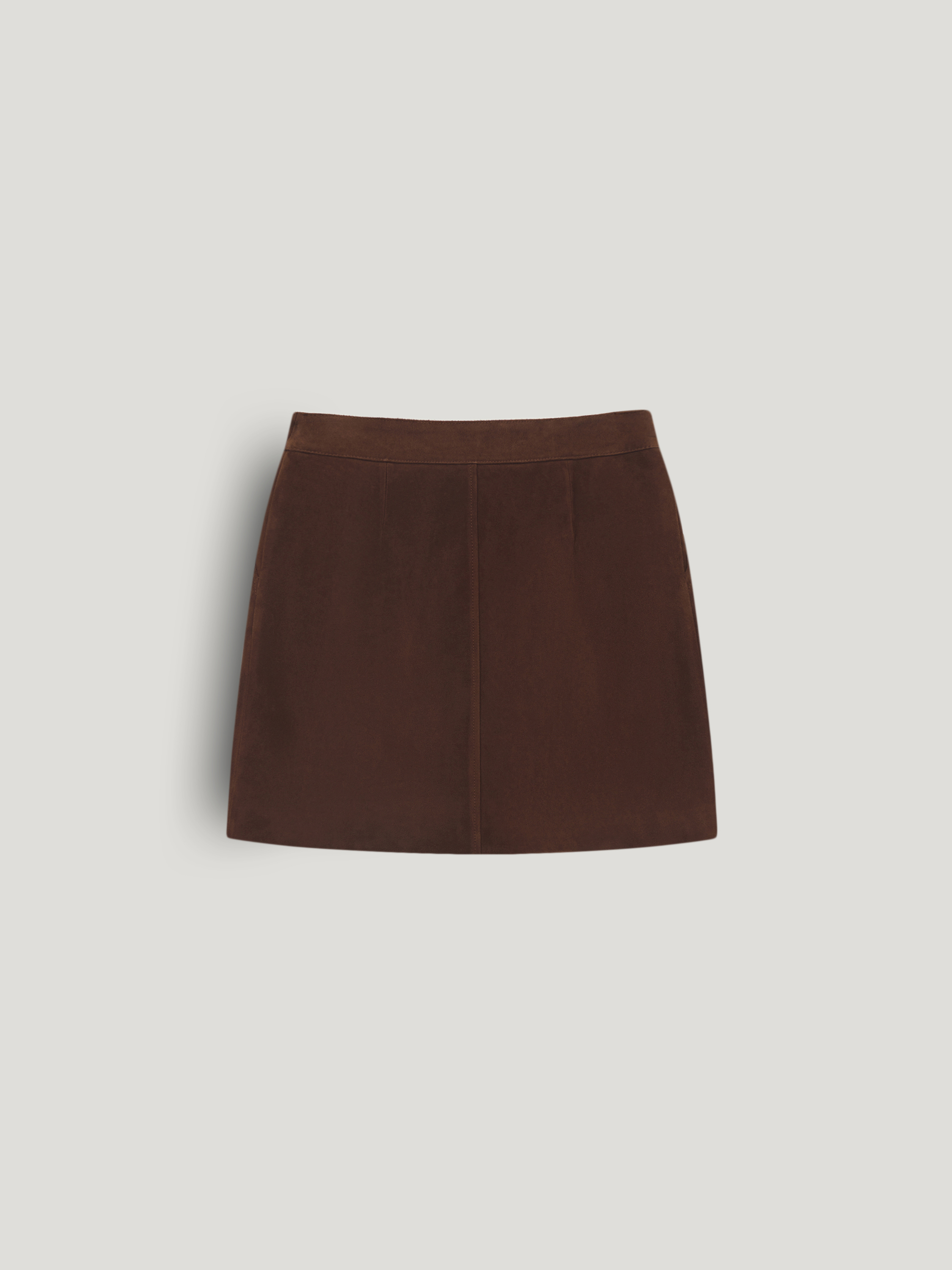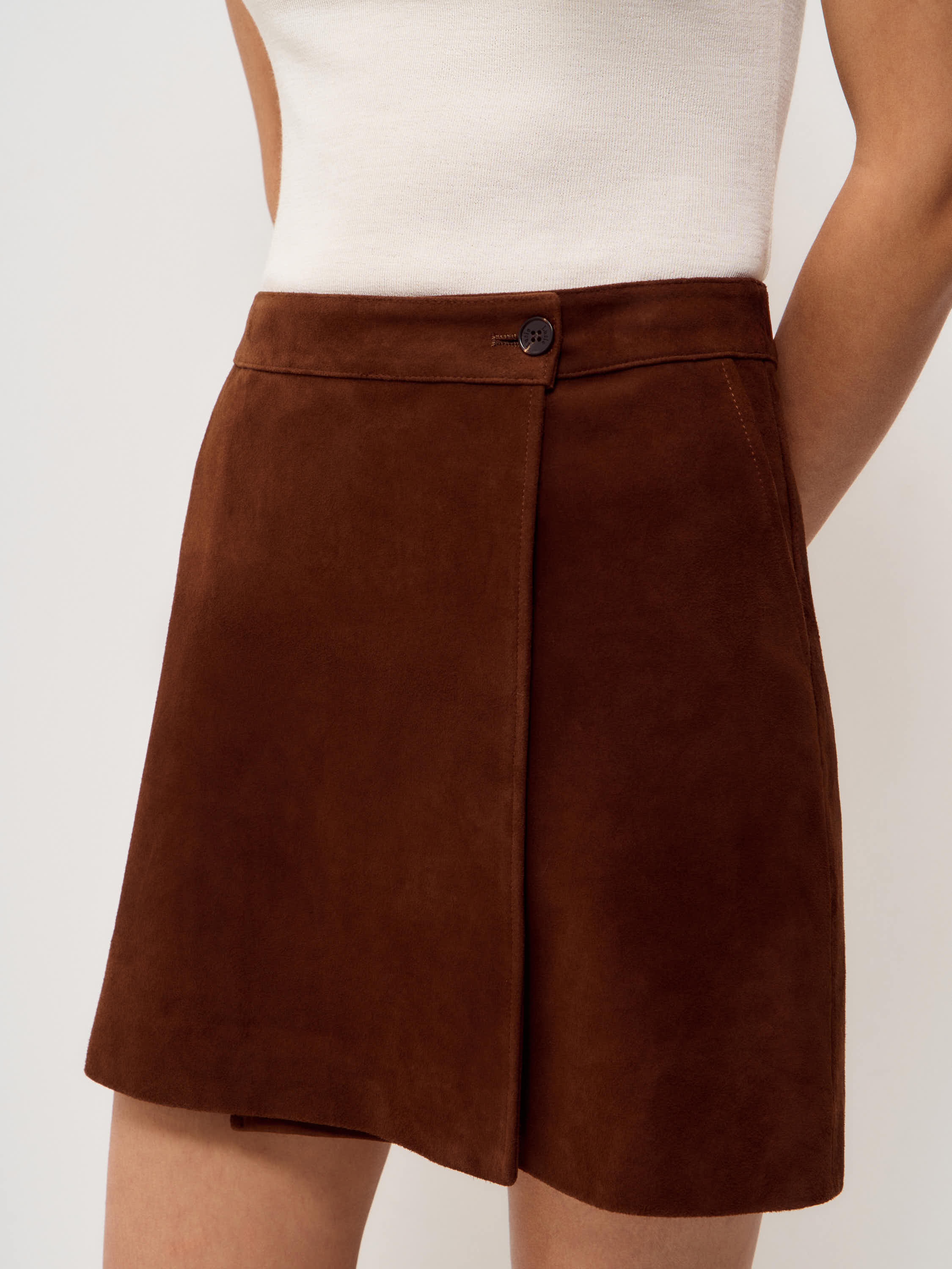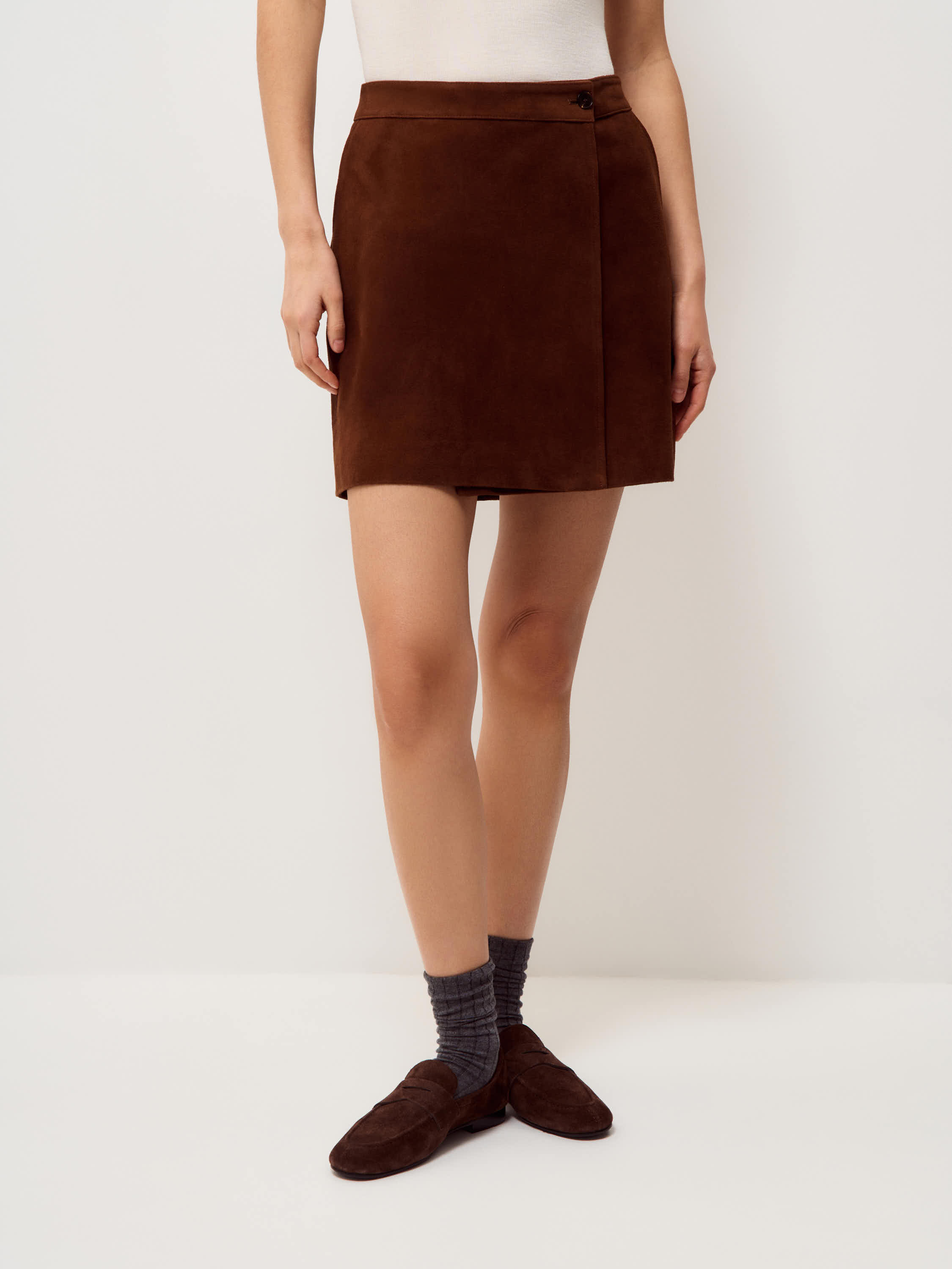 Юбка выполнена из 100% натуральной замши. Материал плотный, с ровной бархатистой поверхностью, сохраняет форму и аккуратно выглядит в носке. Модель мини прямого кроя с лаконичной линией талии и запахом, фиксируется аккуратной пуговицей сбоку. Силуэт четкий, без лишних деталей, с чистой обработкой края. Оттенок темно-коричневый. Юбка сочетается с трикотажем, рубашками и жакетами, подходит для межсезонных комплектов.