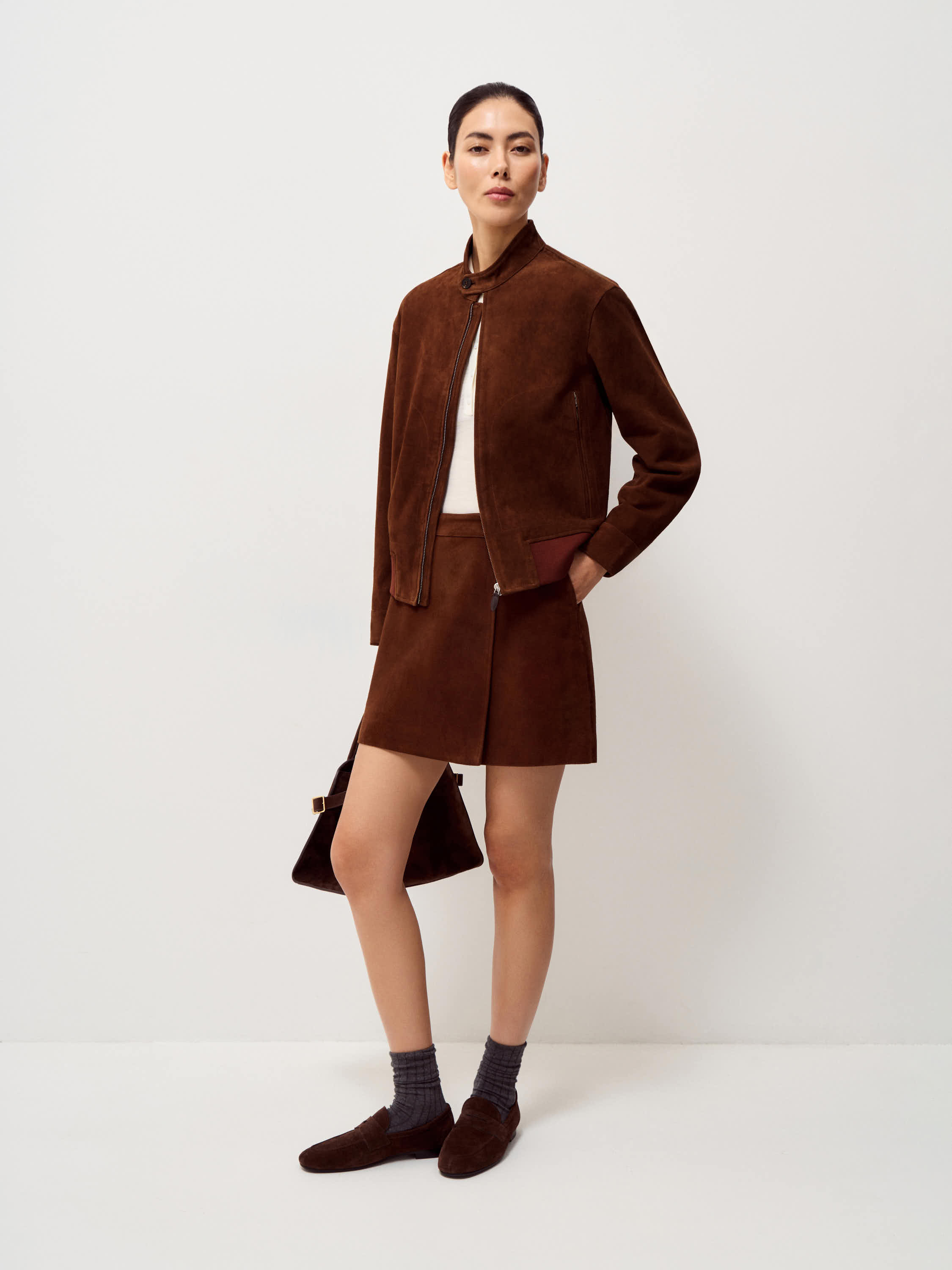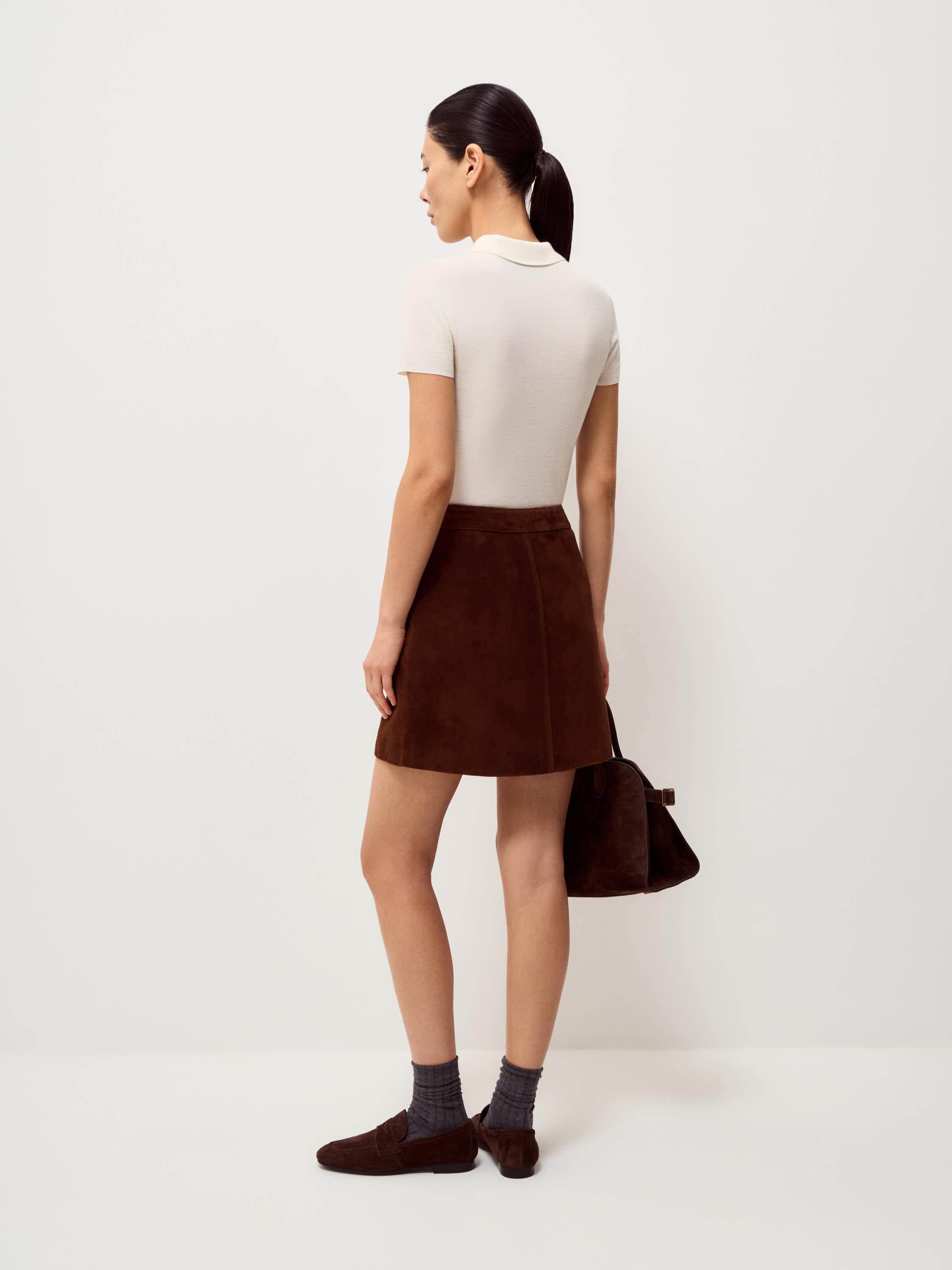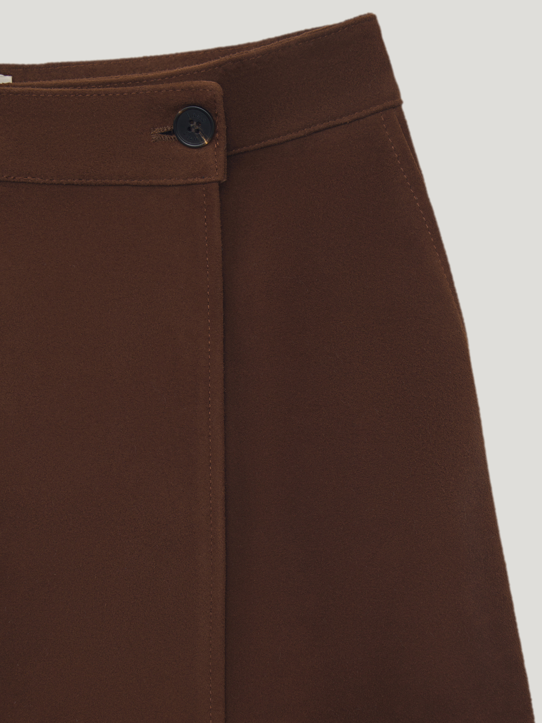 Юбка выполнена из 100% натуральной замши. Материал плотный, с ровной бархатистой поверхностью, сохраняет форму и аккуратно выглядит в носке. Модель мини прямого кроя с лаконичной линией талии и запахом, фиксируется аккуратной пуговицей сбоку. Силуэт четкий, без лишних деталей, с чистой обработкой края. Оттенок темно-коричневый. Юбка сочетается с трикотажем, рубашками и жакетами, подходит для межсезонных комплектов.