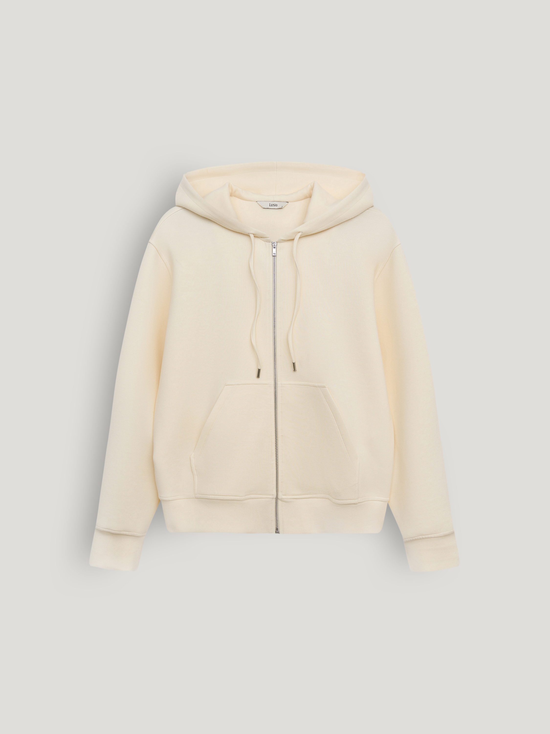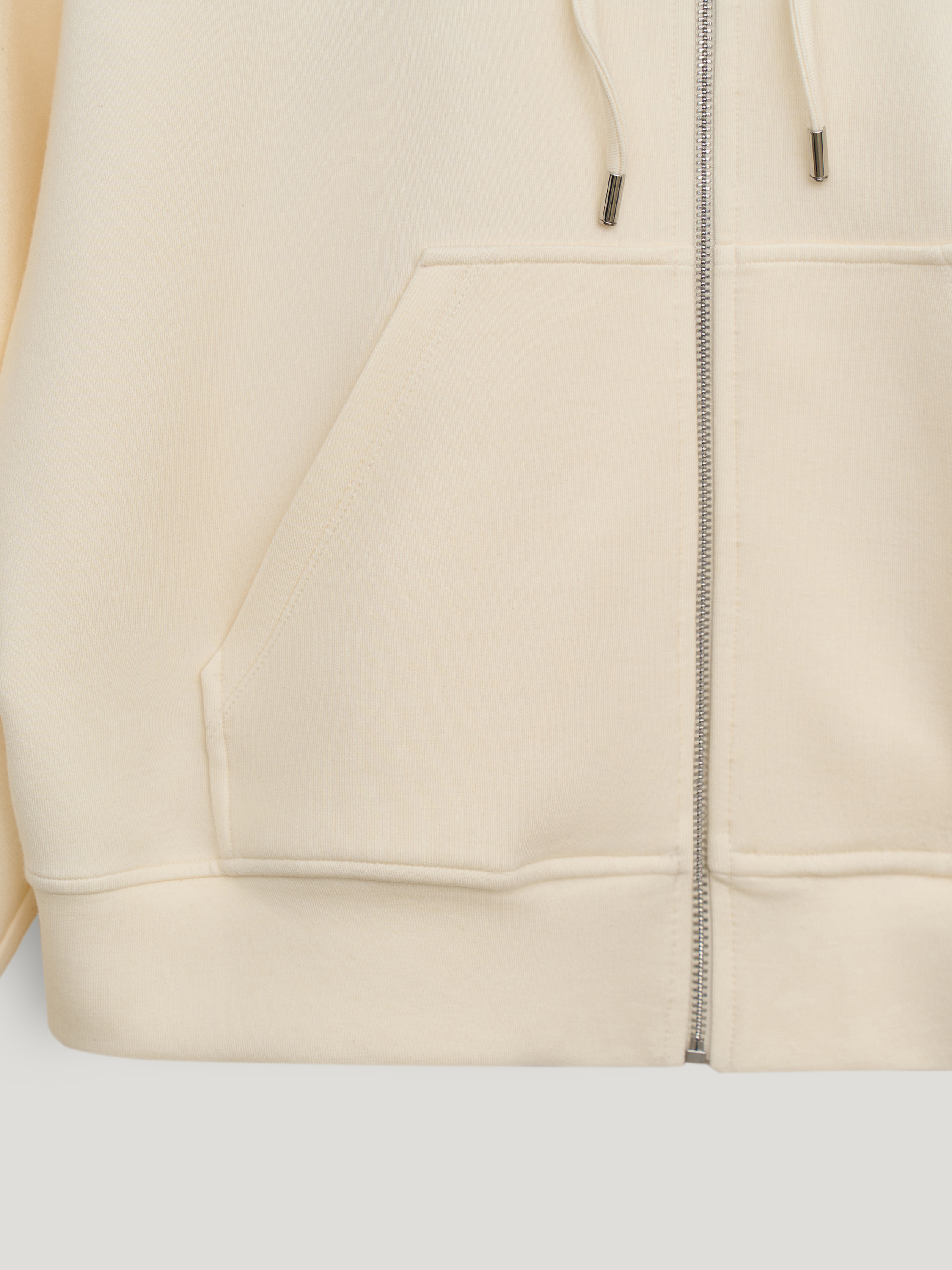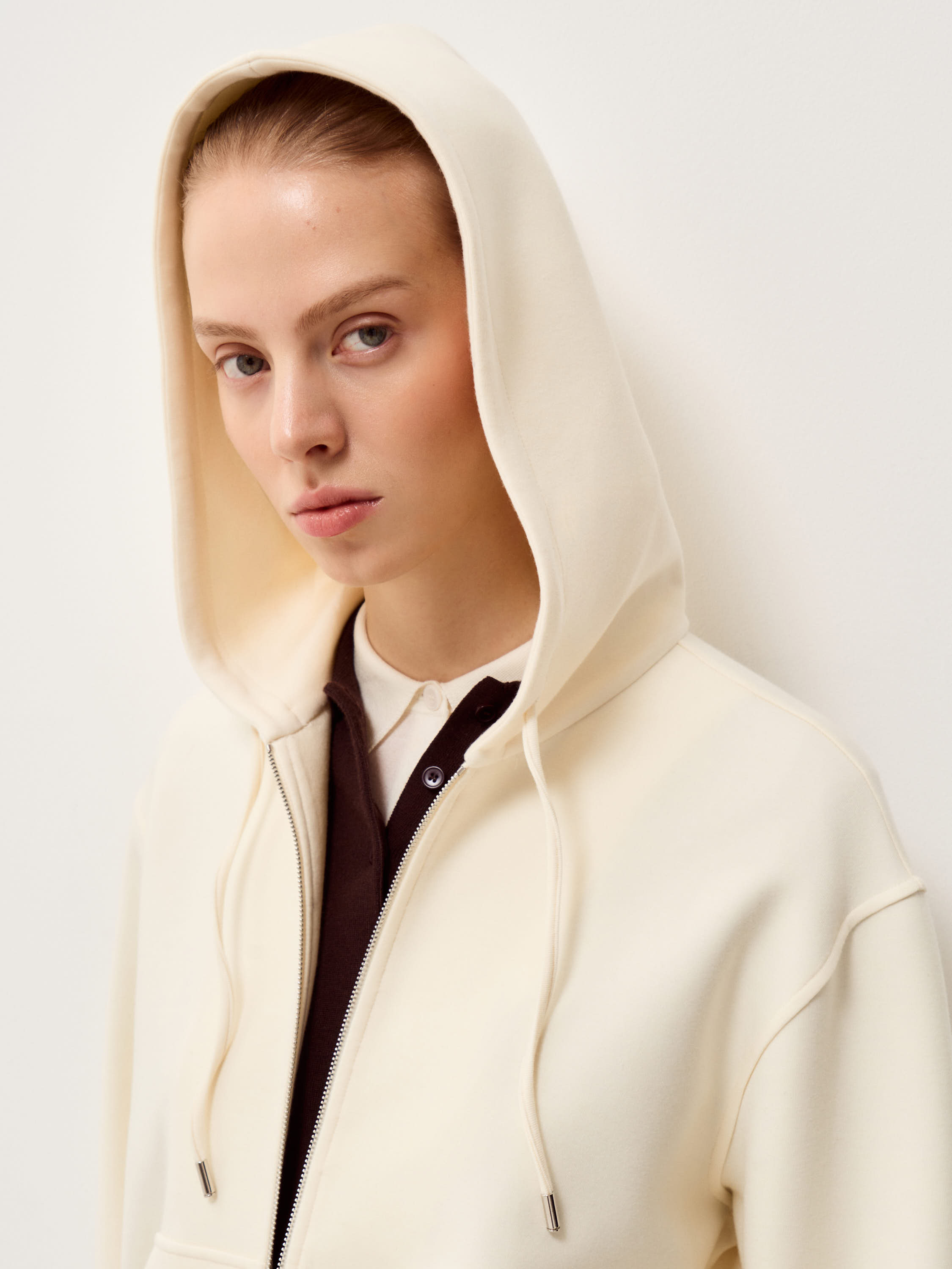 Худи на молнии выполнено из мягкого смесового полотна с высоким содержанием натуральных волокон. В основе — тенсел и шерсть, за счет чего материал приятный к телу, дышащий и комфортный в носке. Полотно гладкое, пластичное, хорошо держит форму и не выглядит тяжелым. Крой свободный, с объемным капюшоном и регулируемыми шнурами. По центру — аккуратно вшитая металлическая молния. Спереди расположен цельный карман-кенгуру. Манжеты и нижний край выполнены из уплотненной вязки, поэтому изделие аккуратно фиксируется и сохраняет форму. Оттенок светлый, с теплым подтоном, универсальный для повседневных сочетаний.