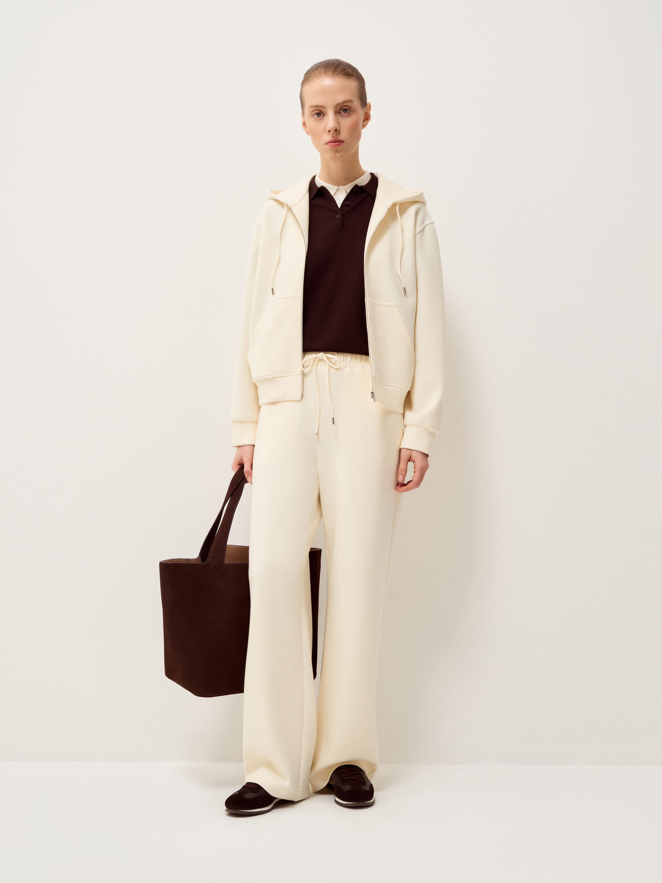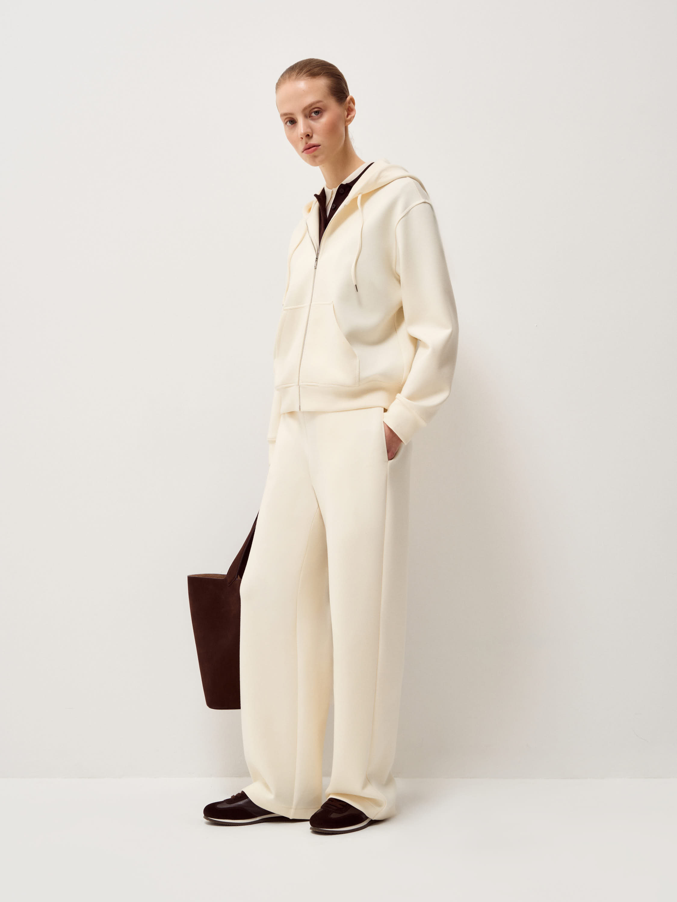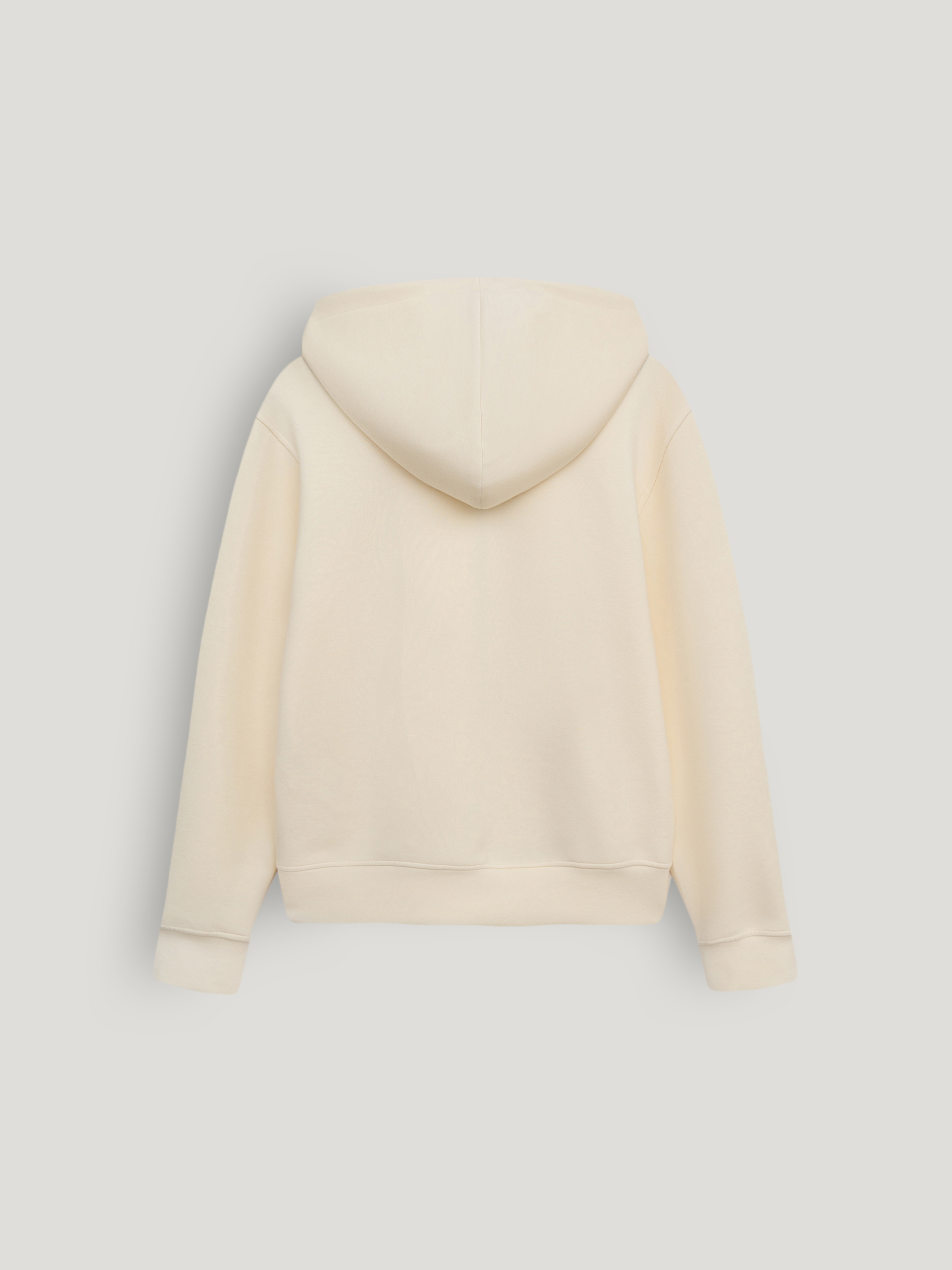Худи на молнии выполнено из мягкого смесового полотна с высоким содержанием натуральных волокон. В основе — тенсел и шерсть, за счет чего материал приятный к телу, дышащий и комфортный в носке. Полотно гладкое, пластичное, хорошо держит форму и не выглядит тяжелым. Крой свободный, с объемным капюшоном и регулируемыми шнурами. По центру — аккуратно вшитая металлическая молния. Спереди расположен цельный карман-кенгуру. Манжеты и нижний край выполнены из уплотненной вязки, поэтому изделие аккуратно фиксируется и сохраняет форму. Оттенок светлый, с теплым подтоном, универсальный для повседневных сочетаний.