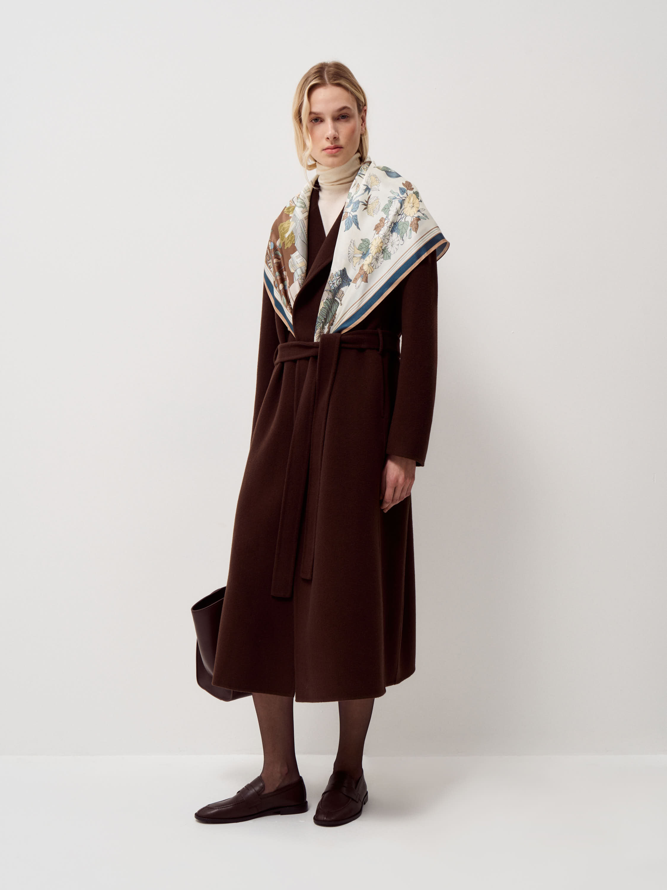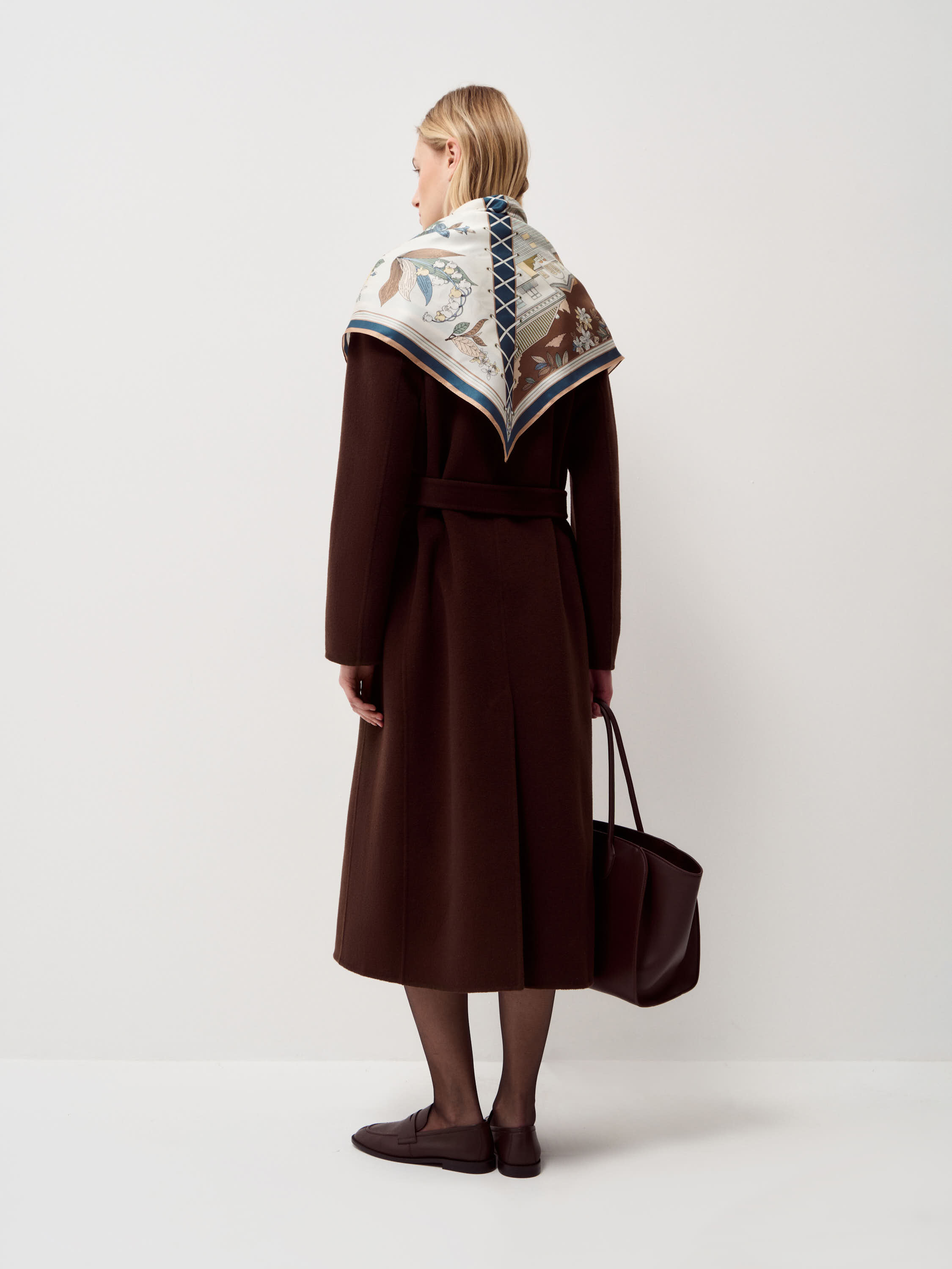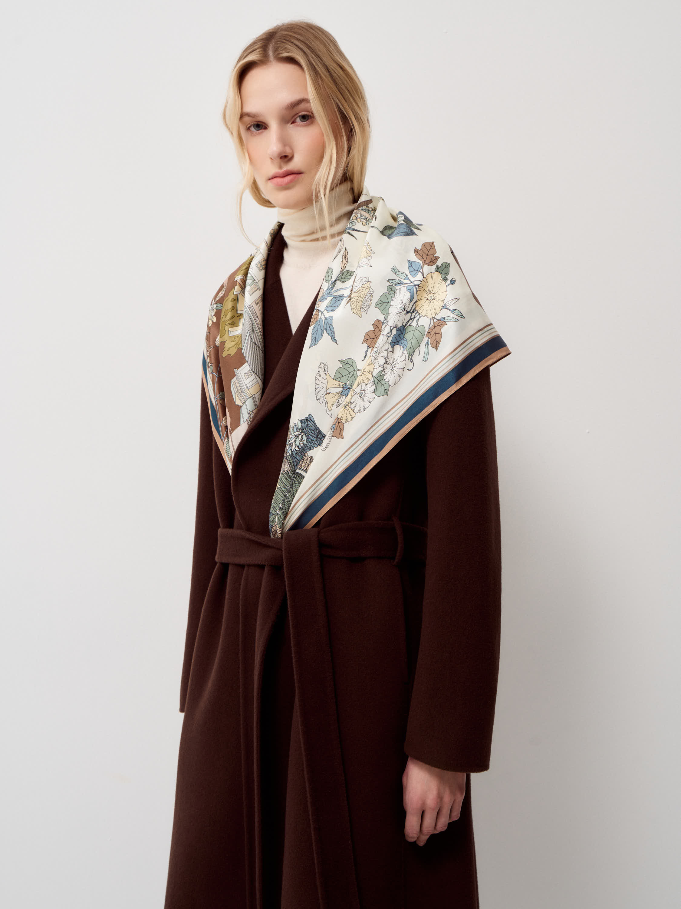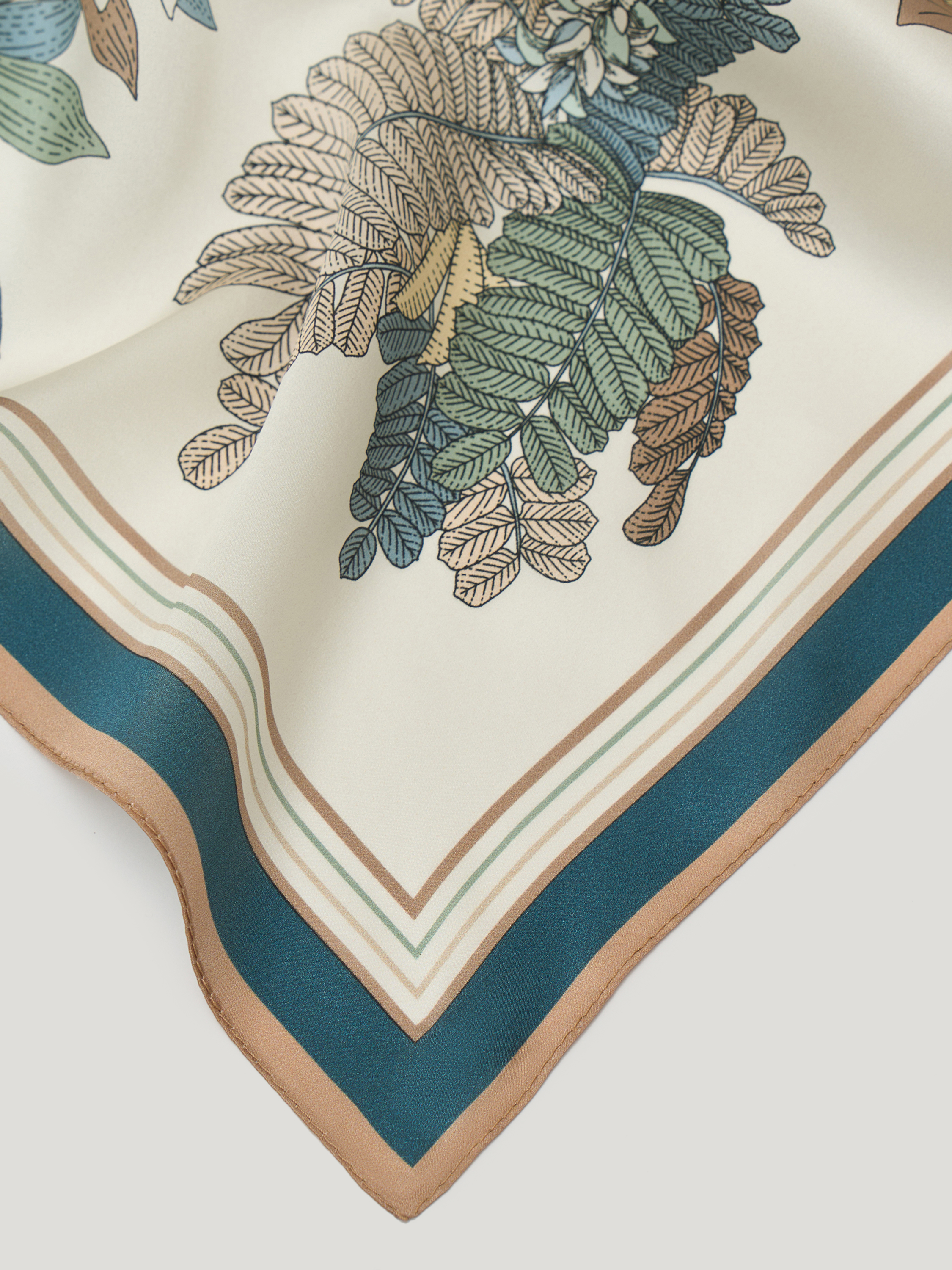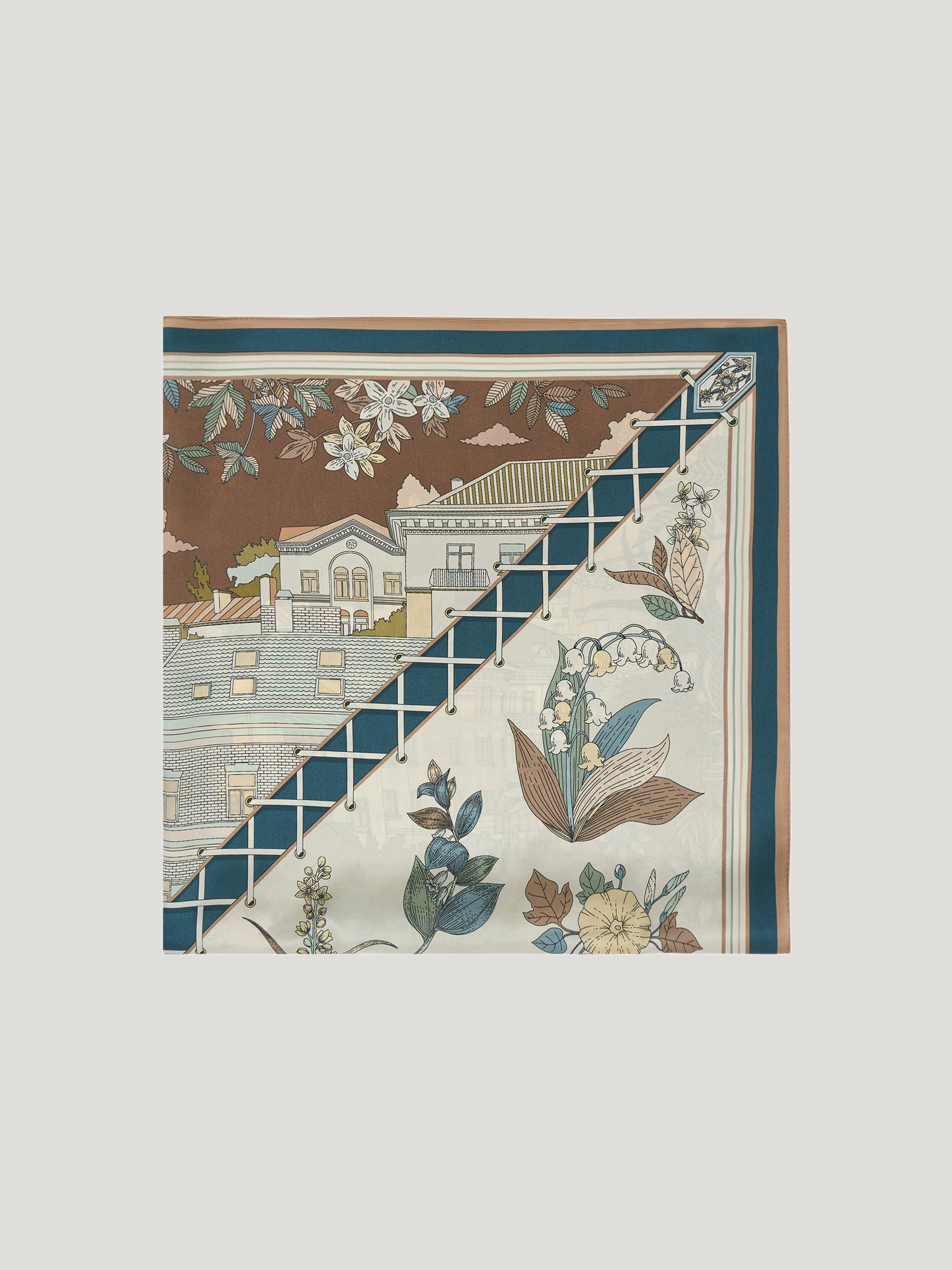 Шелковый платок с многоуровневым иллюстративным узором, выстроенным по принципу контраста сюжетов. Композиция разделена диагональю: одна часть посвящена архитектурному пейзажу с городскими фасадами, крышами и декоративными элементами, другая — ботаническим мотивам с детально прорисованными растениями и цветами. Палитра сложная и приглушенная: кремовый фон сочетается с оттенками теплого коричневого, пыльно-голубого, шалфейного зеленого и мягкого песочного. Кайма выполнена в более насыщенных тонах, аккуратно обрамляя рисунок и придавая композиции завершенность. Натуральный шелк гладкий, тонкий и пластичный, красиво драпируется и комфортен в носке, позволяя использовать платок как акцент в повседневных и более собранных образах.