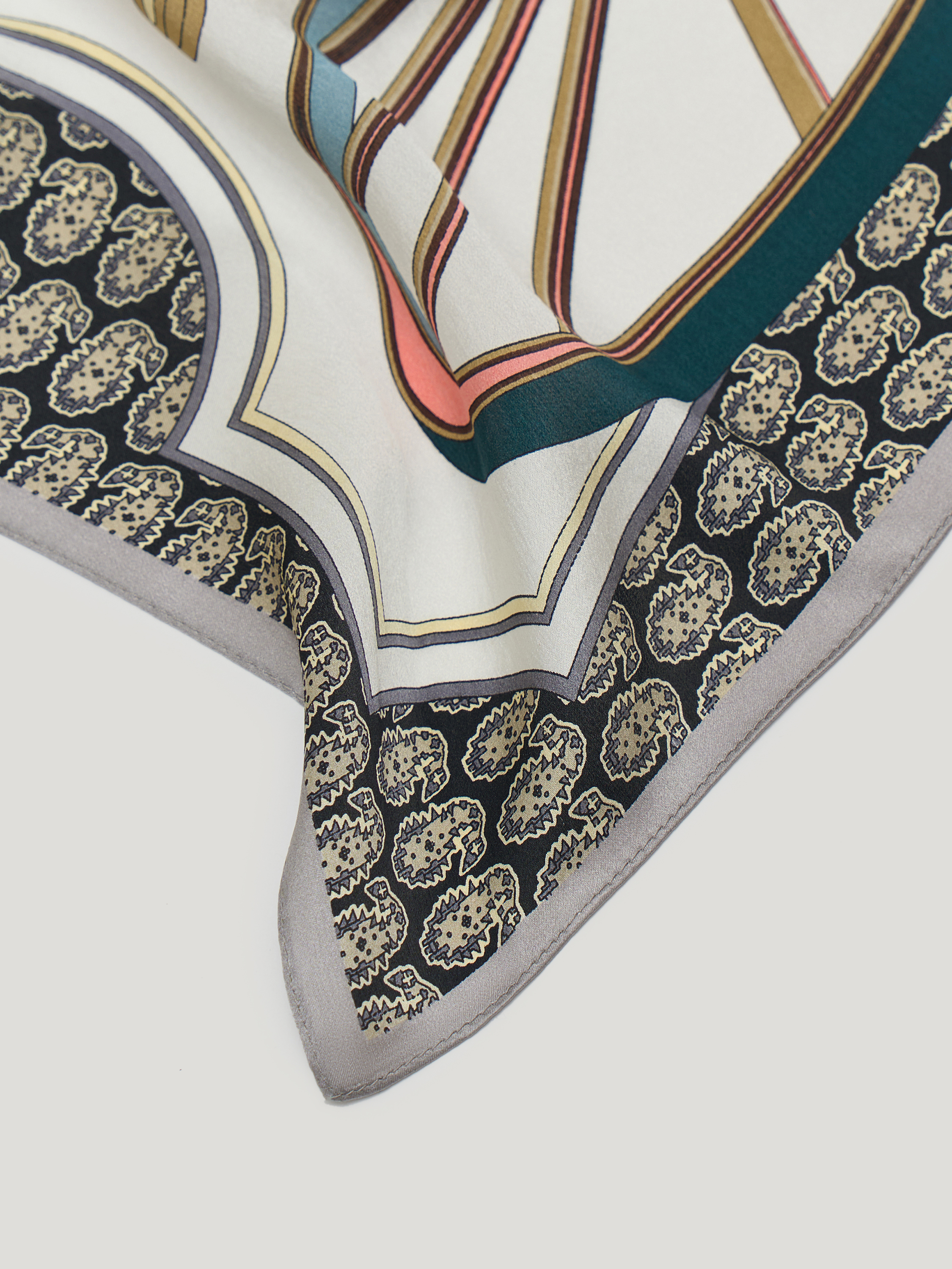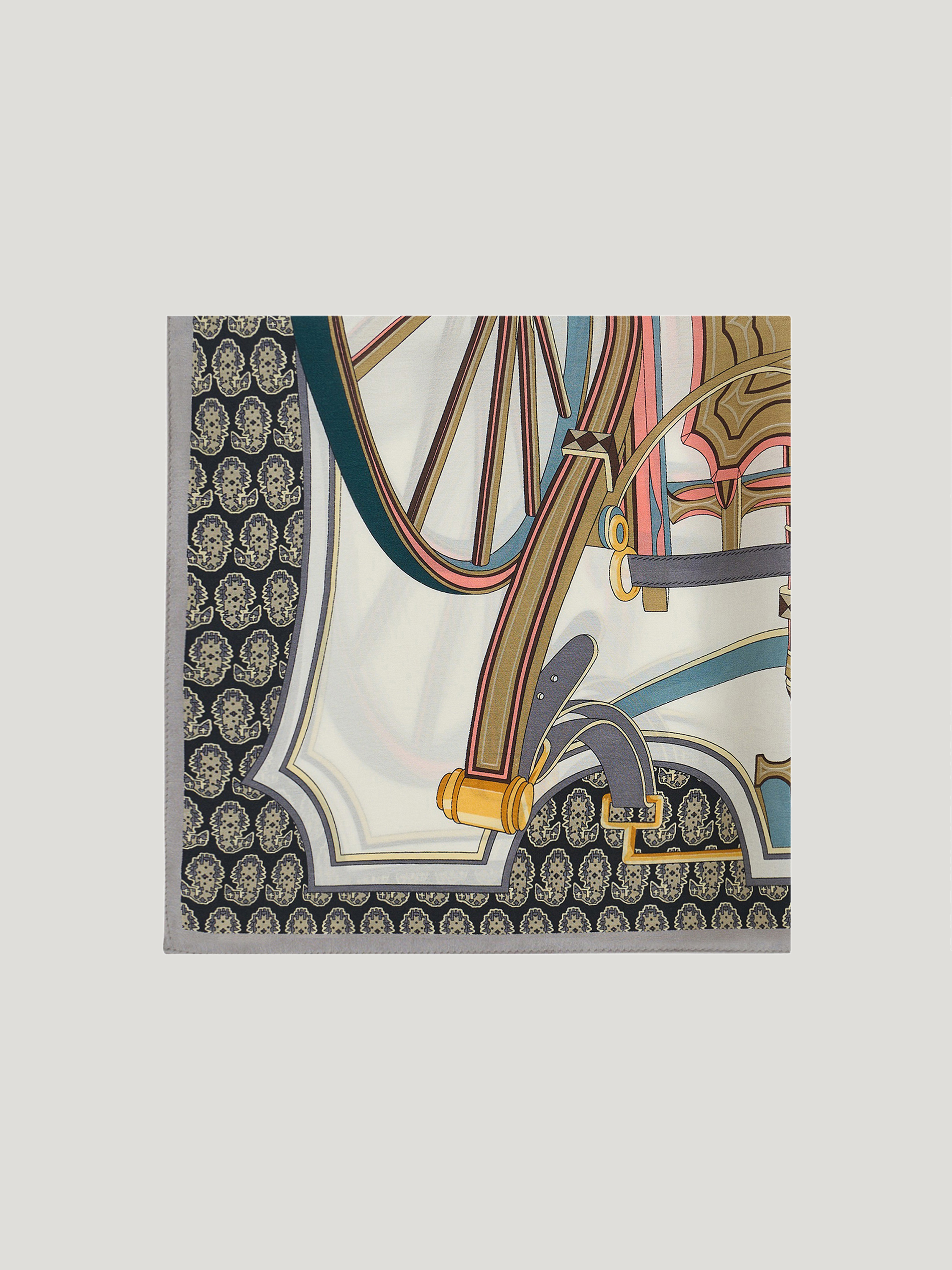 Шелковый платок выполнен из натурального шелка с гладкой, тонкой и прохладной поверхностью. Материал мягкий и деликатный к коже, хорошо драпируется, дает ровный благородный блеск и сохраняет комфорт в разную погоду. Принт с конной тематикой и деталями упряжи выполнен в сдержанной палитре: молочный и кремовый фон, оттенки бежевого и теплого коричневого с акцентами приглушенного голубого и графитового. Шелк гигроскопичен, не накапливает статическое электричество, отличается износостойкостью при бережном уходе и сохраняет аккуратный внешний вид. Платок подходит для ношения на шею или на голову, добавляя образу аккуратный, выверенный акцент.