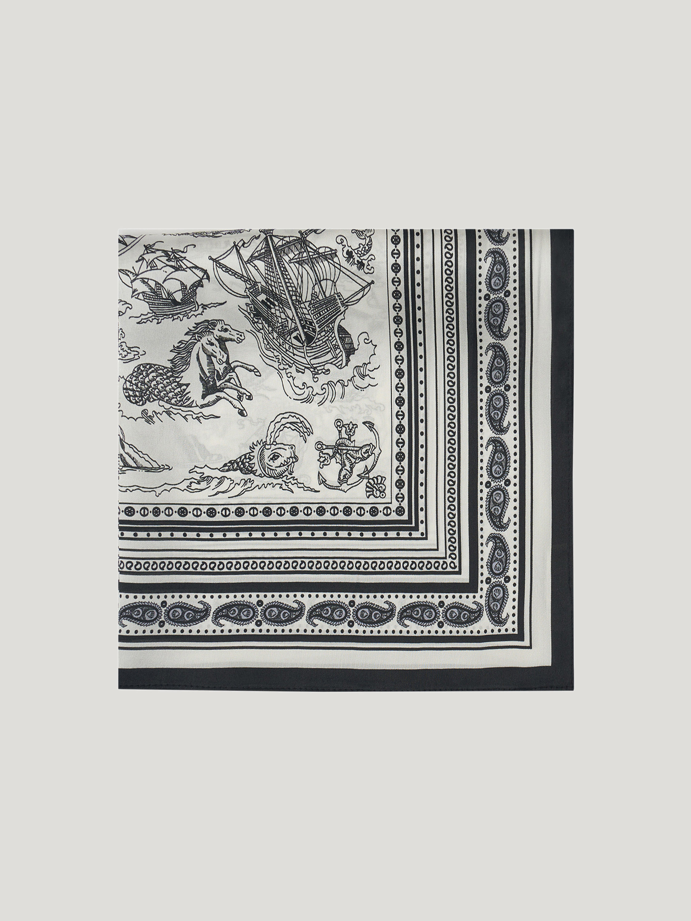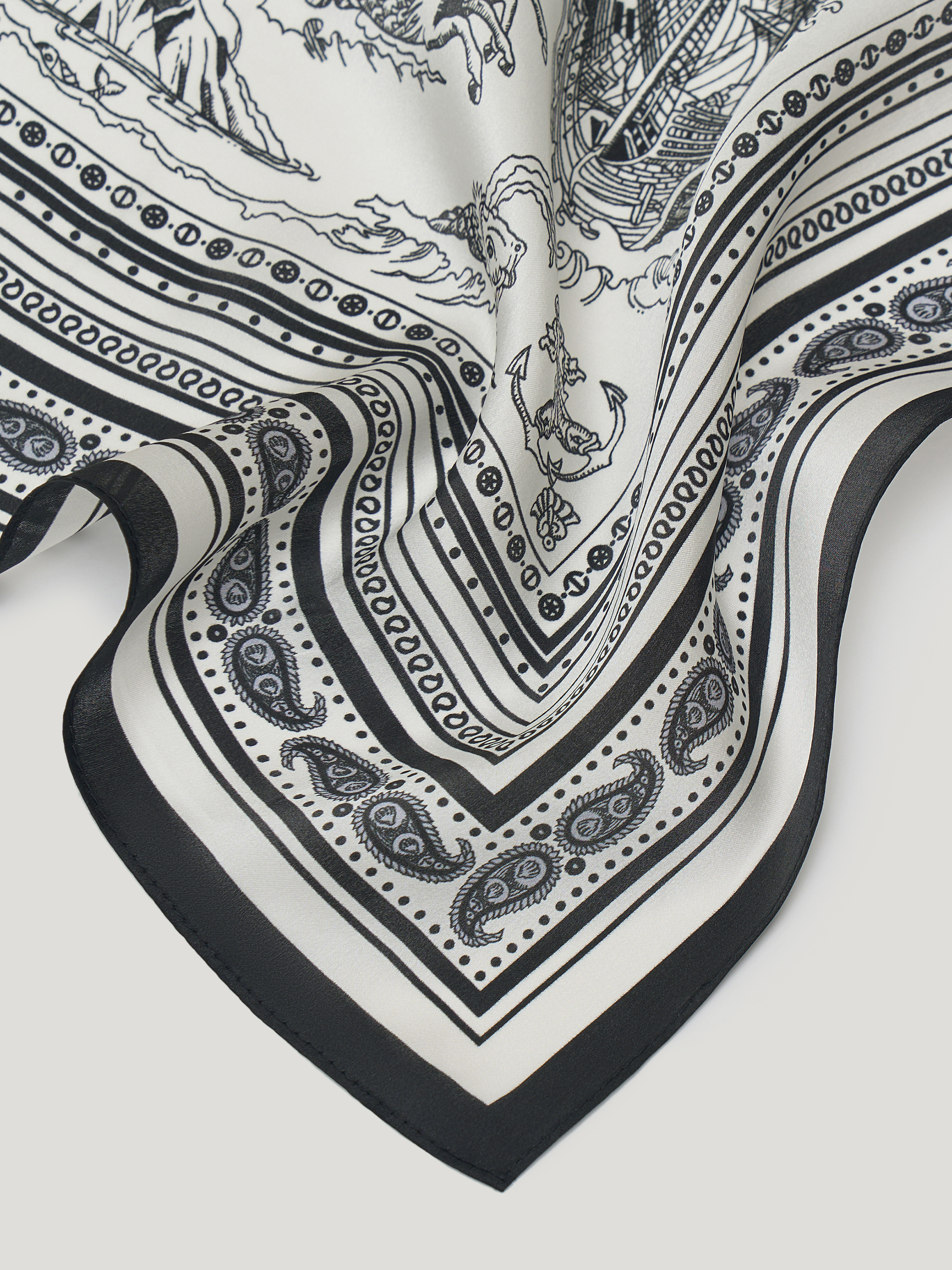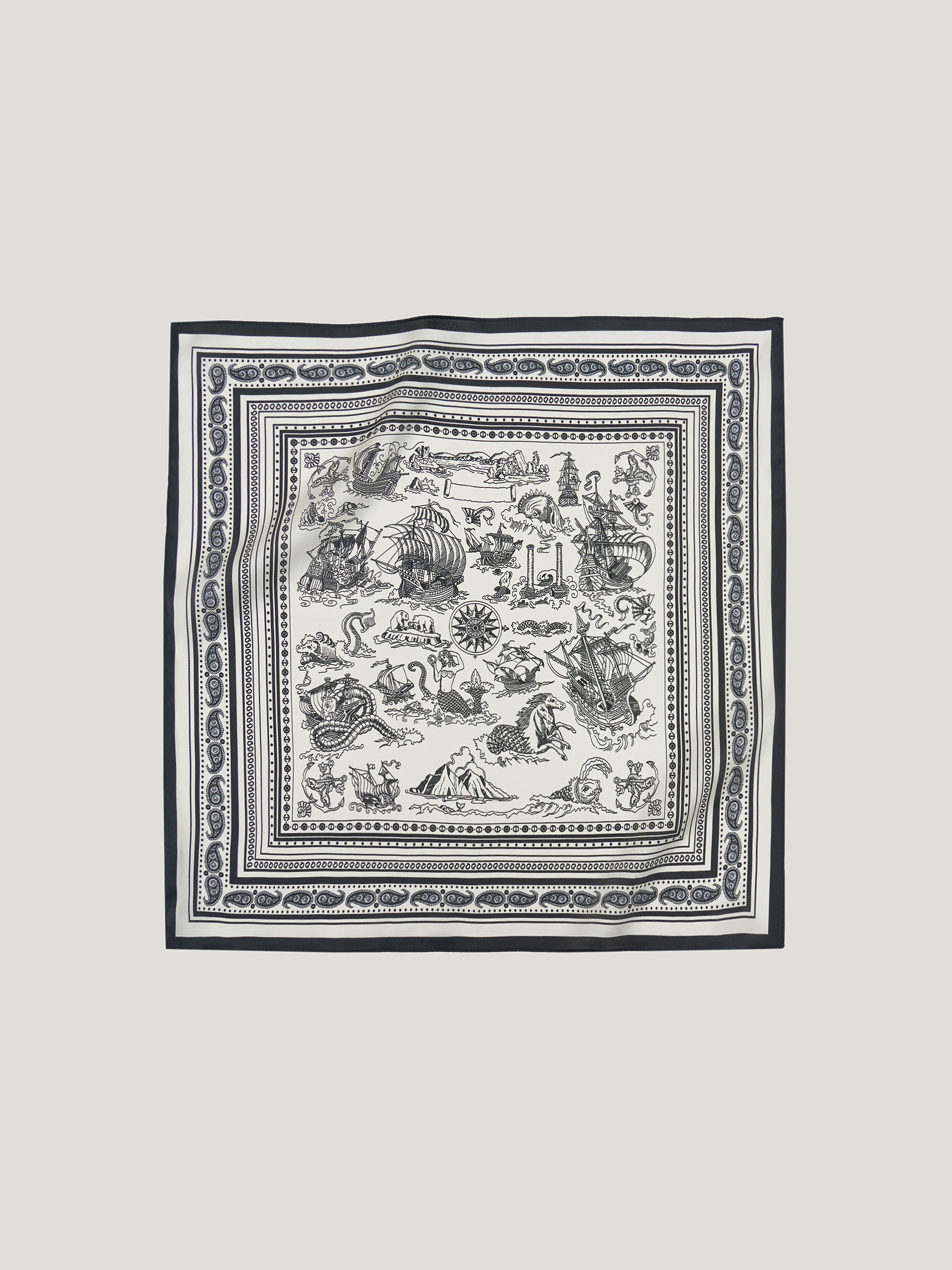 Шелковый платок выполнен из натурального шелка с гладкой, прохладной поверхностью и мягким благородным блеском. Материал тонкий, пластичный, комфортный для кожи, хорошо драпируется и сохраняет аккуратный вид при носке. Рисунок вдохновлен морскими странствиями и легендами: парусные корабли, фантастические существа, роза ветров и декоративные мотивы выстроены в детализированную, графичную композицию. Цветовая гамма монохромная, в контрасте черного и молочного, с орнаментальным кантом по краю, что подчеркивает винтажный характер рисунка. Платок подходит для ношения на шее, на голове или как акцентный аксессуар — на поясе, сумке или через плечо.