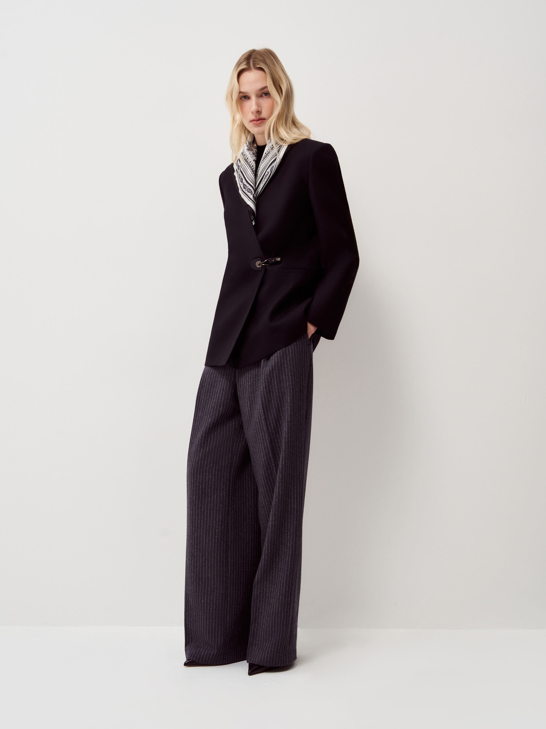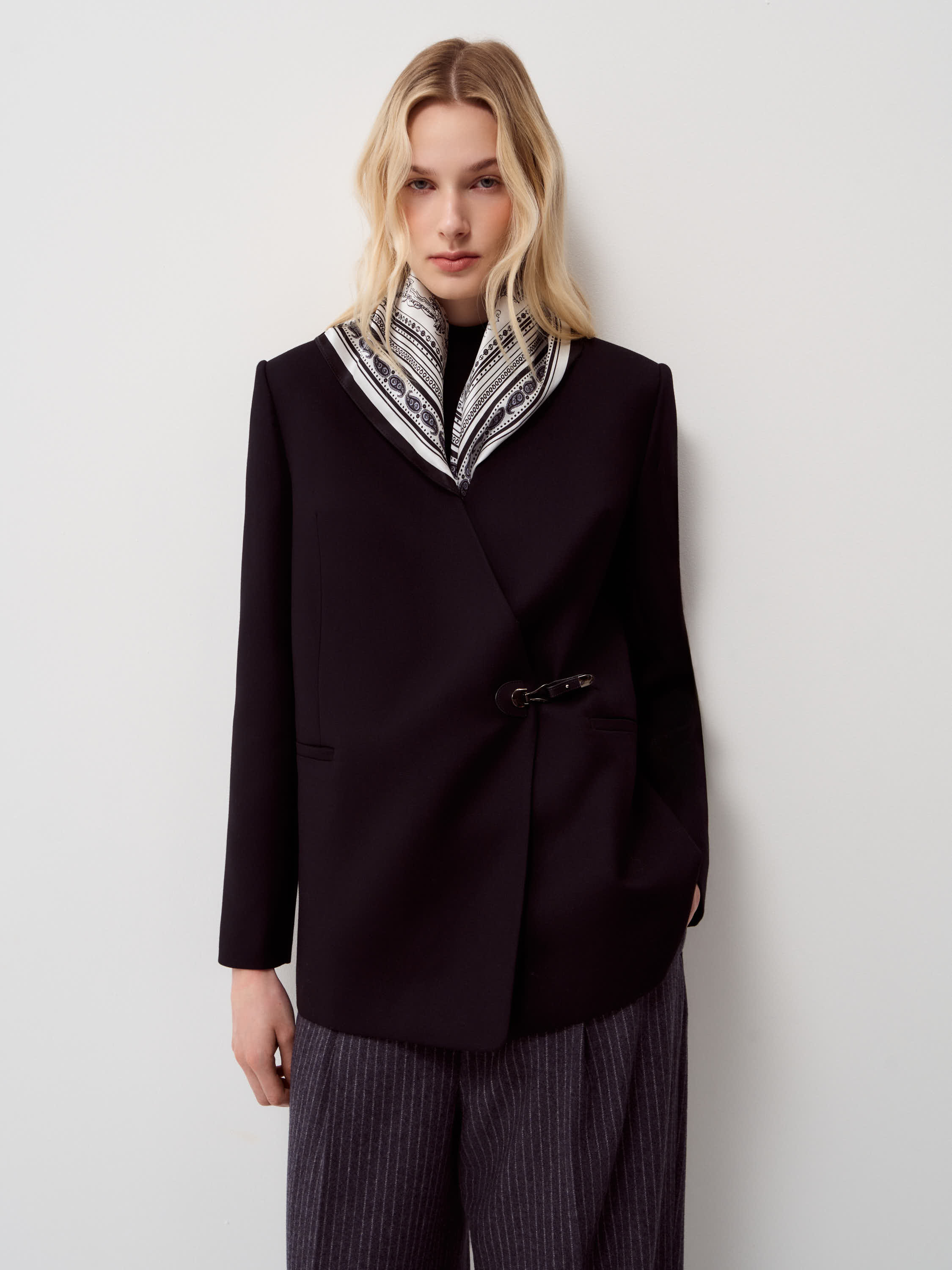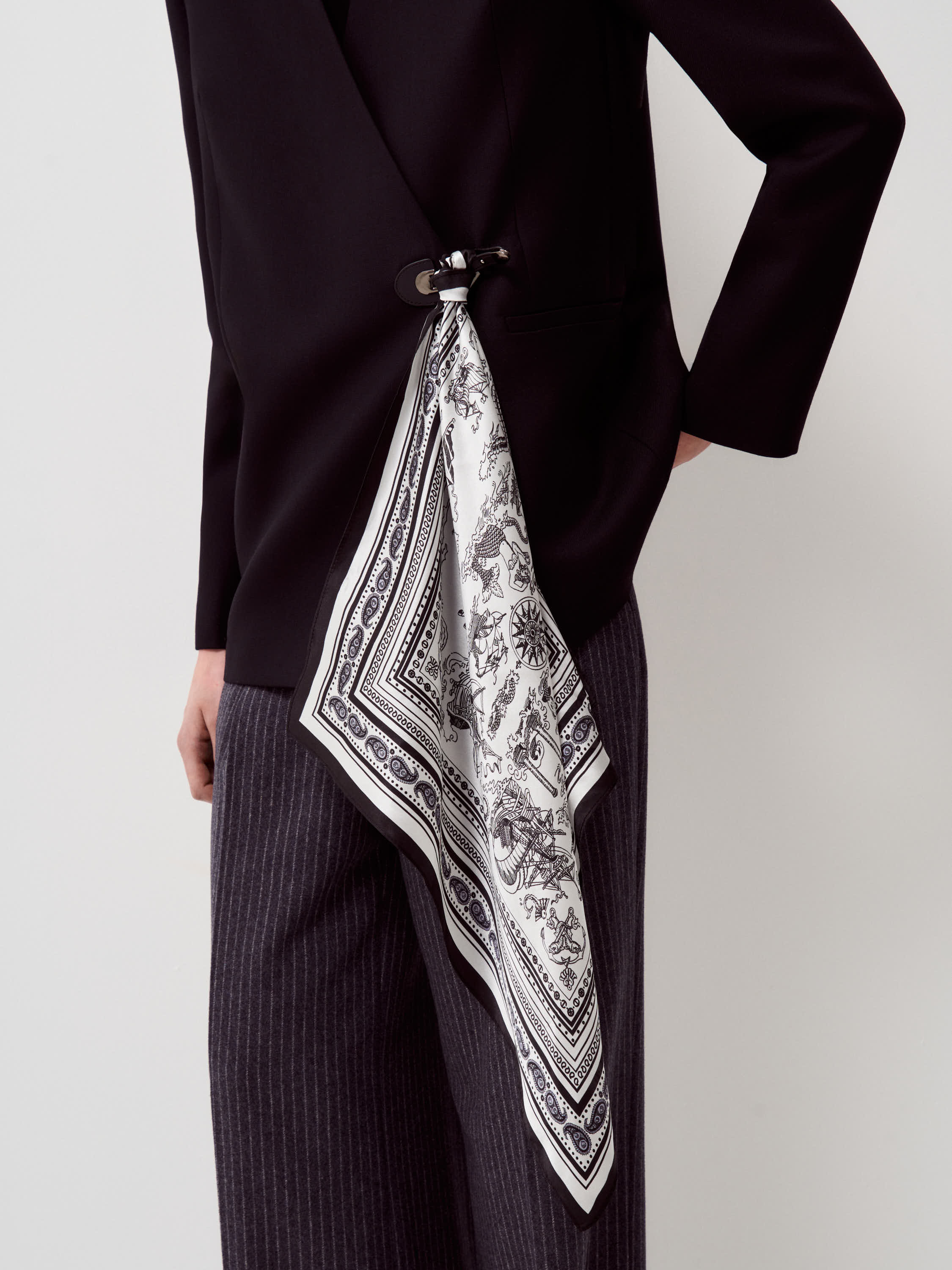 Шелковый платок выполнен из натурального шелка с гладкой, прохладной поверхностью и мягким благородным блеском. Материал тонкий, пластичный, комфортный для кожи, хорошо драпируется и сохраняет аккуратный вид при носке. Рисунок вдохновлен морскими странствиями и легендами: парусные корабли, фантастические существа, роза ветров и декоративные мотивы выстроены в детализированную, графичную композицию. Цветовая гамма монохромная, в контрасте черного и молочного, с орнаментальным кантом по краю, что подчеркивает винтажный характер рисунка. Платок подходит для ношения на шее, на голове или как акцентный аксессуар — на поясе, сумке или через плечо.