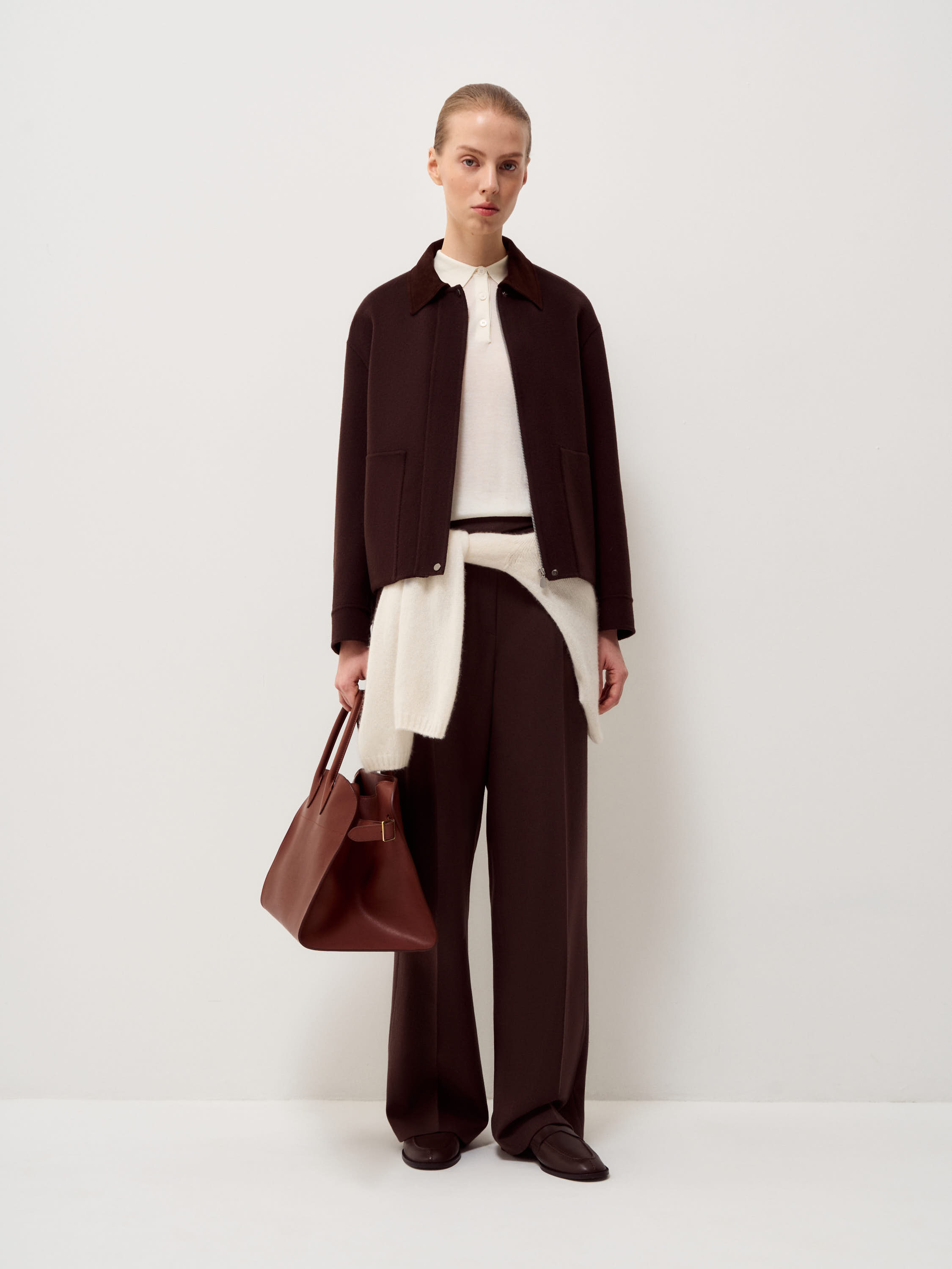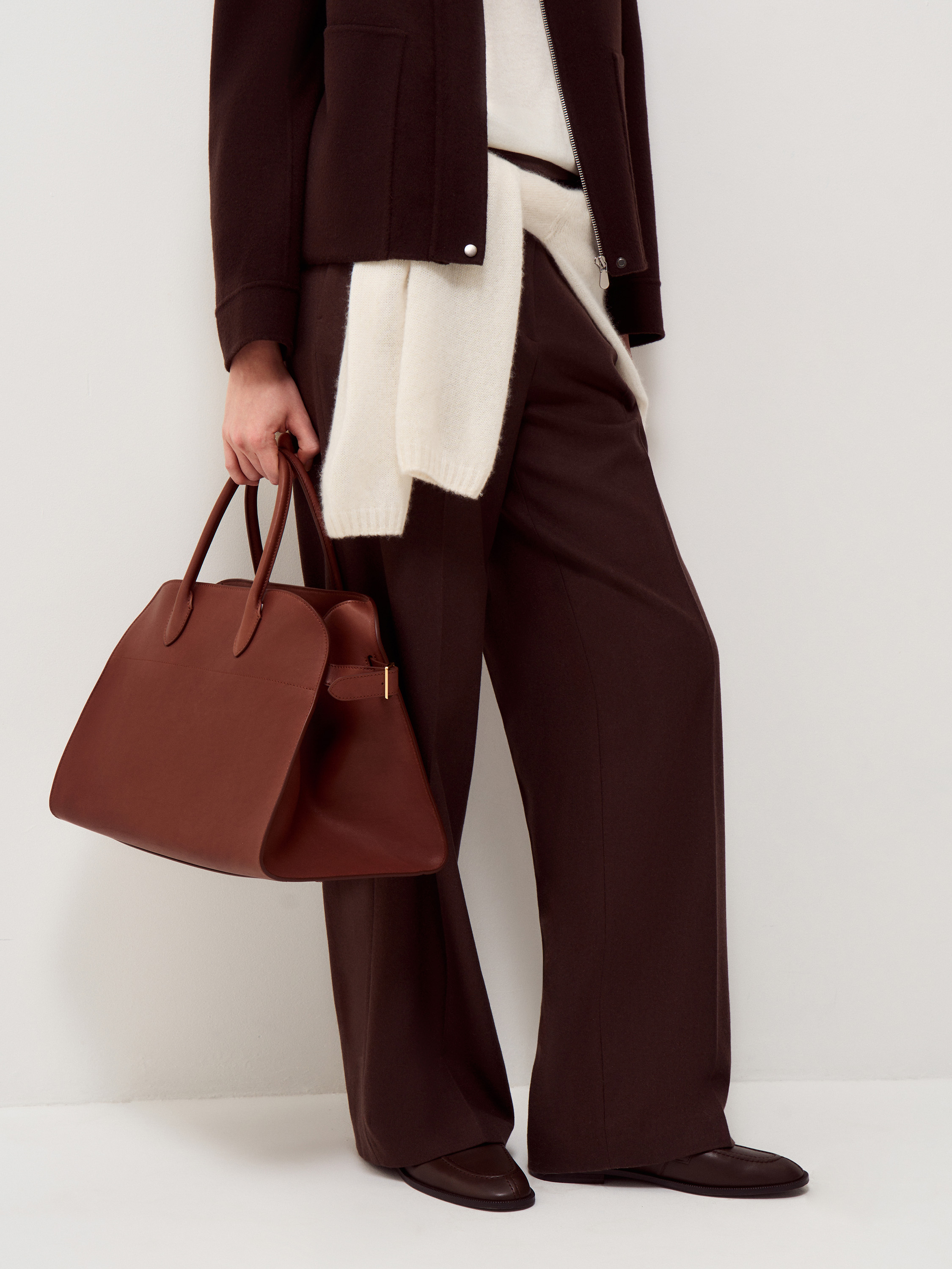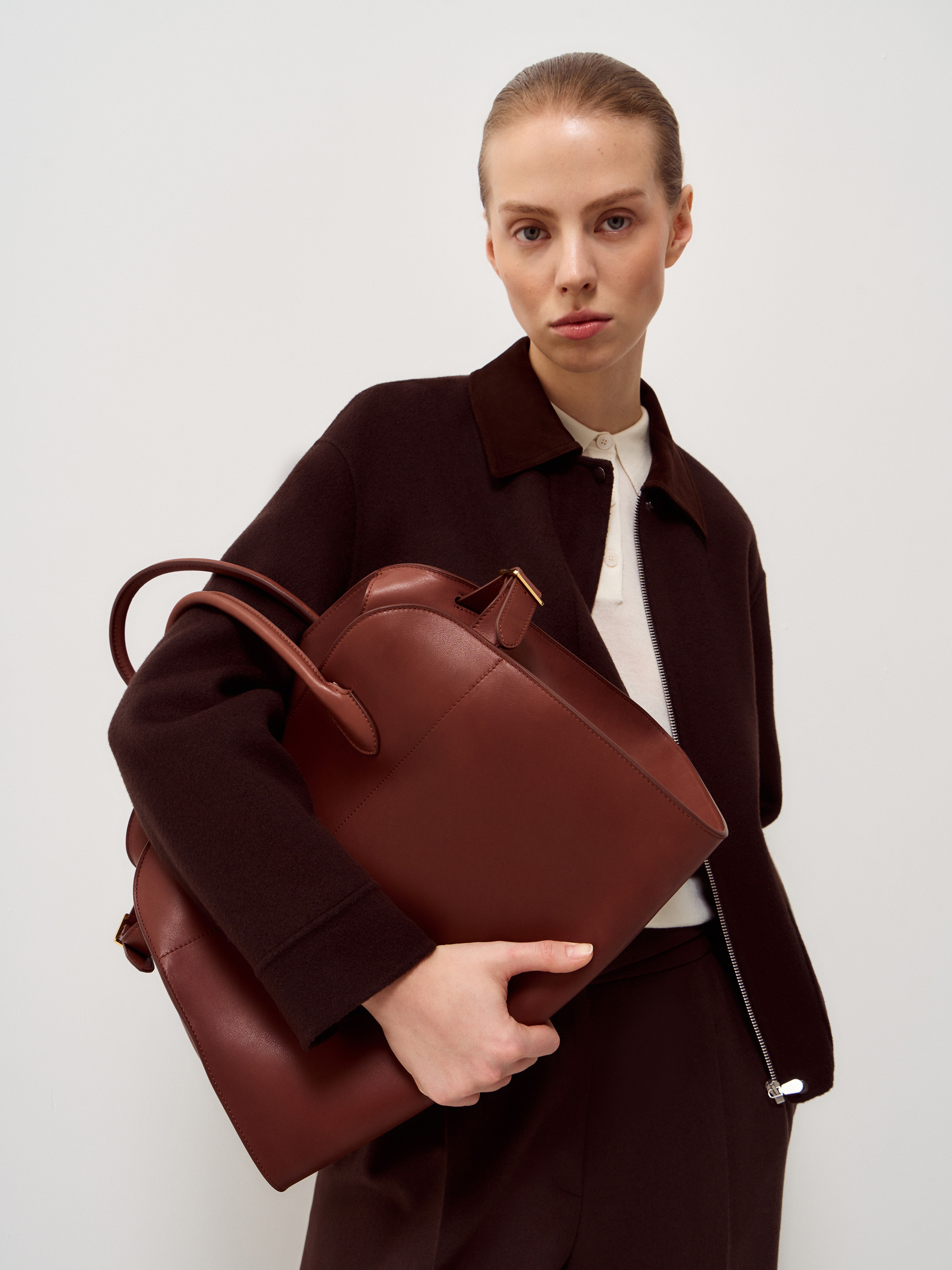 Сумка выполнена из гладкой кожи в теплом карамельно-коньячном оттенке с мягким матовым финишем. Форма трапециевидная, с четко выстроенной геометрией и устойчивым основанием, благодаря чему модель сохраняет структуру и аккуратный объем. Две округлые ручки средней длины позволяют носить сумку в руке или на сгибе локтя, боковые клинья добавляют вместительность, а лаконичная фурнитура в золотистом тоне поддерживает сдержанный характер изделия. Конструкция без лишнего декора подчеркивает фактуру кожи и чистоту линий, делая сумку универсальной для повседневных и более собранных сочетаний.