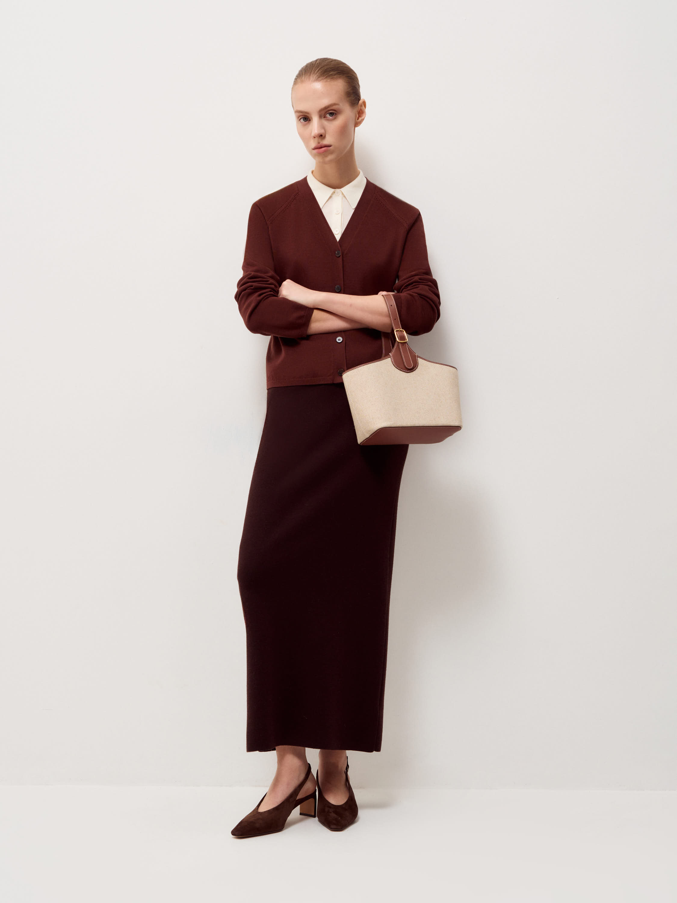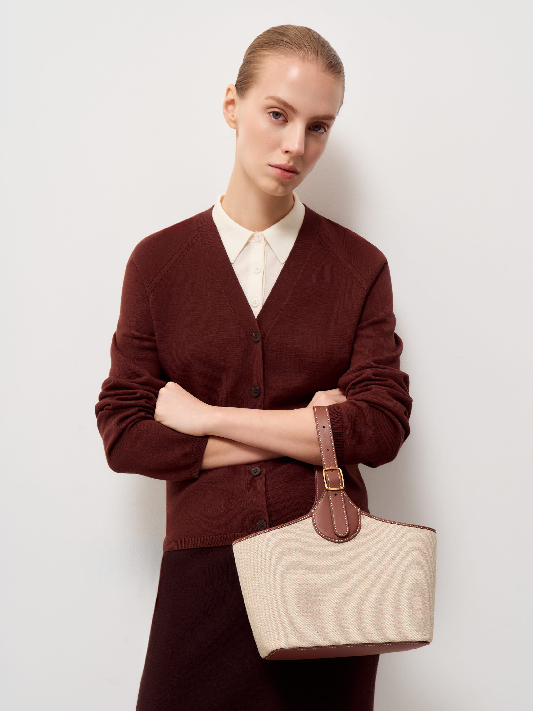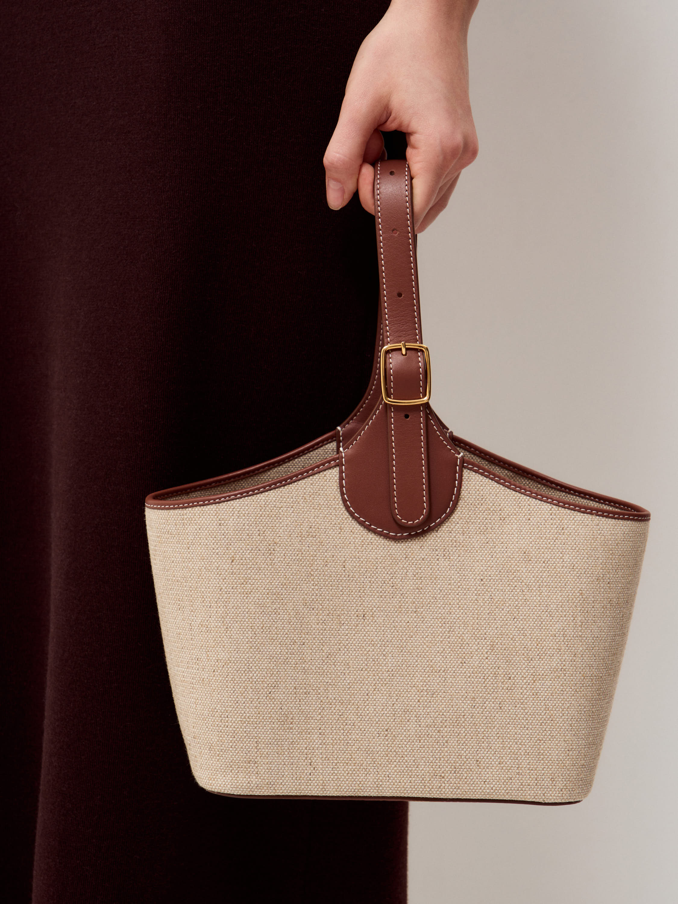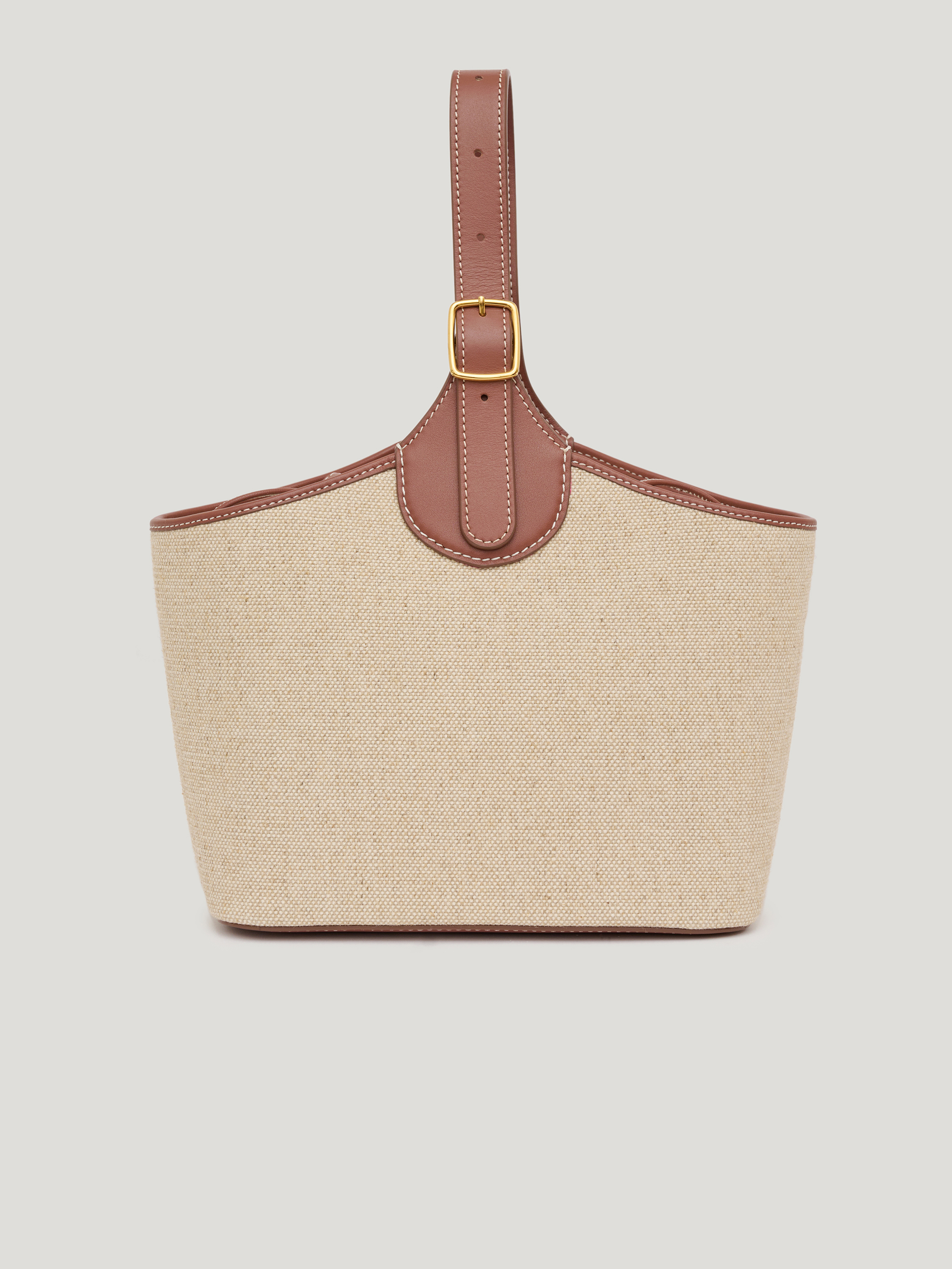 Сумка с вставным мешком из натуральной кожи и льна. Внешний корпус выполнен из плотного льна с естественной фактурой, верхний кант, ручка и отделка — из гладкой кожи теплого коричневого оттенка. Формат компактный, с устойчивым основанием и мягко расширяющимися боковыми сторонами. Внутри — съемный льняной мешок светлого бежевого цвета с кулиской, который фиксируется внутри и обеспечивает аккуратное хранение вещей. Кожаная ручка регулируется по длине. Модель сочетает фактурность льна и плотность кожи, сохраняя форму и четкость линий.