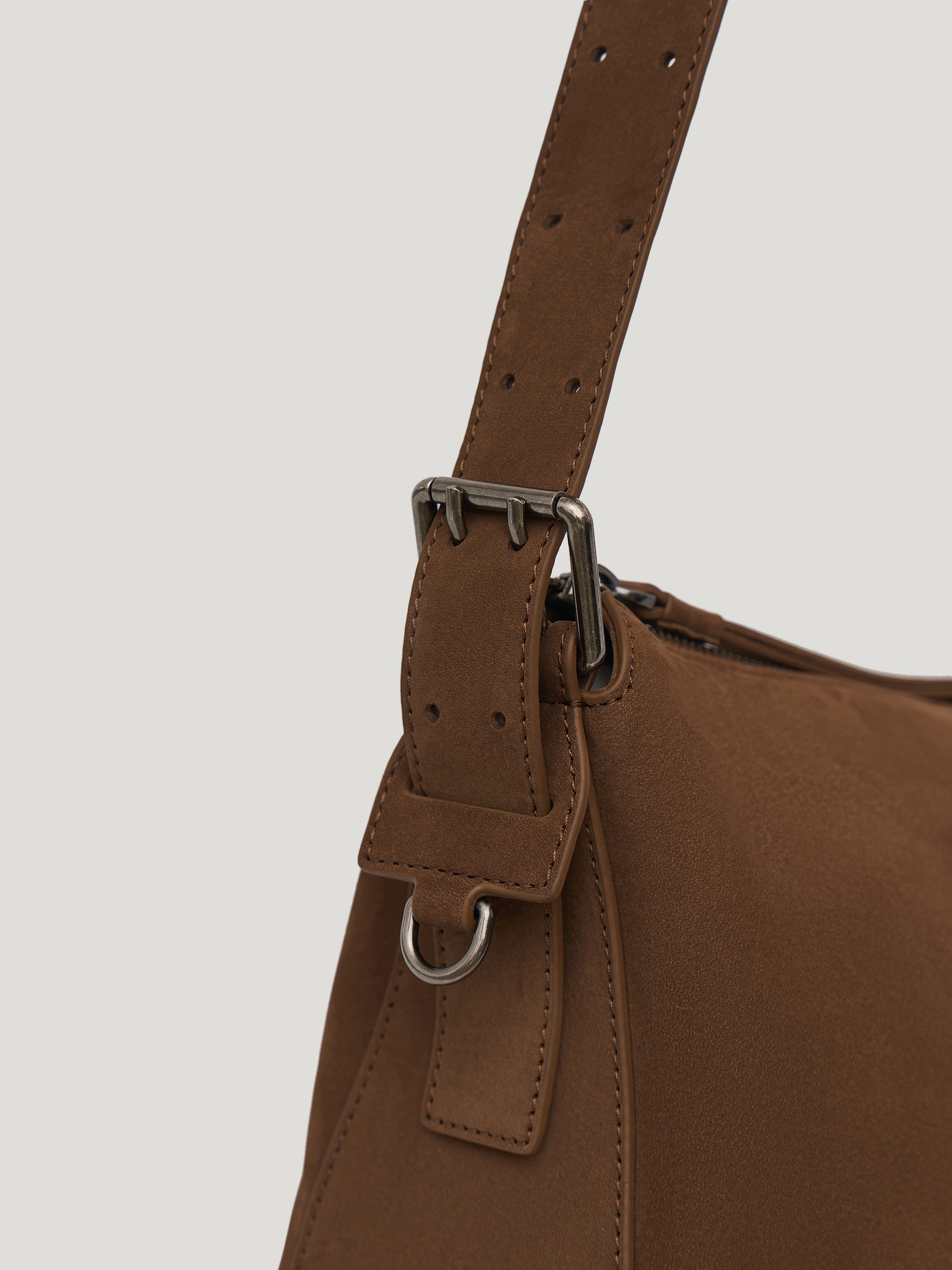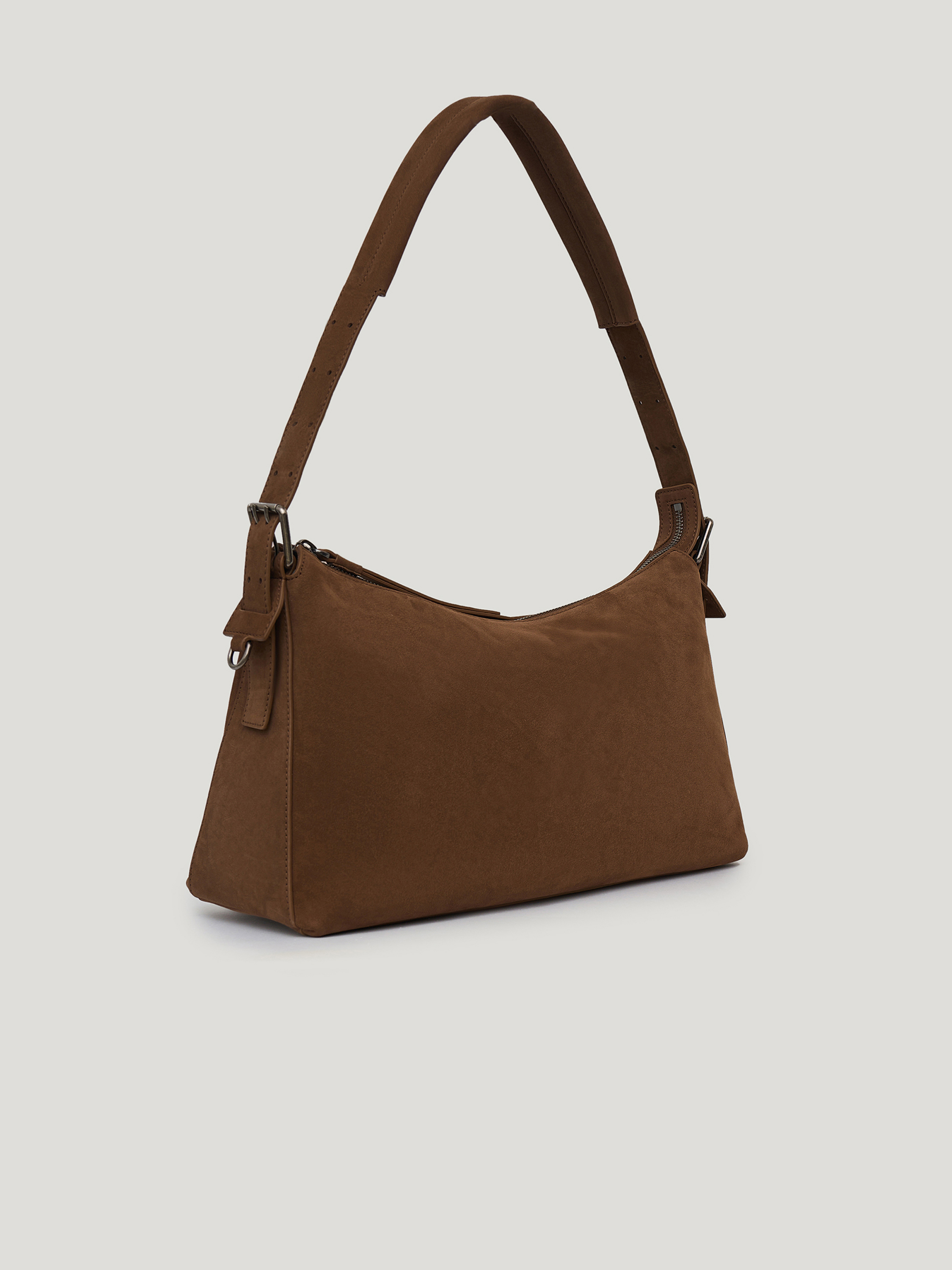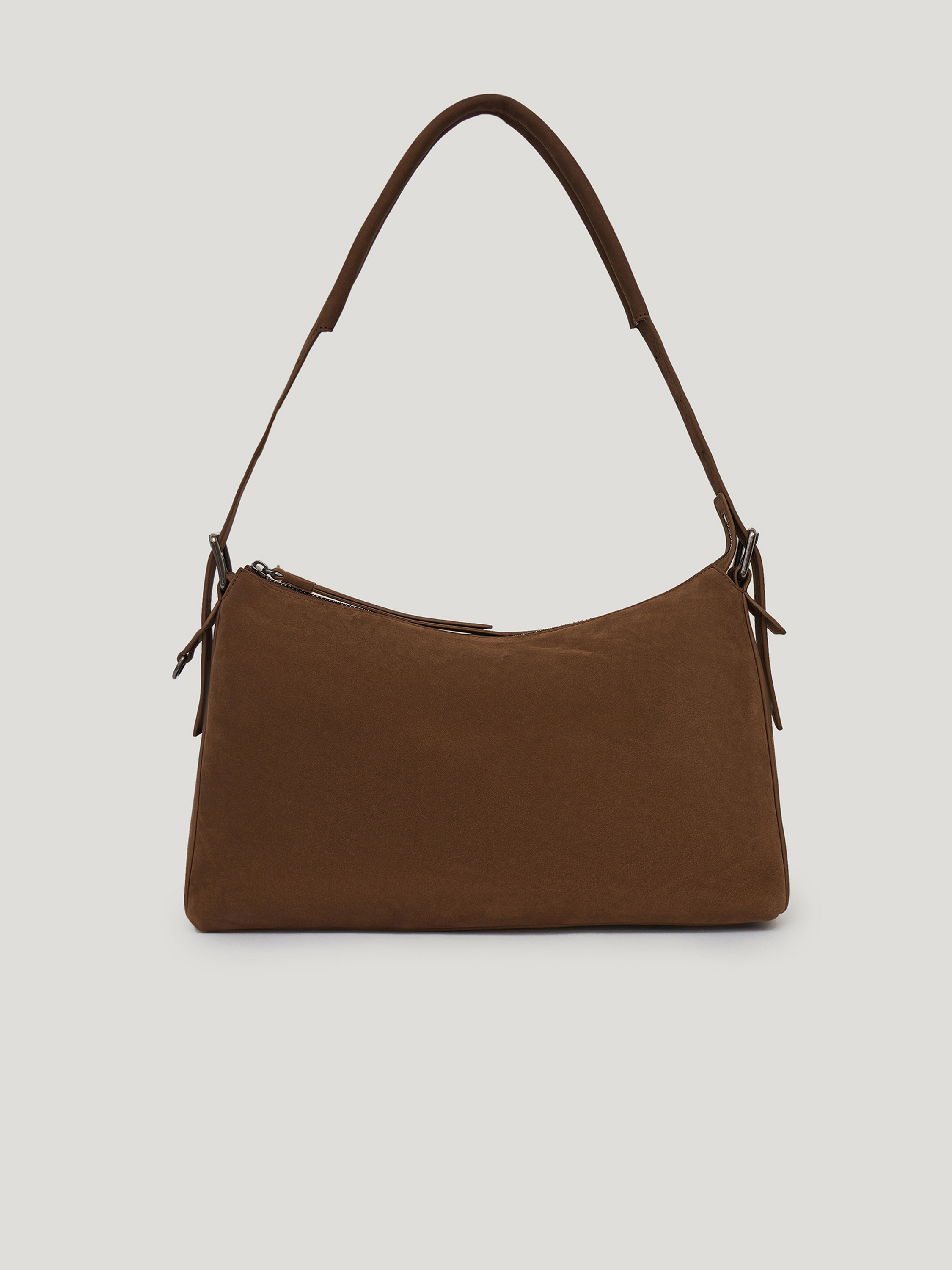 Сумка вытянутой формы с мягкой, пластичной конструкцией и скругленными линиями. Удлиненная ручка позволяет носить модель на плече, создавая более расслабленный силуэт, при этом форма остается собранной за счет аккуратной посадки. Основное отделение закрывается на молнию, боковые крепления с ремешками добавляют функциональный акцент. Минималистичный дизайн без лишних деталей делает модель универсальной для повседневных сочетаний. Выполнена из натуральной замши с бархатистой фактурой, которая придает поверхности глубину и мягкий матовый эффект. Оттенок темного шоколада вписывается в базовый гардероб и сочетается с нейтральной и насыщенной палитрой.
