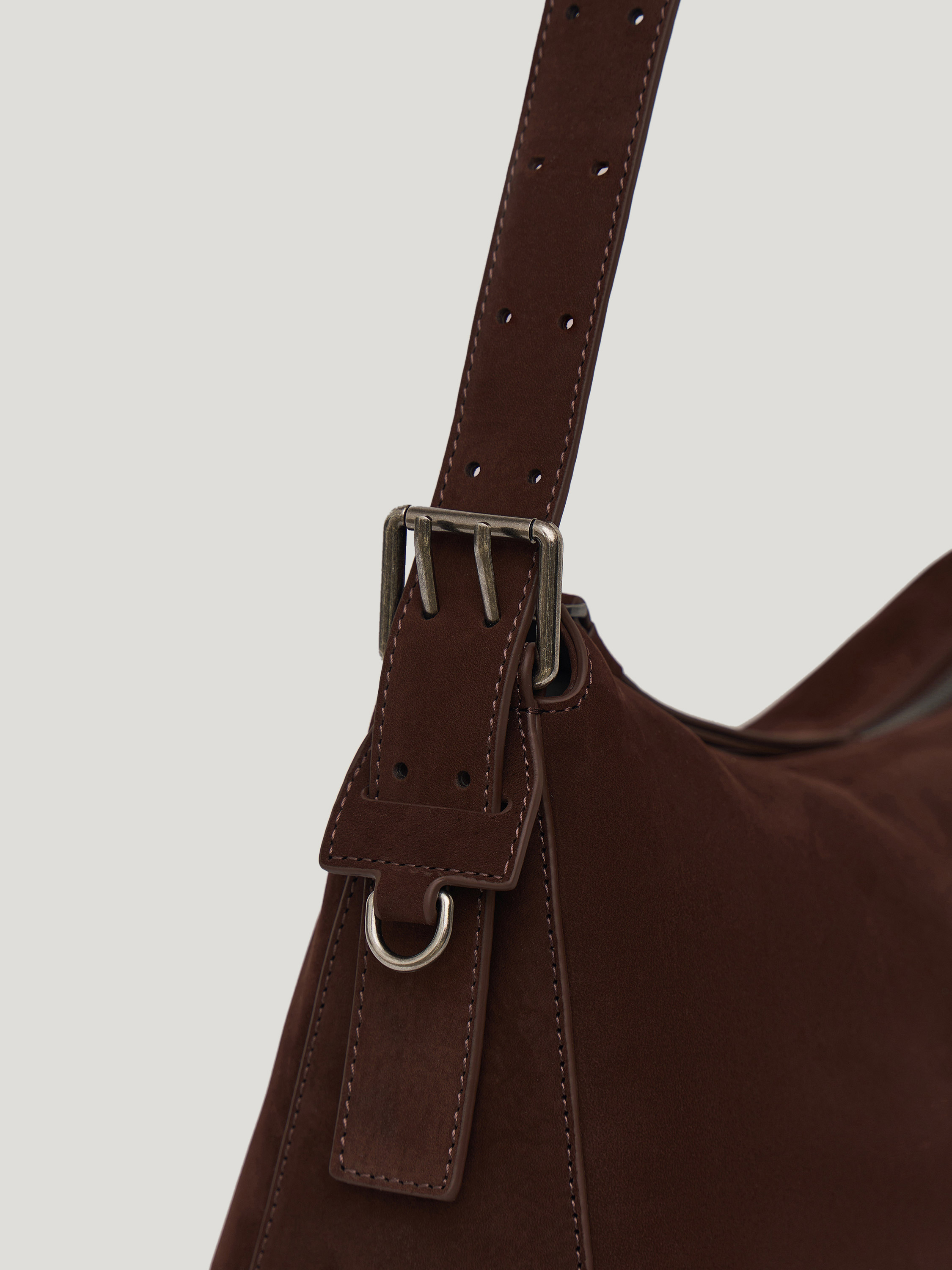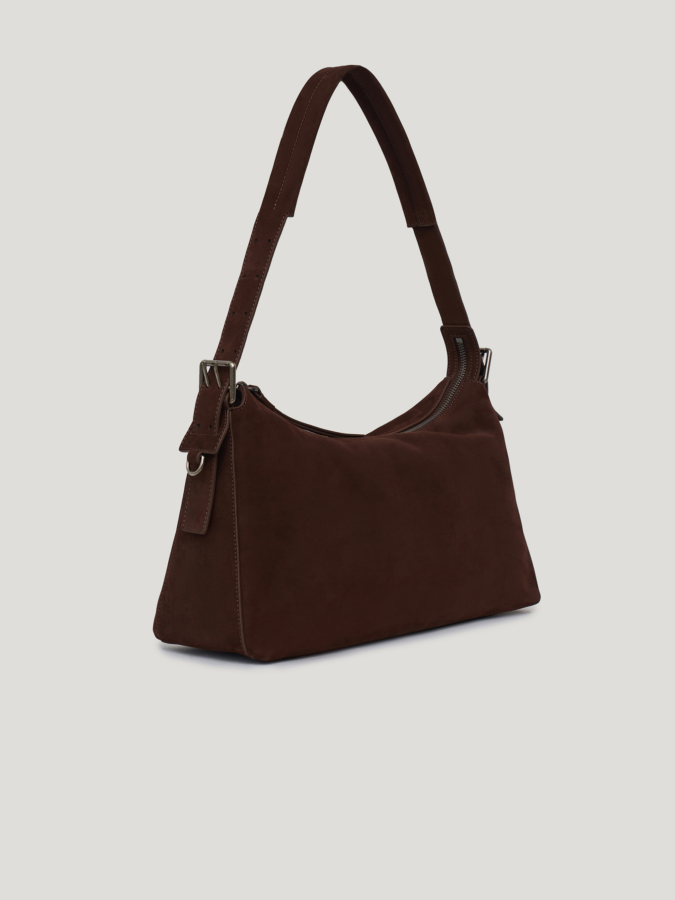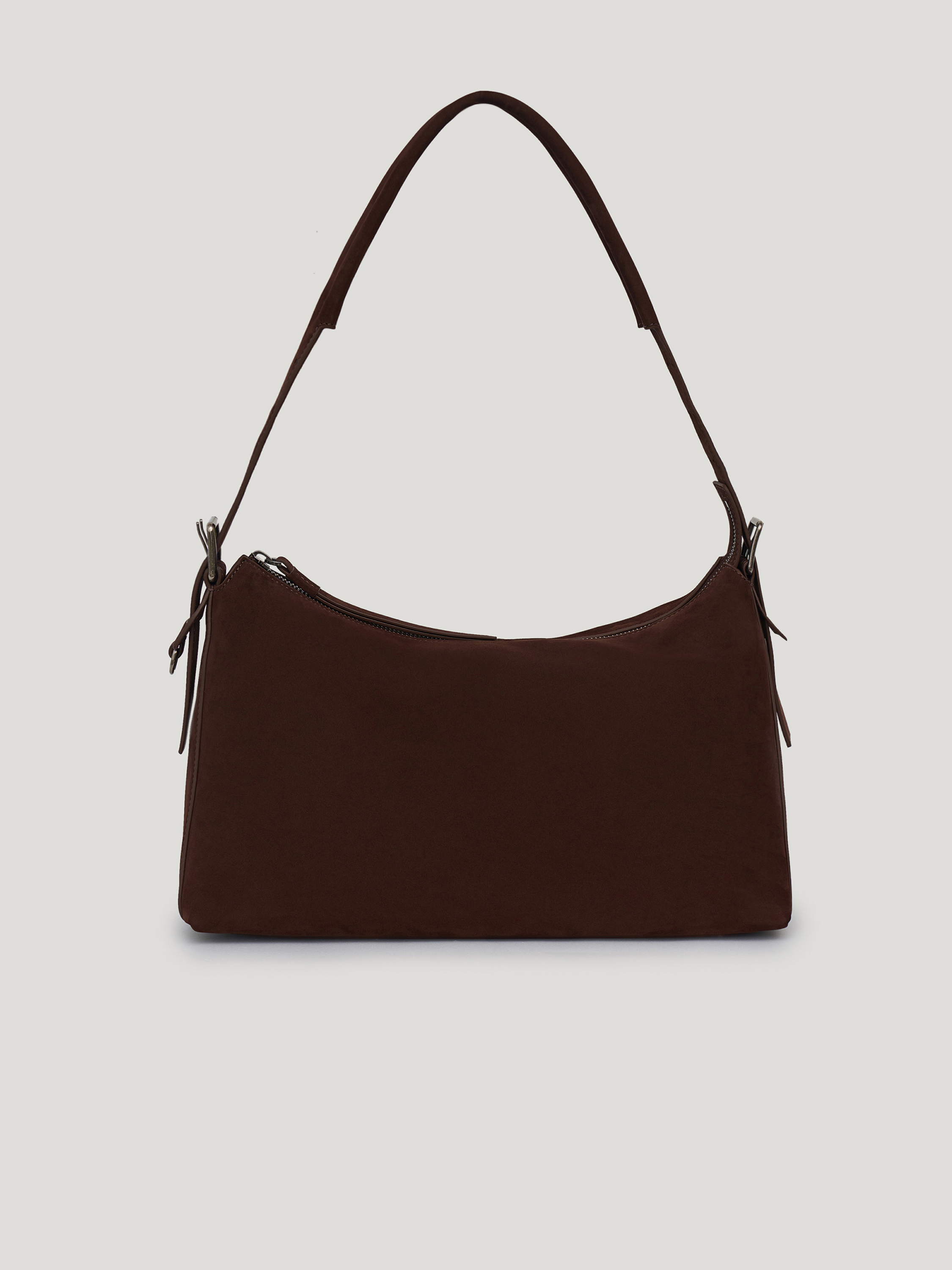 Сумка вытянутой формы с мягкой, пластичной конструкцией и скругленными линиями. Удлиненная ручка позволяет носить модель на плече, создавая более расслабленный силуэт, при этом форма остается собранной за счет аккуратной посадки. Основное отделение закрывается на молнию, боковые крепления с ремешками добавляют функциональный акцент. Минималистичный дизайн без лишних деталей делает модель универсальной для повседневных сочетаний. Выполнена из натуральной замши с бархатистой фактурой, которая придает поверхности глубину и мягкий матовый эффект. Оттенок темного шоколада вписывается в базовый гардероб и сочетается с нейтральной и насыщенной палитрой.