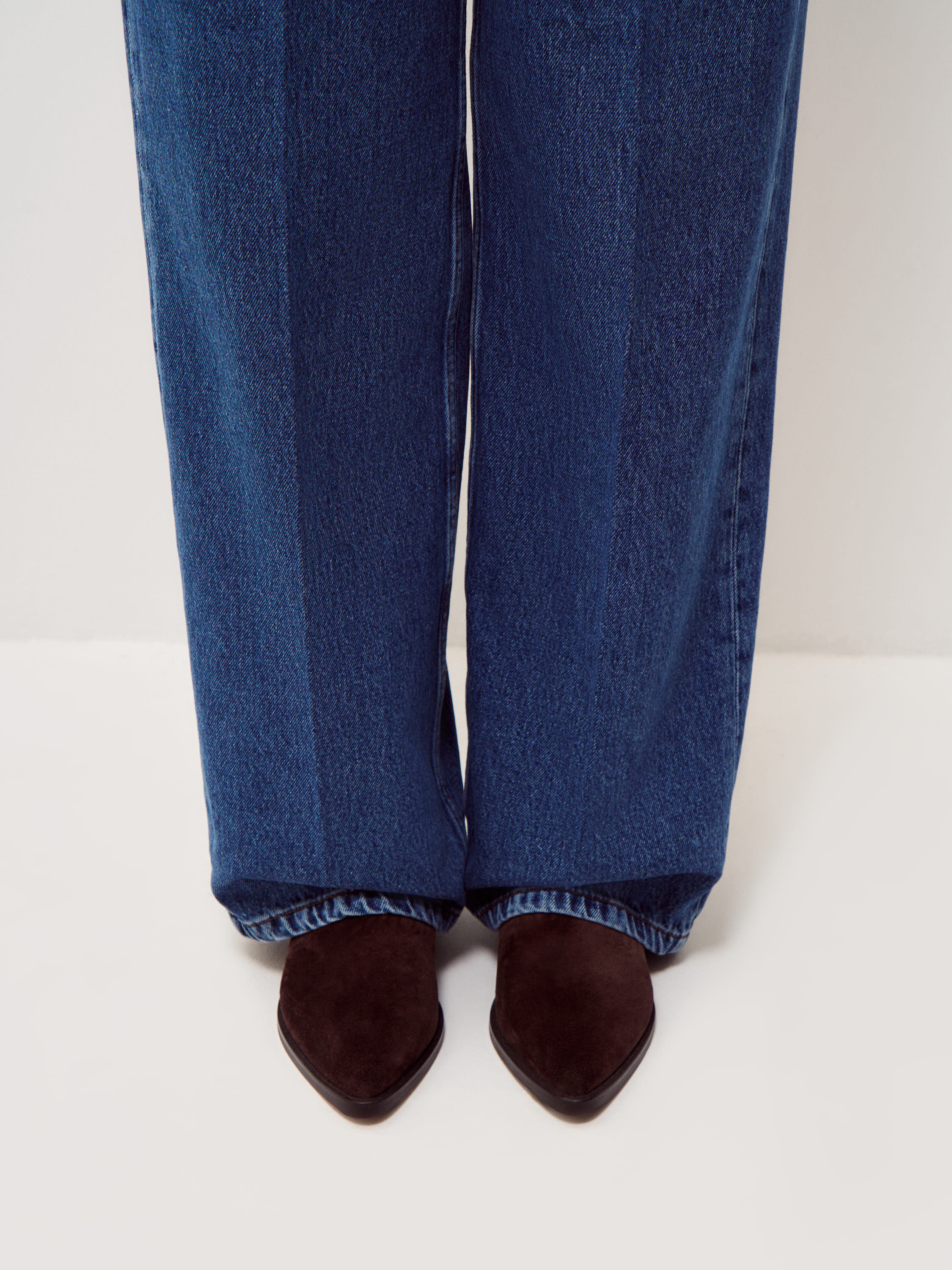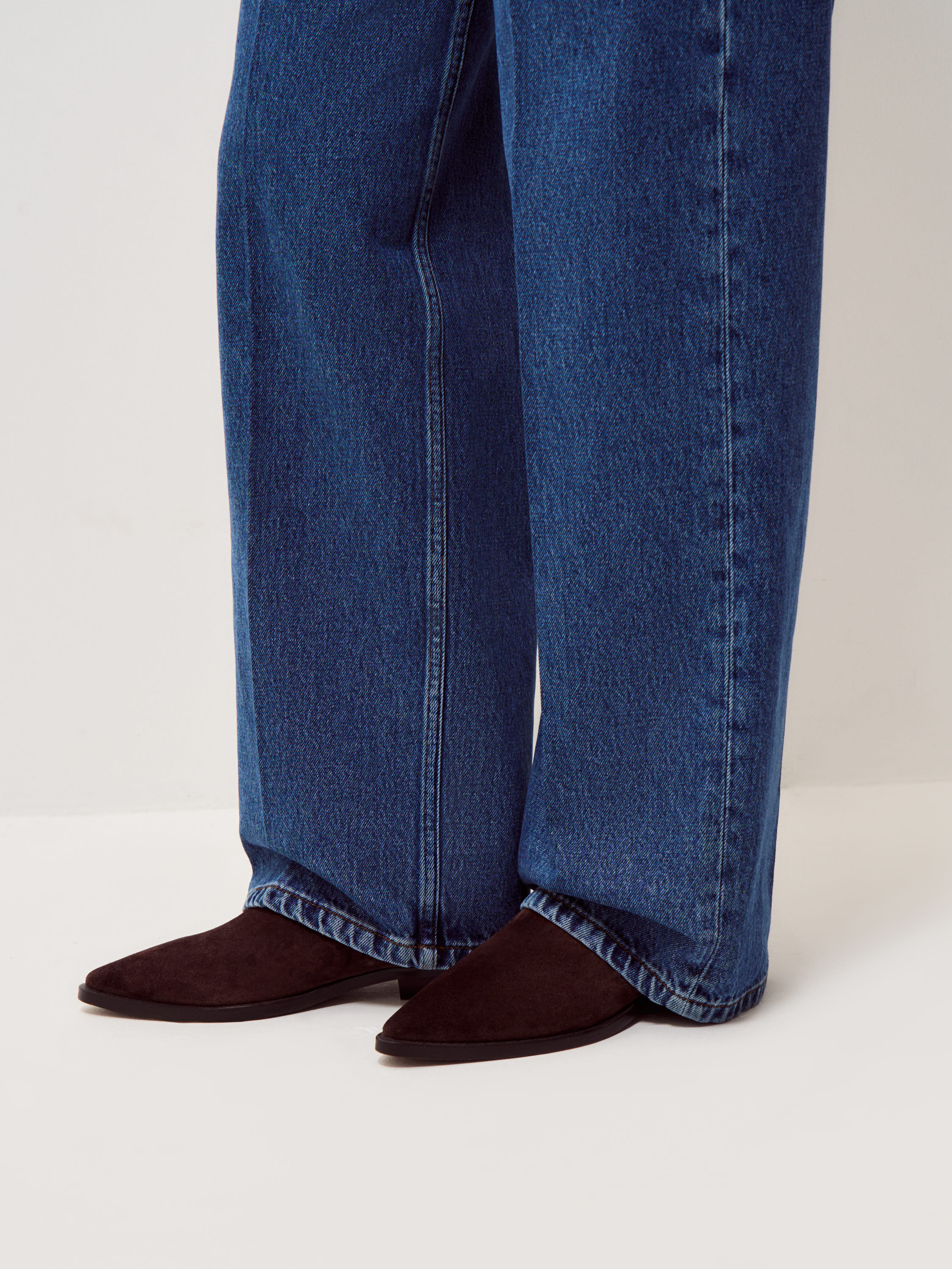 Полусапоги выполнены из натуральной замши с мягкой, бархатистой поверхностью. Внутренняя отделка из натуральной кожи обеспечивает комфорт при носке и хорошую адаптацию по ноге. Форма лаконичная, с аккуратным заостренным носком и устойчивой низкой подошвой, которая подходит для повседневного ритма. Посадка спокойная, без излишней жесткости, силуэт вытянутый и аккуратный. Оттенок теплый, естественный, хорошо сочетается с денимом, шерстяными брюками и трикотажными комплектами. Полусапоги органично вписываются в межсезонный гардероб и подходят для носки как с повседневными, так и с более собранными образами.