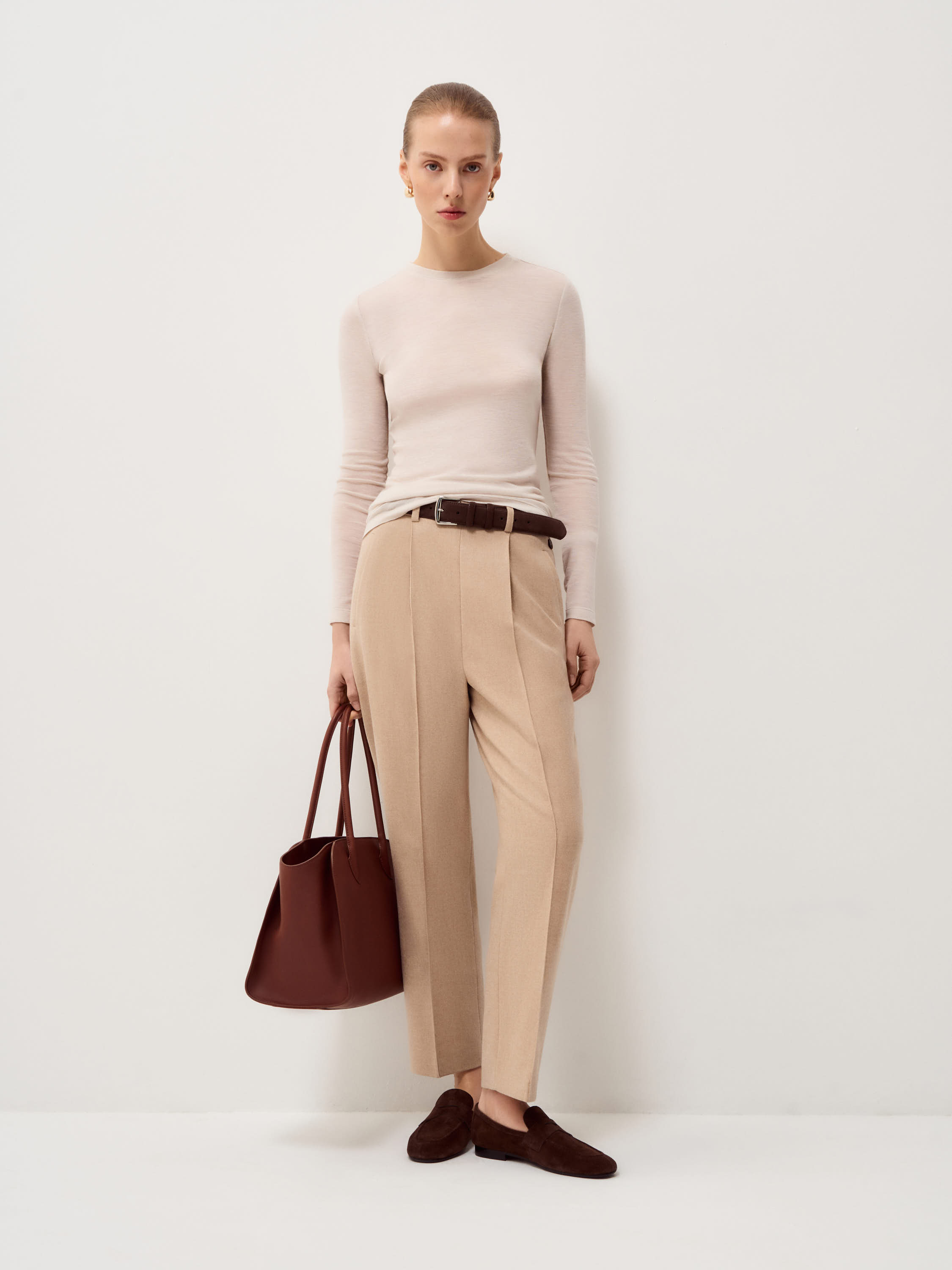 Лонгслив выполнен из 100% шерсти тонкой выделки. Полотно гладкое, мягкое и эластичное, комфортно прилегает к телу без излишнего объема. Силуэт прямой, посадка аккуратная, с классической круглой горловиной и длинным рукавом. Материал дышащий, сохраняет тепло и подходит для ношения как самостоятельный слой или в сочетании с жакетами и трикотажем. Оттенок светлый, теплый, с мягким бежево-молочным подтоном, универсальный для спокойной нейтральной палитры гардероба.