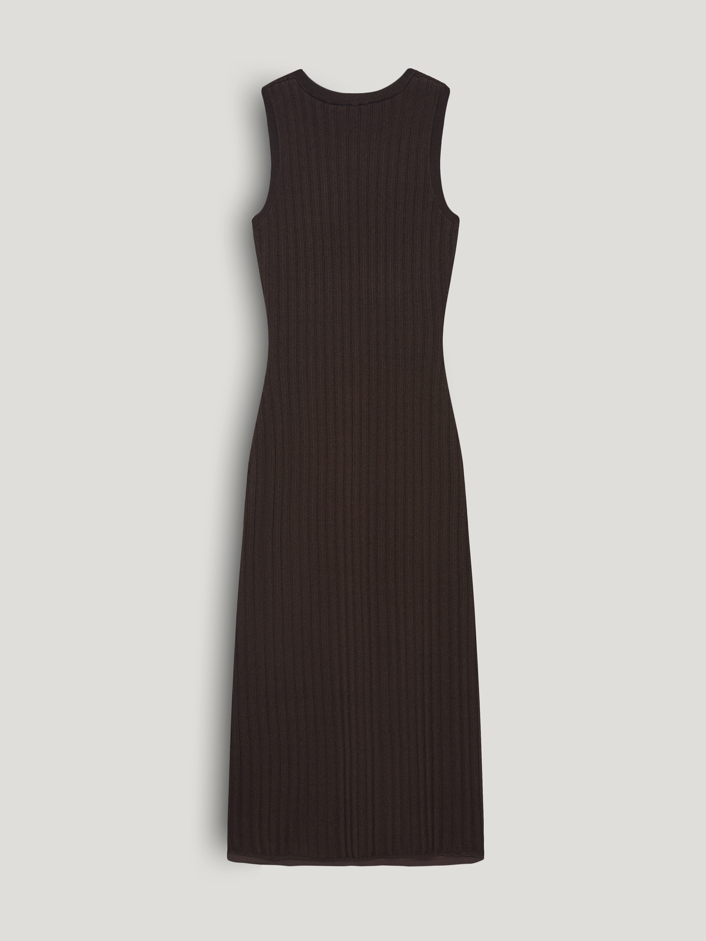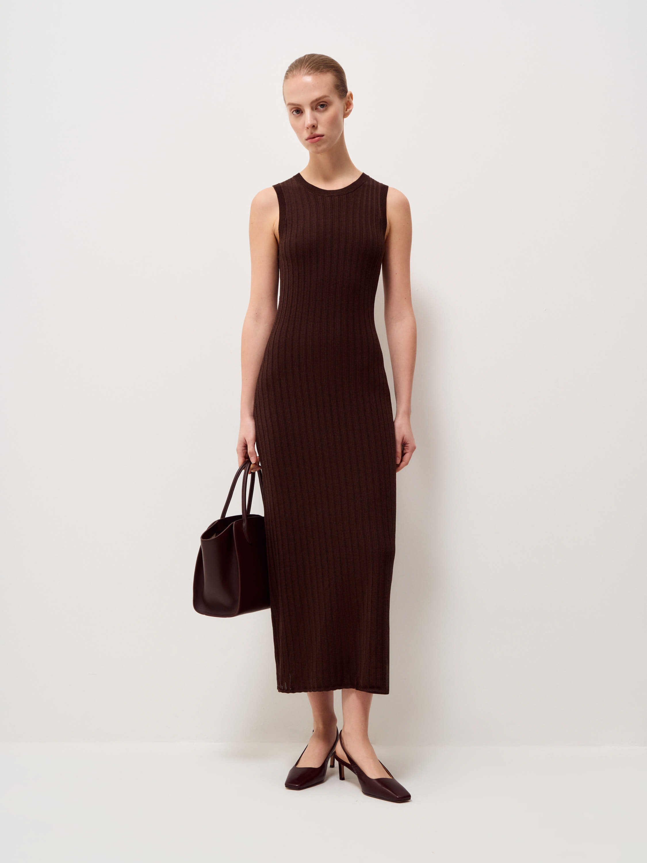 Трикотажное платье из смесовой пряжи на основе вискозы с добавлением хлопка и шелка. Материал мягкий, пластичный, с деликатной фактурой в вертикальный рубчик, за счет которой силуэт выглядит более стройным и вытянутым. Модель без рукавов с аккуратной линией плеч и округлым вырезом, приталивание выстроено плавно, без резких переходов. Длина миди делает образ сдержанным и универсальным: платье уместно как в повседневных сочетаниях с сандалиями и балетками, так и с жакетом и обувью на каблуке. Оттенок темно-коричневый, глубокий и нейтральный для базового гардероба.