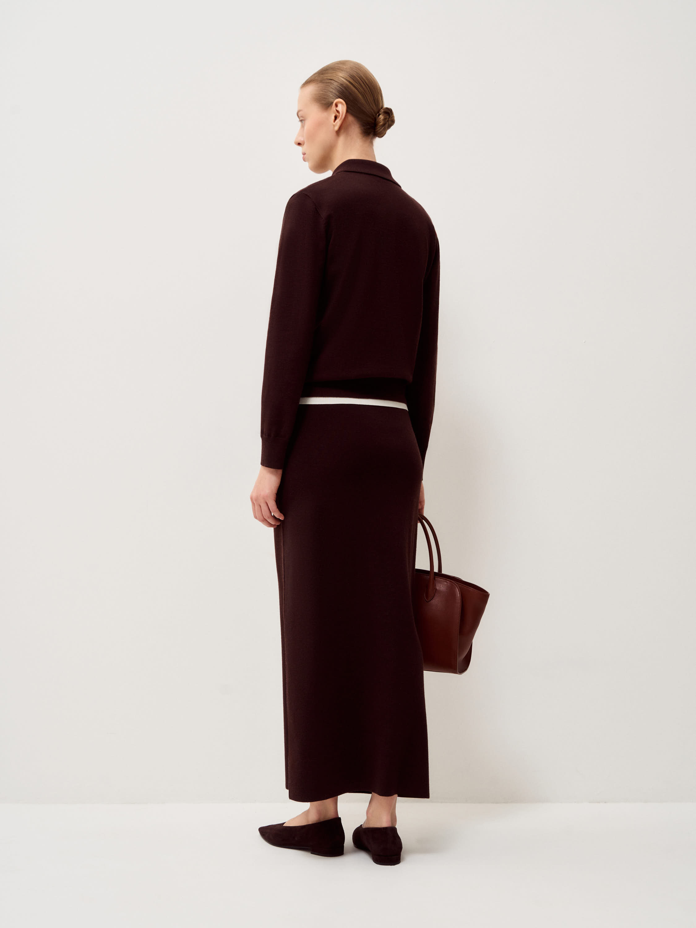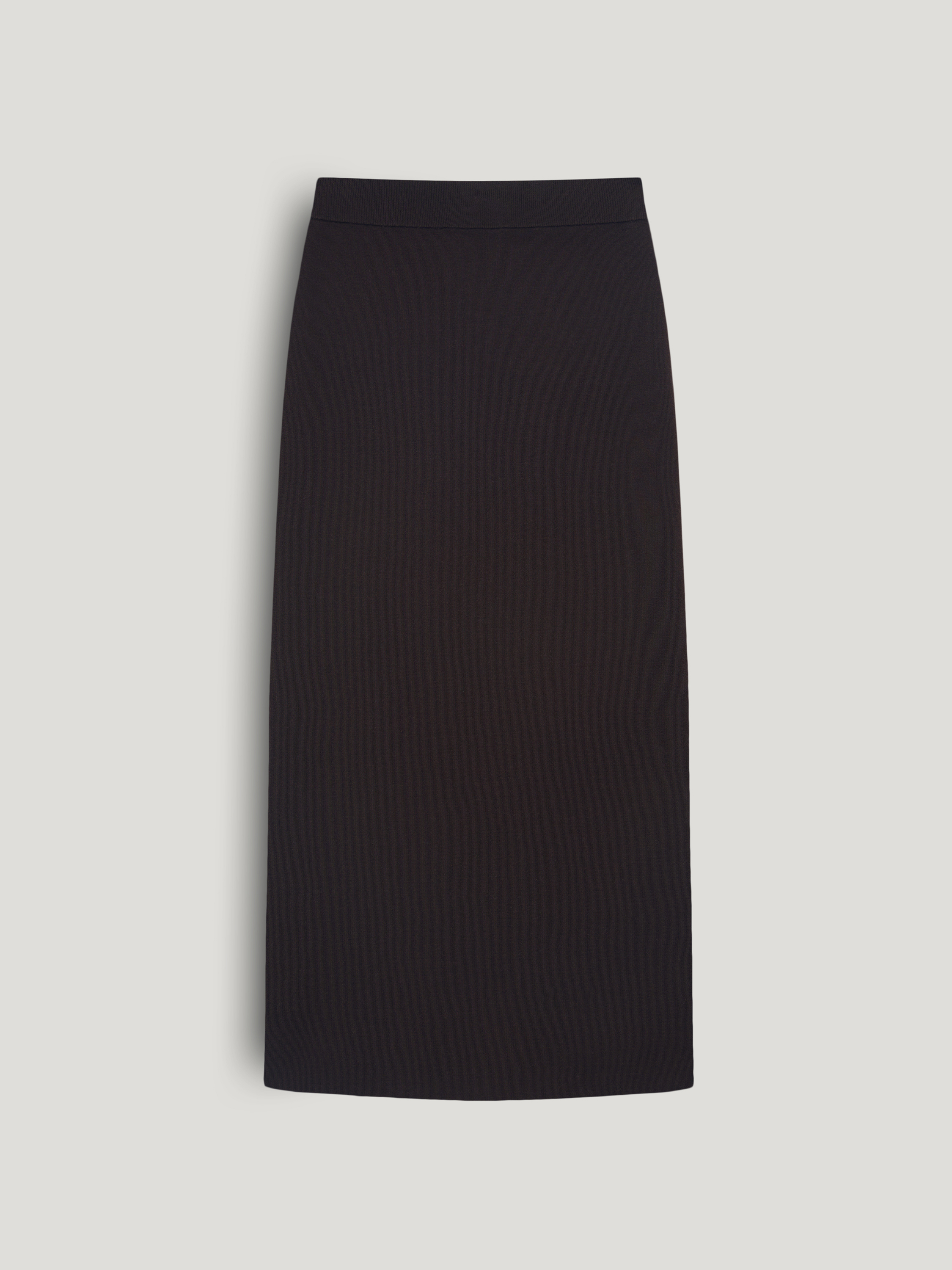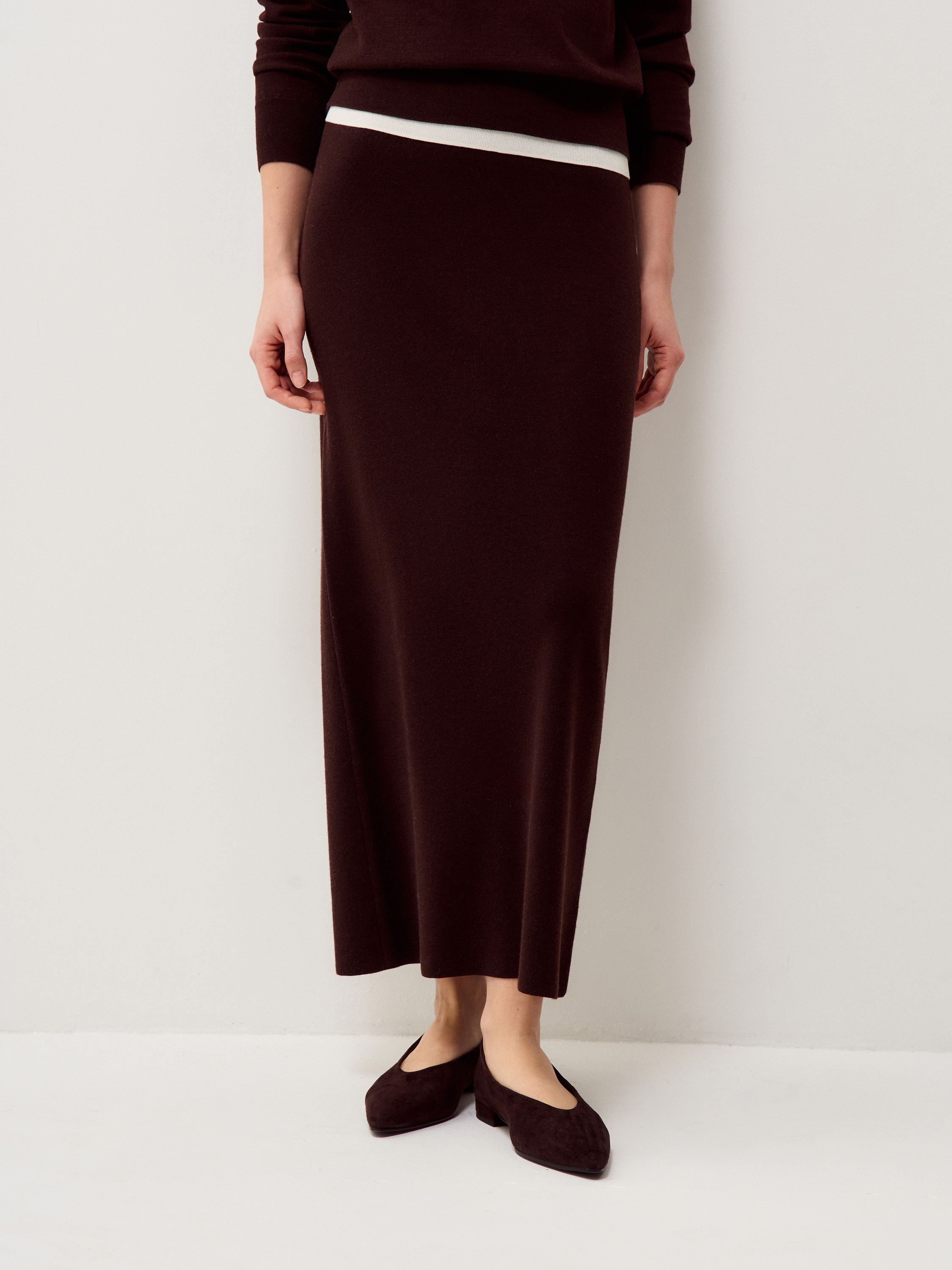 Трикотажная юбка в молочном оттенке выполнена из мериносовой шерсти с добавлением шелка. Полотно тонкое, гладкое, с мягкой пластикой и деликатным естественным блеском, характерным для шелковой нити; материал держит форму и при этом остается комфортным в движении. Модель прямого, слегка зауженного книзу силуэта формирует чистую вертикаль и аккуратную пропорцию длины миди. Эластичный пояс мягко фиксируется по линии талии, обеспечивая ровную посадку без лишнего объема. Лаконичная конструкция без декоративных элементов подчеркивает фактуру трикотажа и делает юбку универсальной основой для повседневных сочетаний — с тонким джемпером, рубашкой или структурированным жакетом.