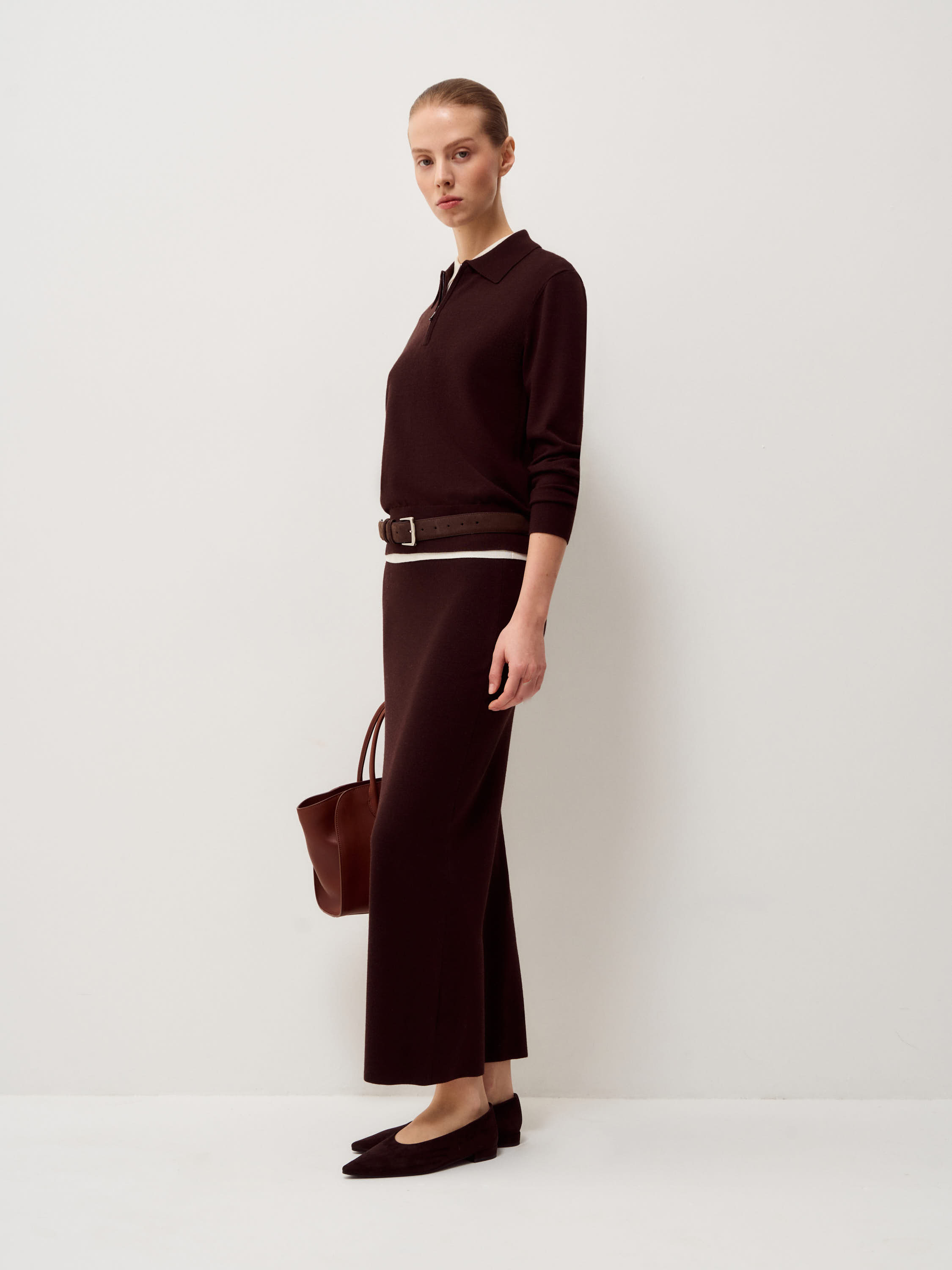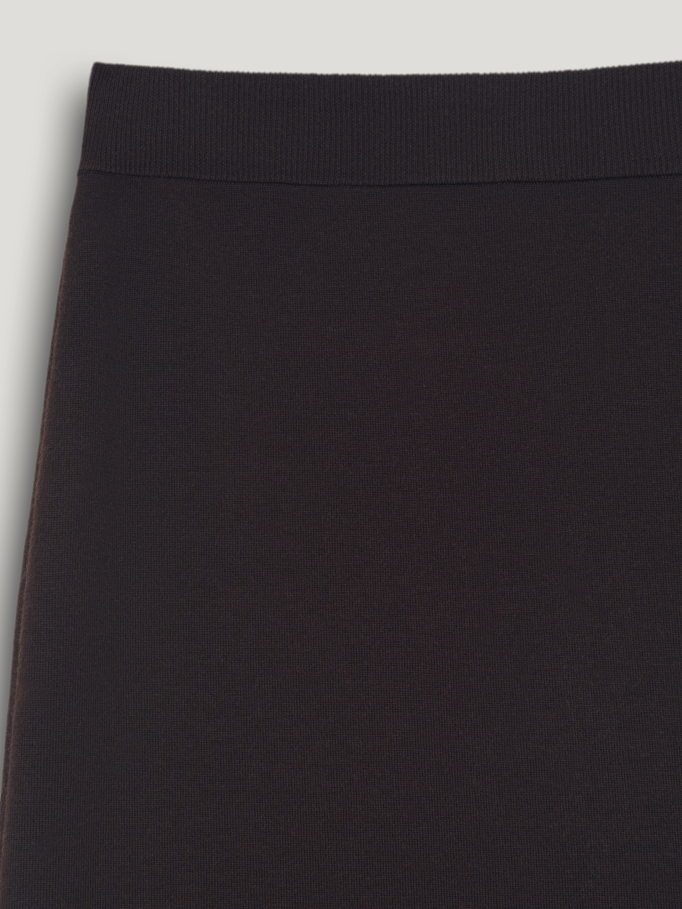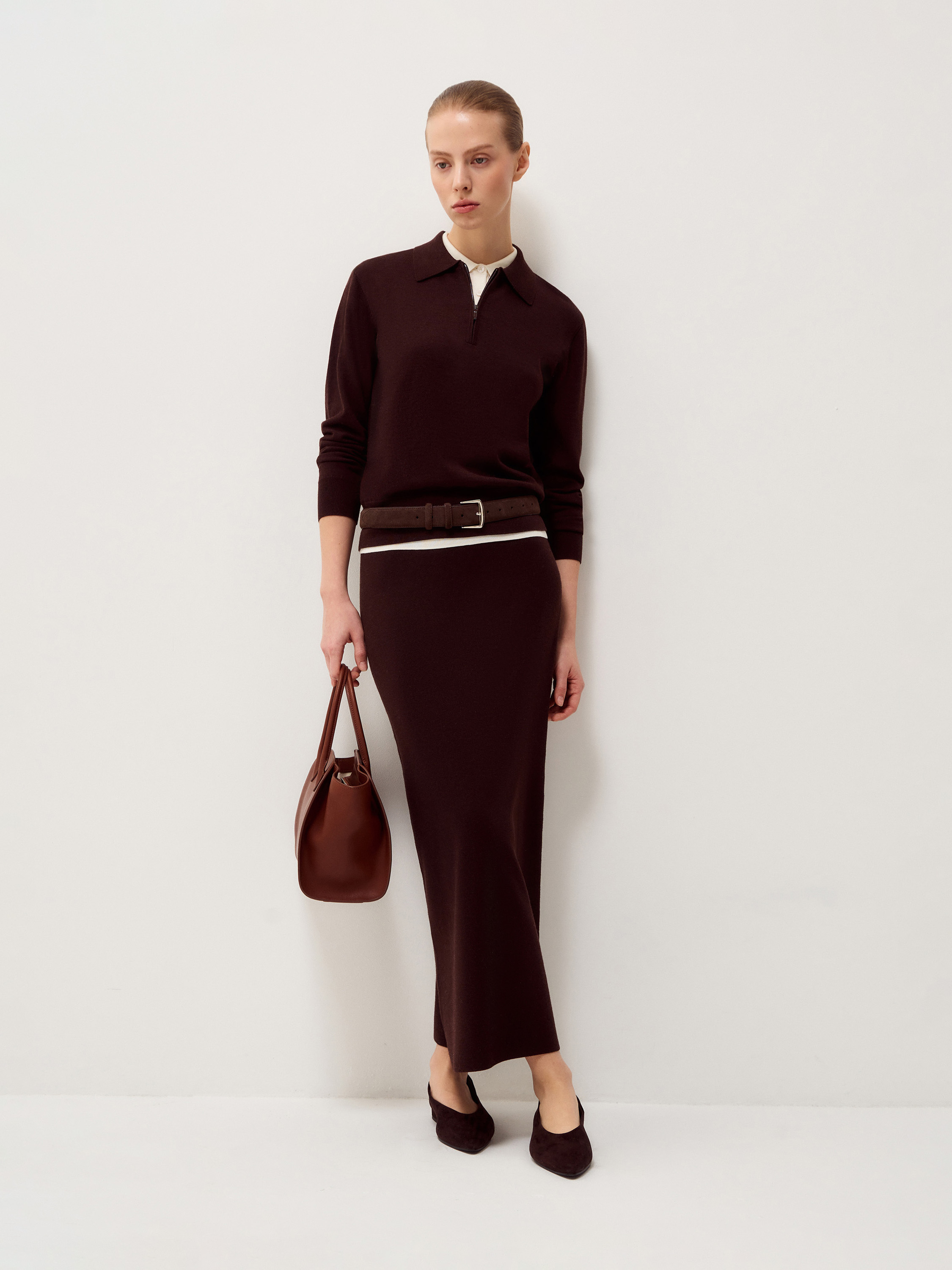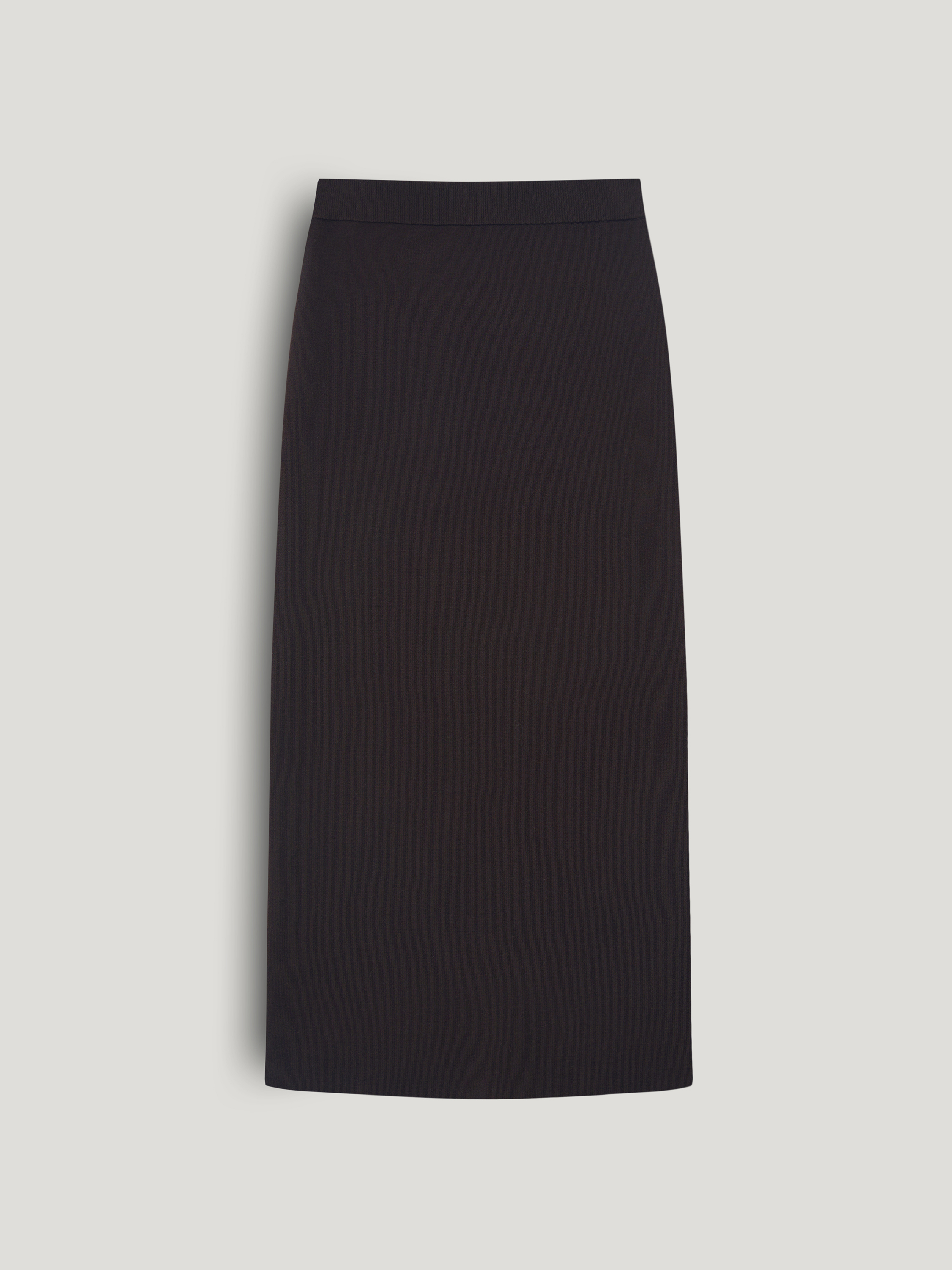 Трикотажная юбка в молочном оттенке выполнена из мериносовой шерсти с добавлением шелка. Полотно тонкое, гладкое, с мягкой пластикой и деликатным естественным блеском, характерным для шелковой нити; материал держит форму и при этом остается комфортным в движении. Модель прямого, слегка зауженного книзу силуэта формирует чистую вертикаль и аккуратную пропорцию длины миди. Эластичный пояс мягко фиксируется по линии талии, обеспечивая ровную посадку без лишнего объема. Лаконичная конструкция без декоративных элементов подчеркивает фактуру трикотажа и делает юбку универсальной основой для повседневных сочетаний — с тонким джемпером, рубашкой или структурированным жакетом.
