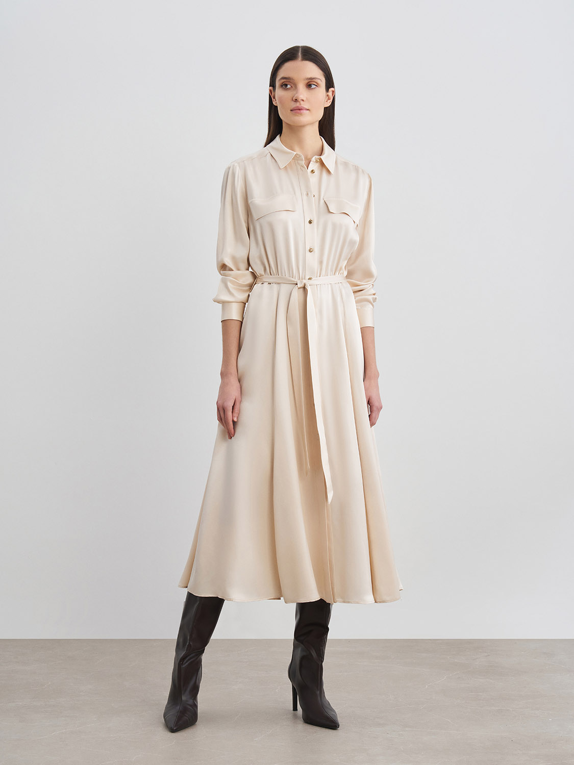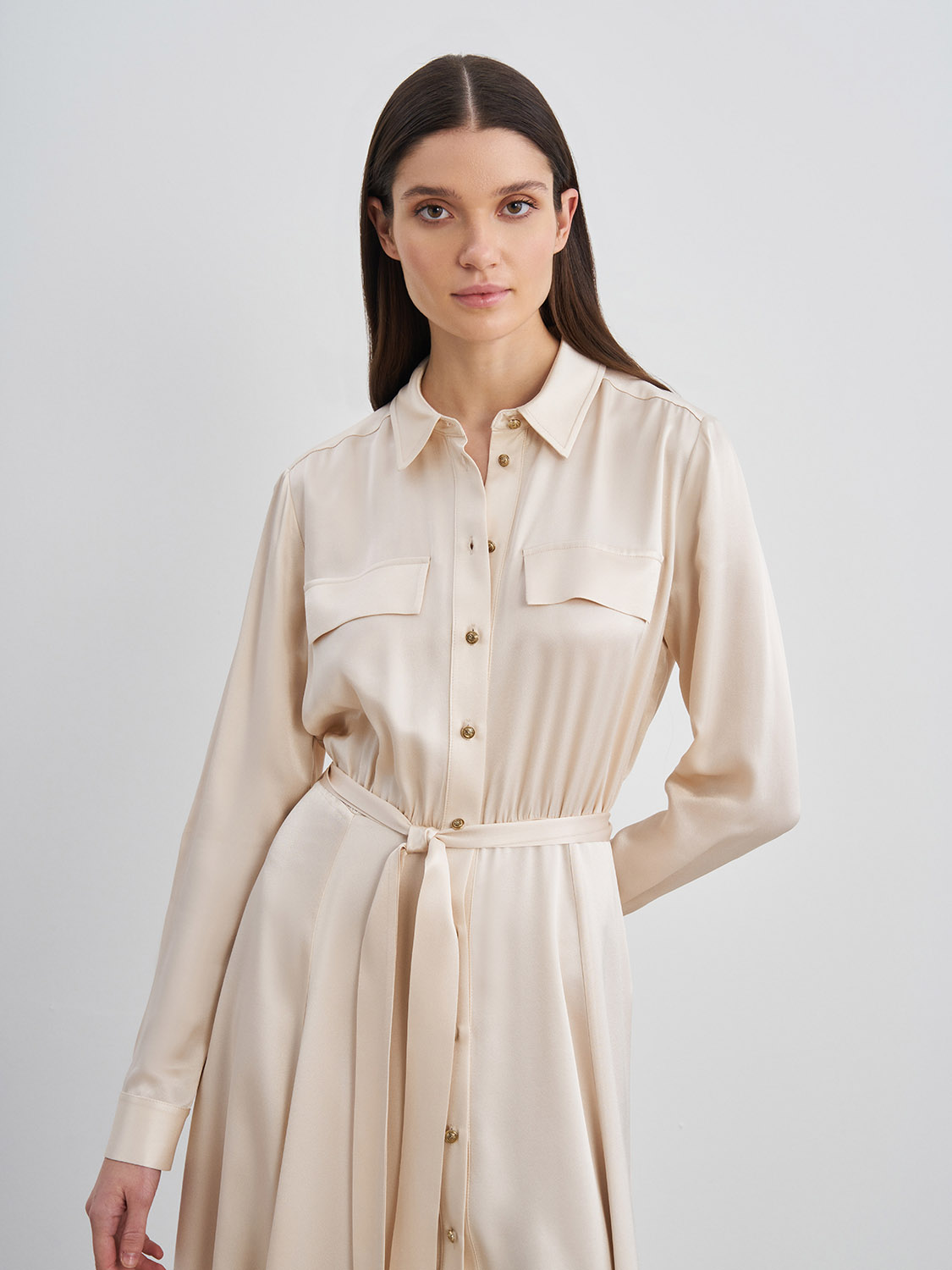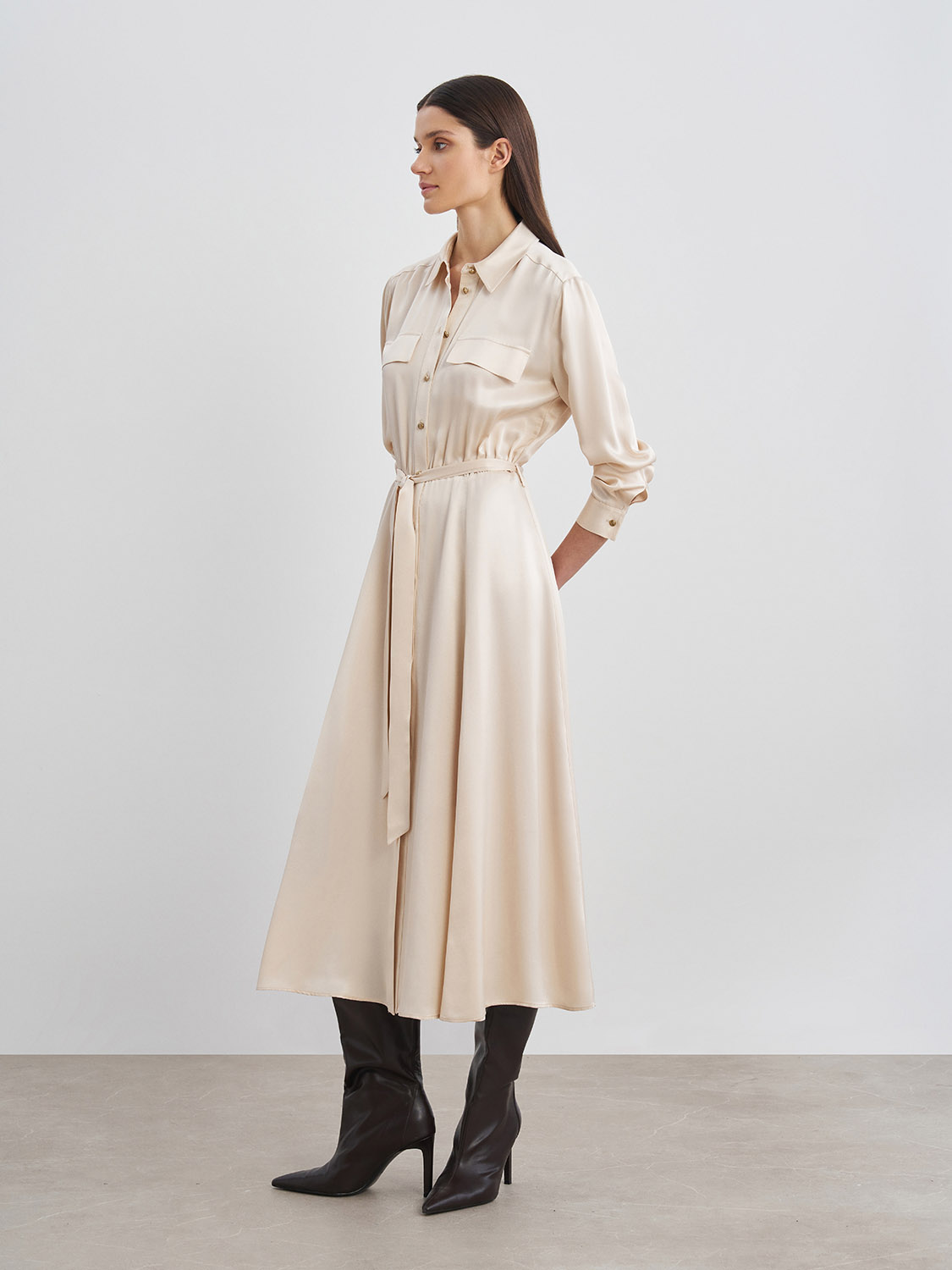 Струящееся атласное платье миди из вискозы. Длинные рукава с манжетами, пояс на талии, застежка спереди на пуговицы, нагрудные декоративные клапаны. Подойдет как для повседневной носки на работу или в офис, так и для вечерних, праздничных мероприятий. Удачным сочетанием станут туфли-лодочки, босоножки, высокие сапоги на каблуке или ботильоны. На модели размер S. Параметры модели: рост 175, 80-60-88.