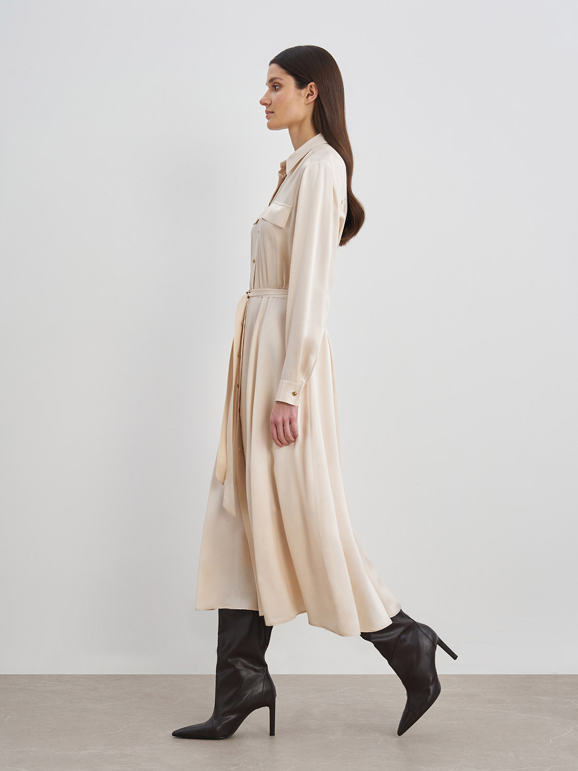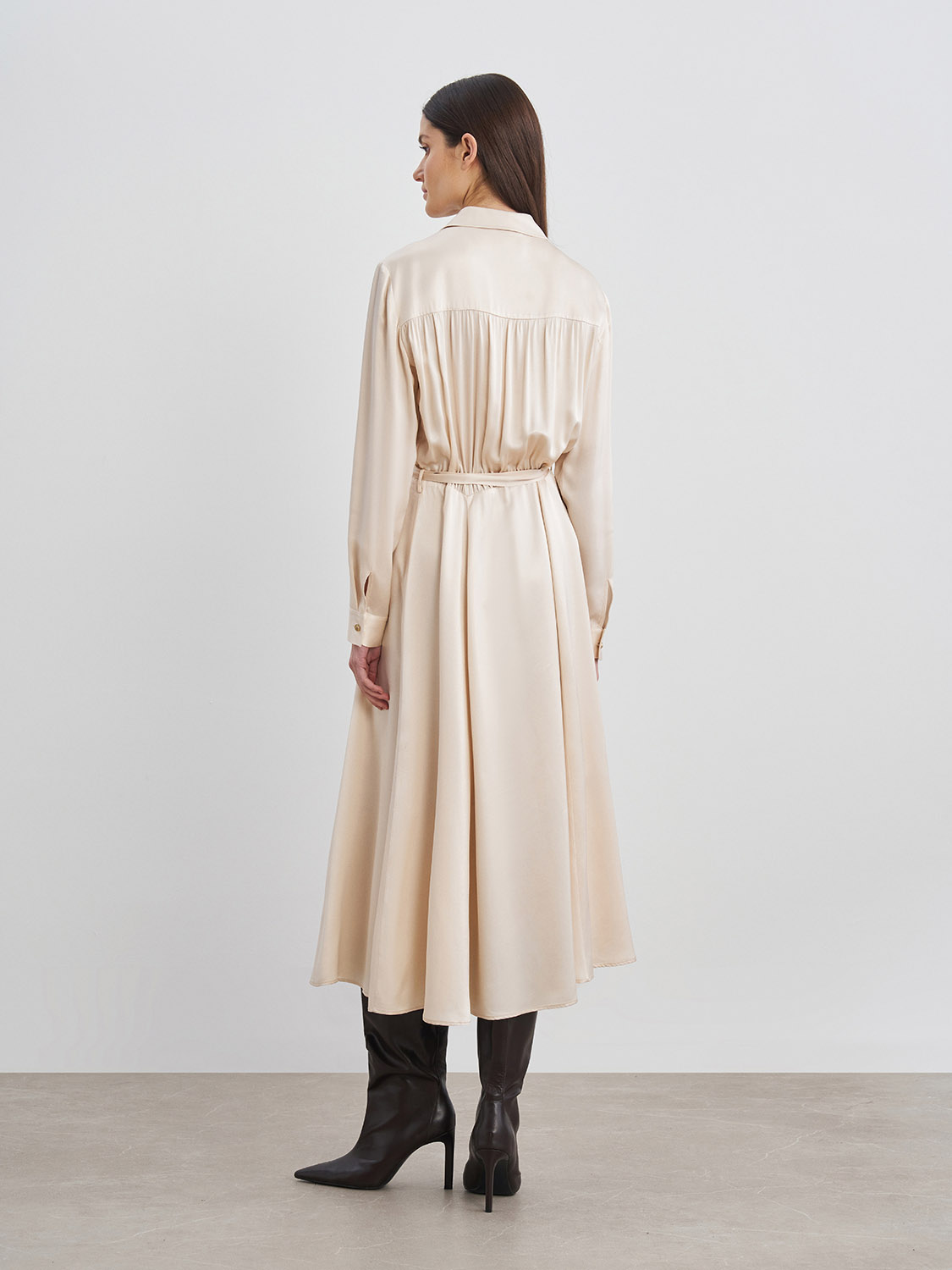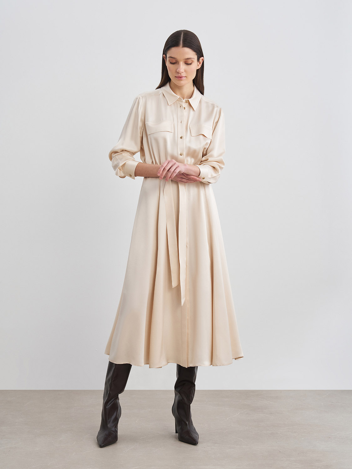 Струящееся атласное платье миди из вискозы. Длинные рукава с манжетами, пояс на талии, застежка спереди на пуговицы, нагрудные декоративные клапаны. Подойдет как для повседневной носки на работу или в офис, так и для вечерних, праздничных мероприятий. Удачным сочетанием станут туфли-лодочки, босоножки, высокие сапоги на каблуке или ботильоны. На модели размер S. Параметры модели: рост 175, 80-60-88.