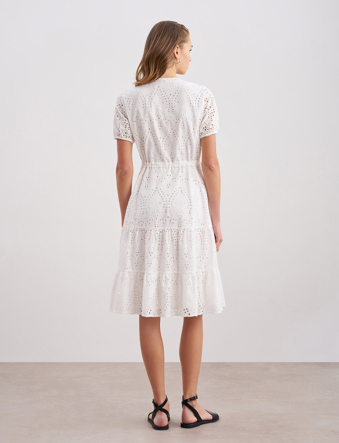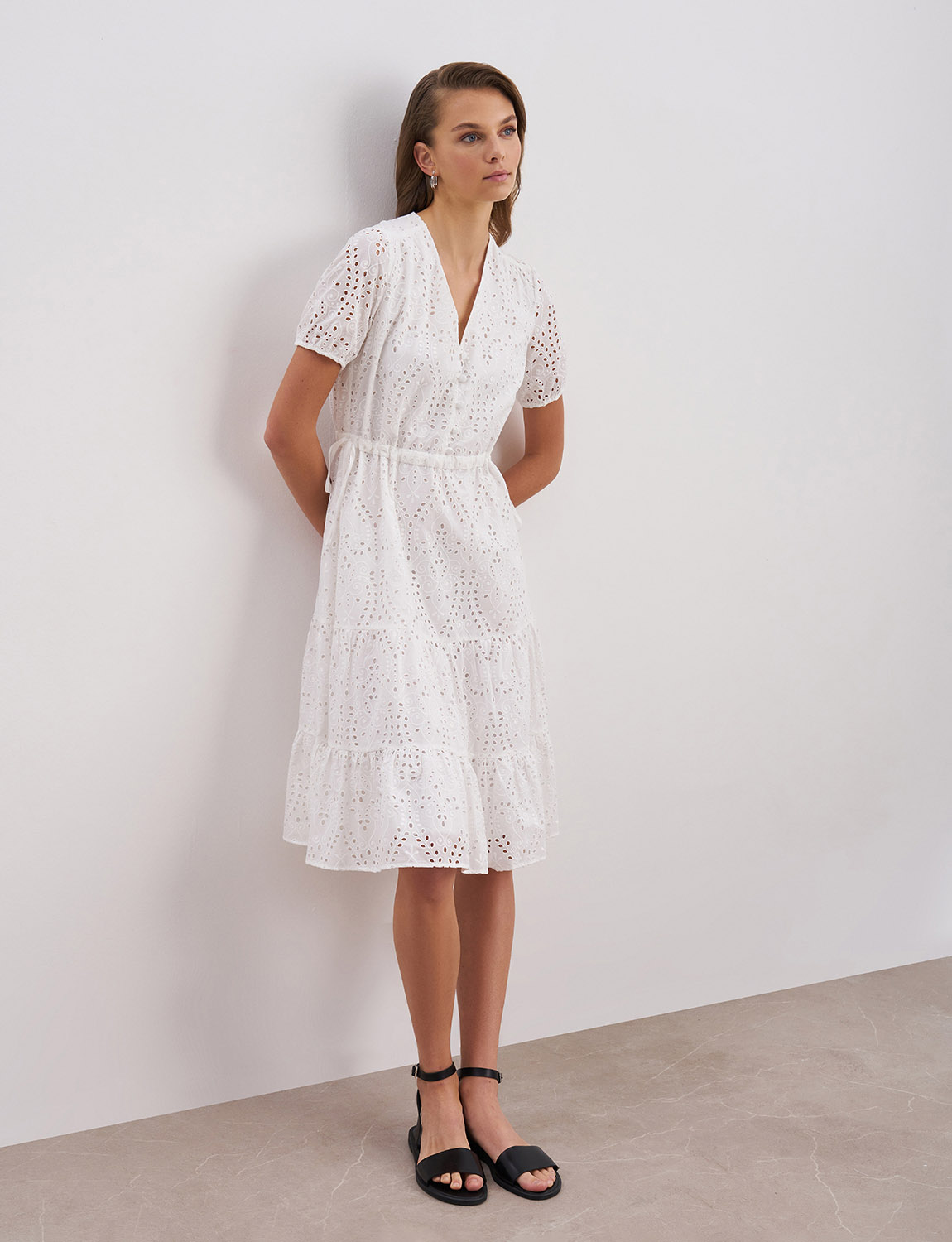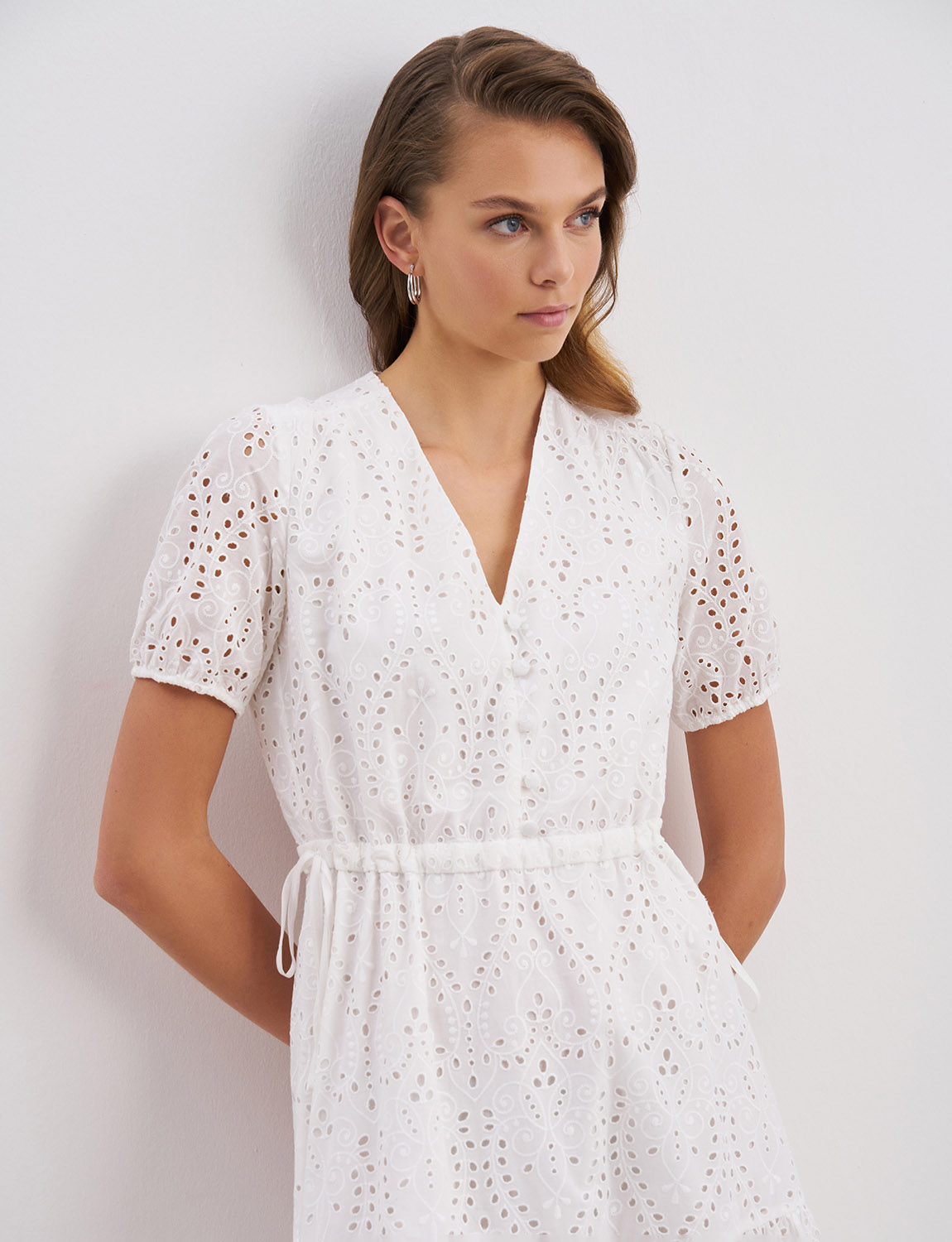 Хлопковое платье миди с изящным и нежным кружевом. Короткие рукава, кулиска на талии, регулирующая прилегание, V-образный вырез, воланы на юбке. Полностью выполнено из натурального хлопка, что позволяет чувствовать себя комфортно в жаркие летние дни. Легкое и непринужденное, подойдет для повседневных образов и прогулок в сочетании с сандалиями или босоножками. На модели размер S. Параметры модели: рост 180, 83-60-88.