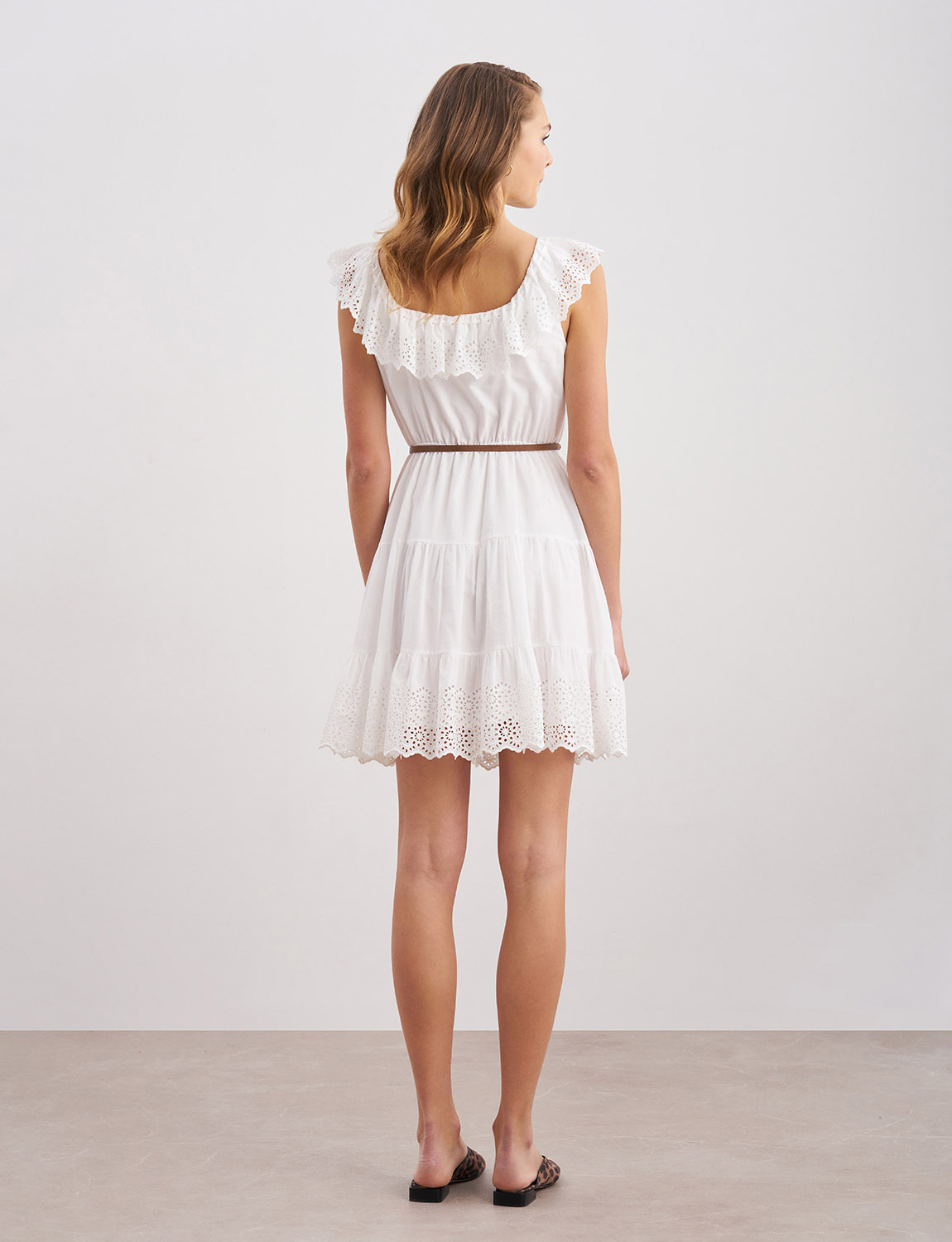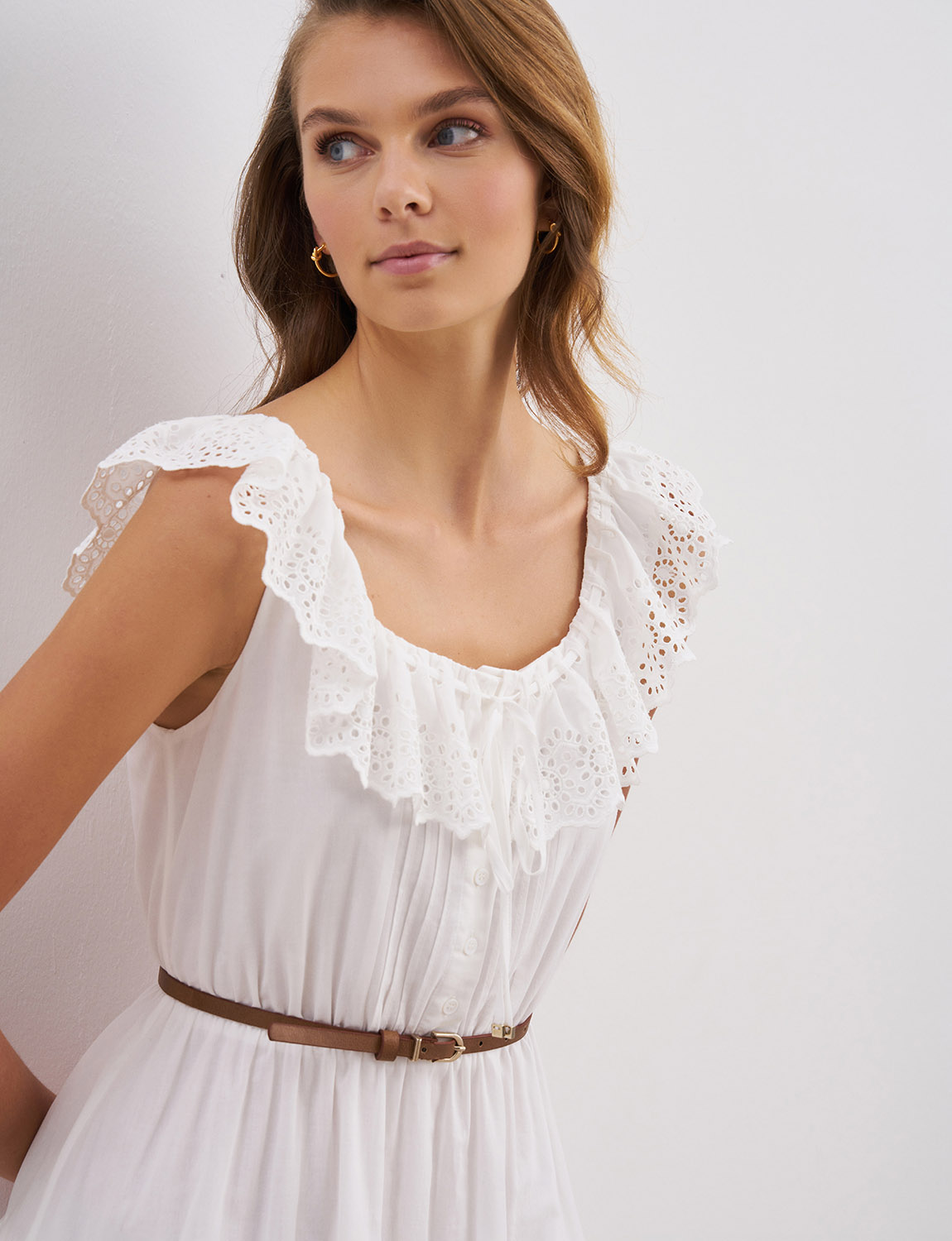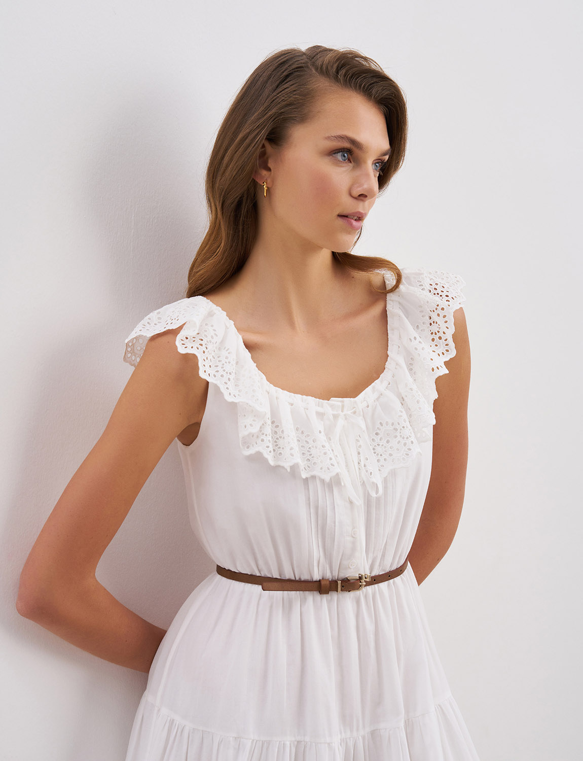 Нежное и изящное платье-сарафан длины мини. Выполнено с воздушным кружевом на вороте и на волане, застежка спереди на пуговицы с кулиской. Натуральный хлопок в составе ткани позволяет чувствовать себя комфортно даже в самую жаркую погоду. Платье дополнит повседневные образы и подойдет для летних прогулок в сочетании с сандалиями или босоножками. Ремень в комплект не входит. На модели размер S. Параметры модели: рост 180, 83-60-88.