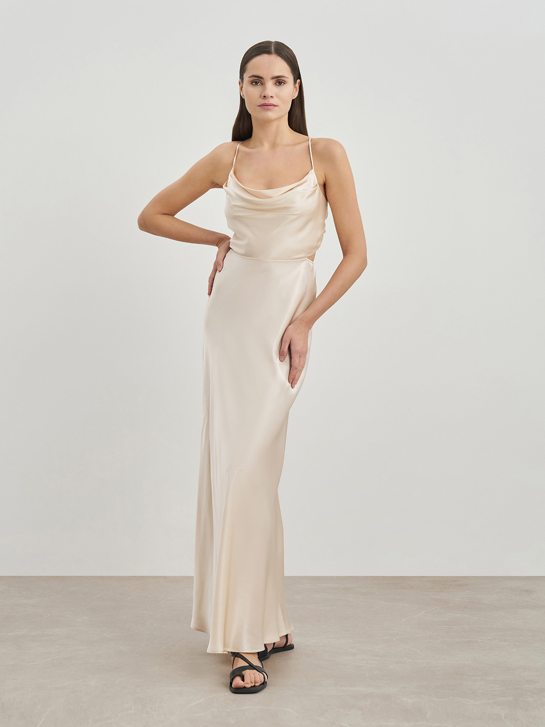 Элегантное платье макси из струящейся атласной ткани. Изящная шнуровка на спинке, тонкие регулируемые бретели, ворот-качель, приталенный силуэт и гладкая и приятная на ощупь и коже вискоза в составе. Платье деликатно сияет при любом освещении и регулируется по фигуре. Роскошный вариант для вечерних мероприятий и торжеств, летних вечерних прогулок в сочетании с прямым жакетом, лодочками или босоножками. На модели размер S. Параметры модели: рост 174, 84-63-88.