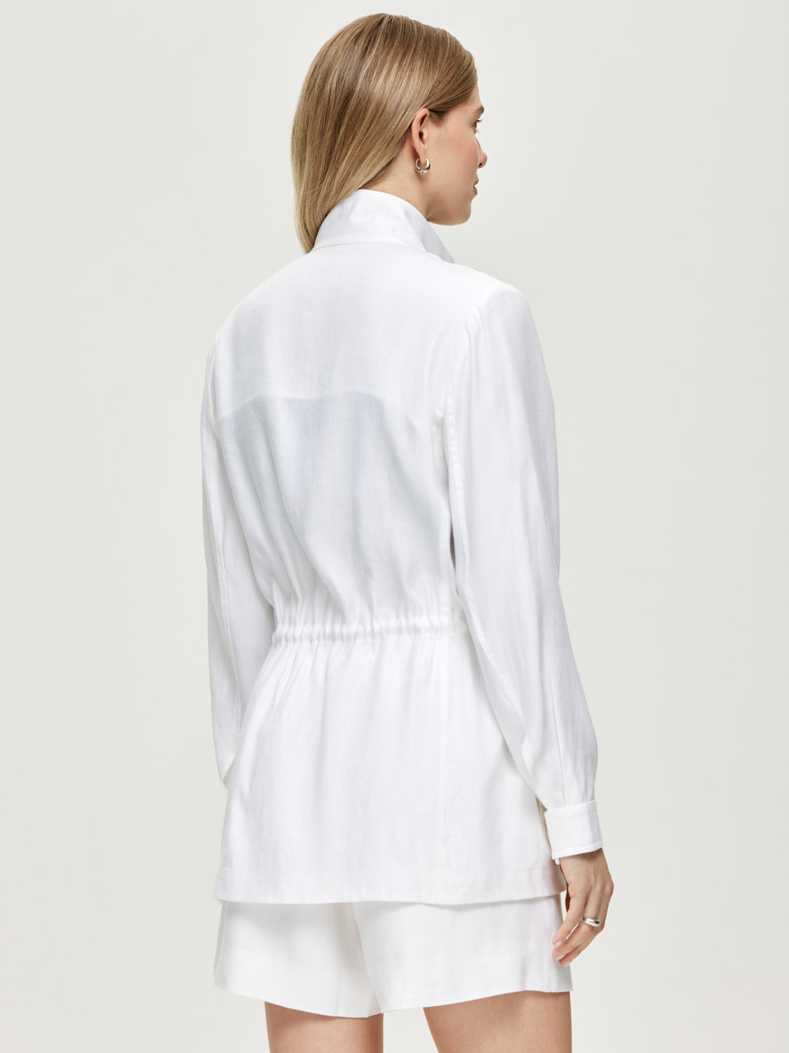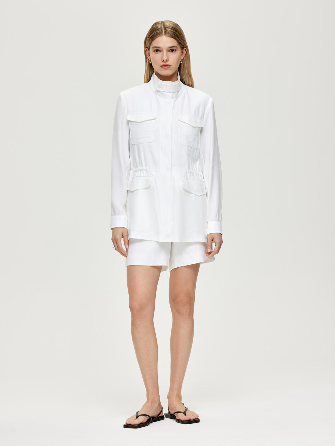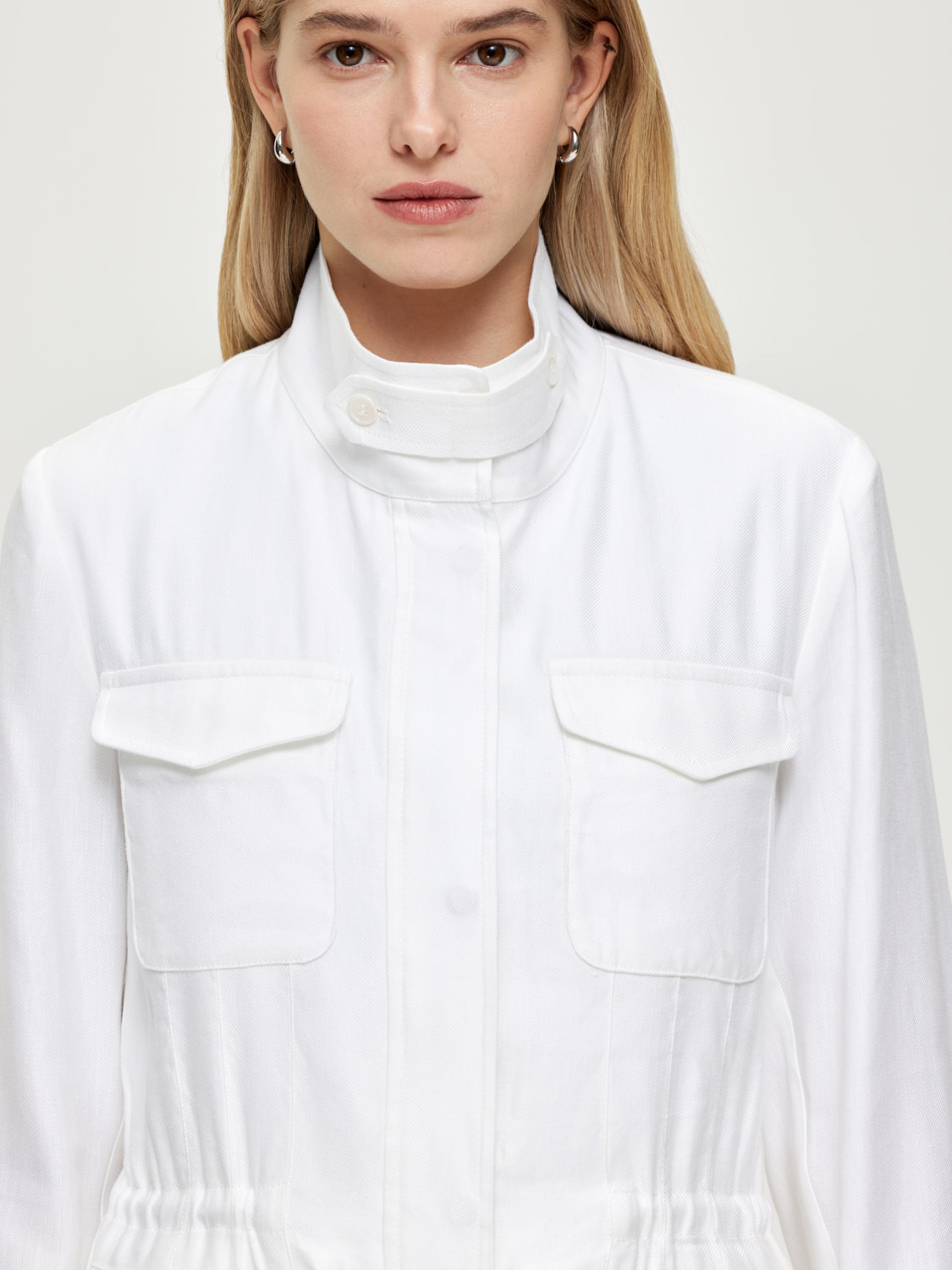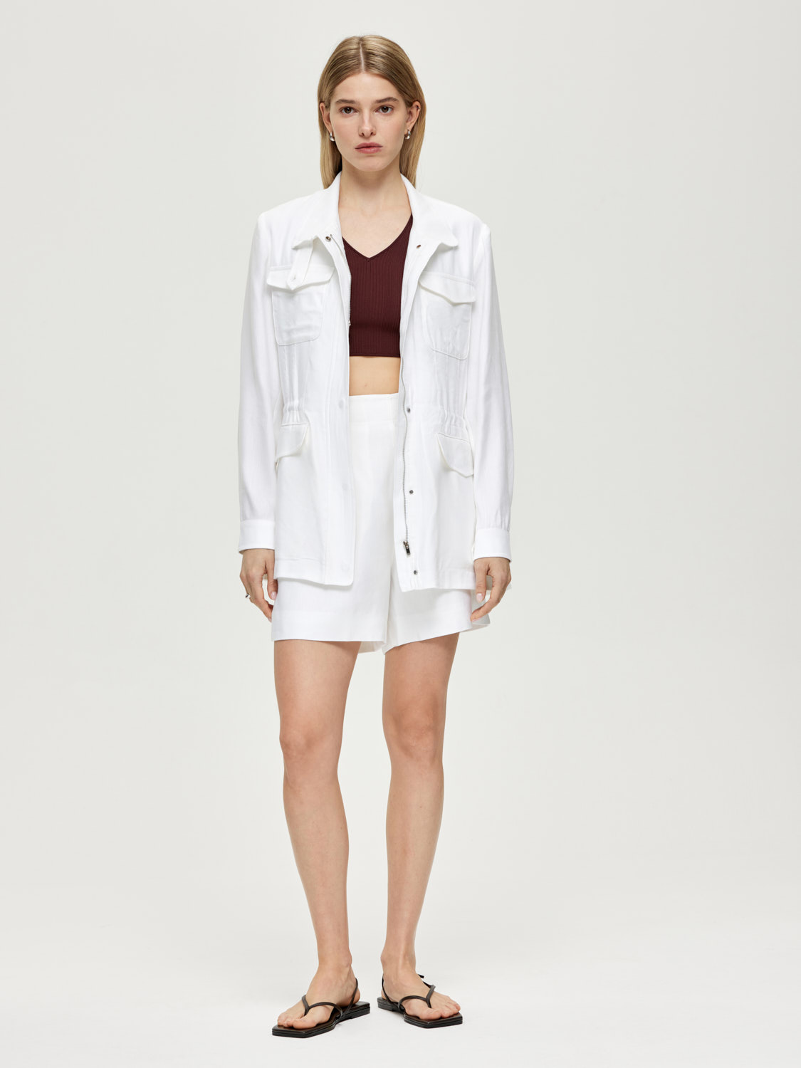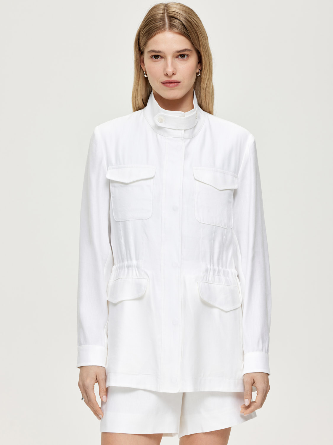 Легкая летняя куртка изо льна в стиле сафари с характерными накладными карманами с клапанами. Ворот-стойка, застежка на молнию и кнопки. Втачной рукав полной длины. Обозначает талию и создает женственный силуэт пояс-кулиска. Куртка выполнена из натурального льна с добавлением модала, благодаря чему материал более шелковистый, тактильно приятный и меньше мнется. Комфортно в жару за счет охлаждающего эффекта. Сочетайте с парными шортами, юбками и платьями. Дополняйте сандалиями, лоферами и босоножками. На модели размер S. Параметры модели: рост 174, 86-63-90.