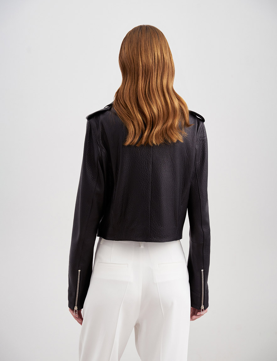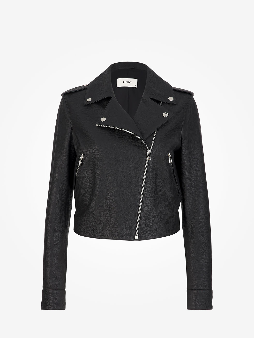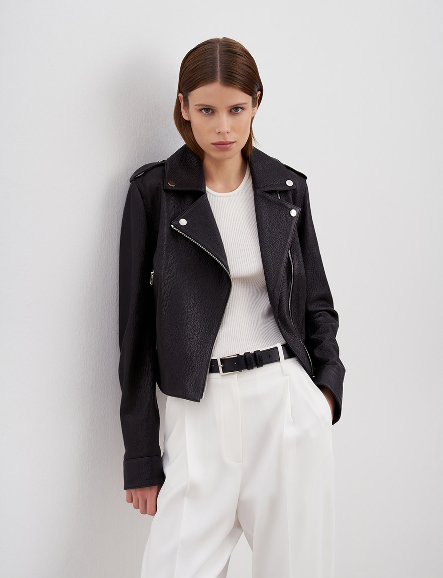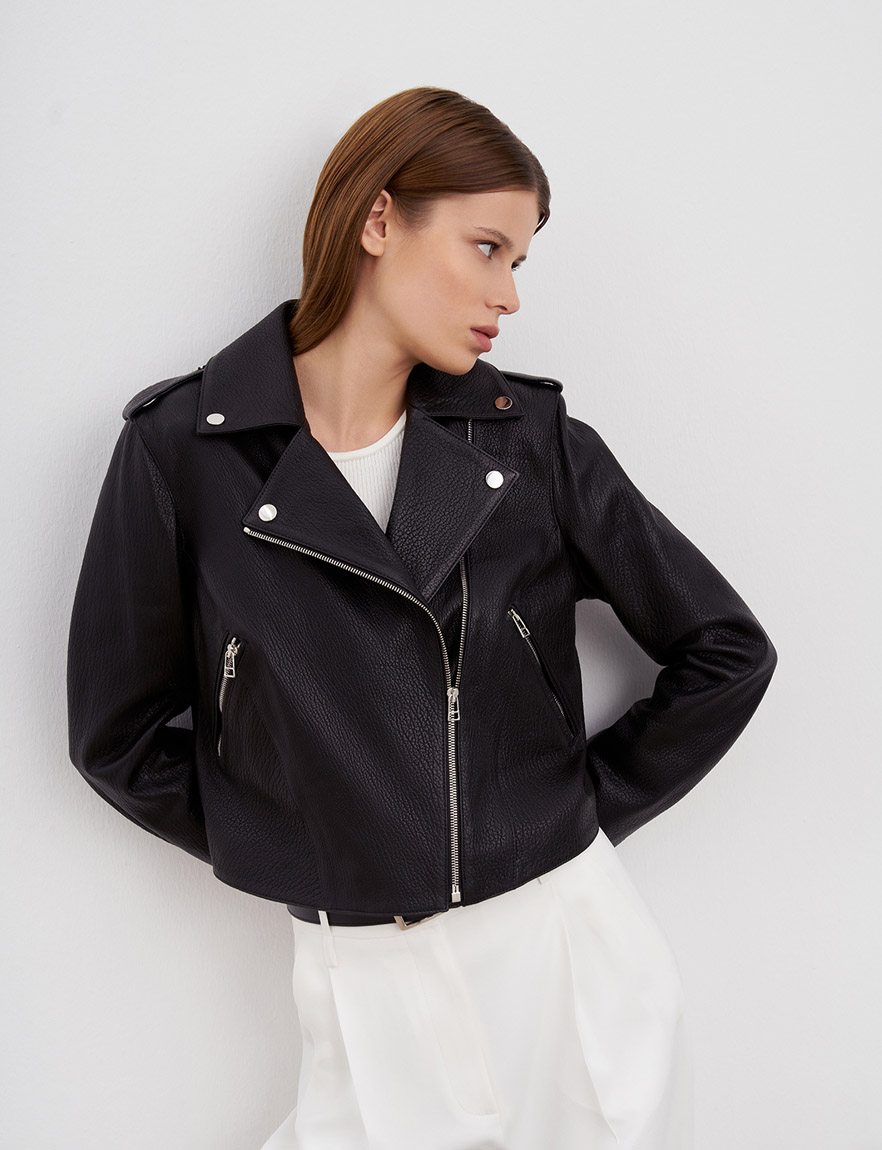 Куртка-косуха из фактурной натуральной кожи. Асимметричная застежка на молнию, отложной ворот, карманы на молнии. Дополнит как дерзкие образы с массивными ботинками, так и женственные с платьями-комбинациями и лодочками. Универсальный и актуальный вне времени элемент гардероба, который подойдет для повседневной жизни, вечерних прогулок и выходов в свет. На модели размер S. Параметры модели: рост 177, 84-62-93.