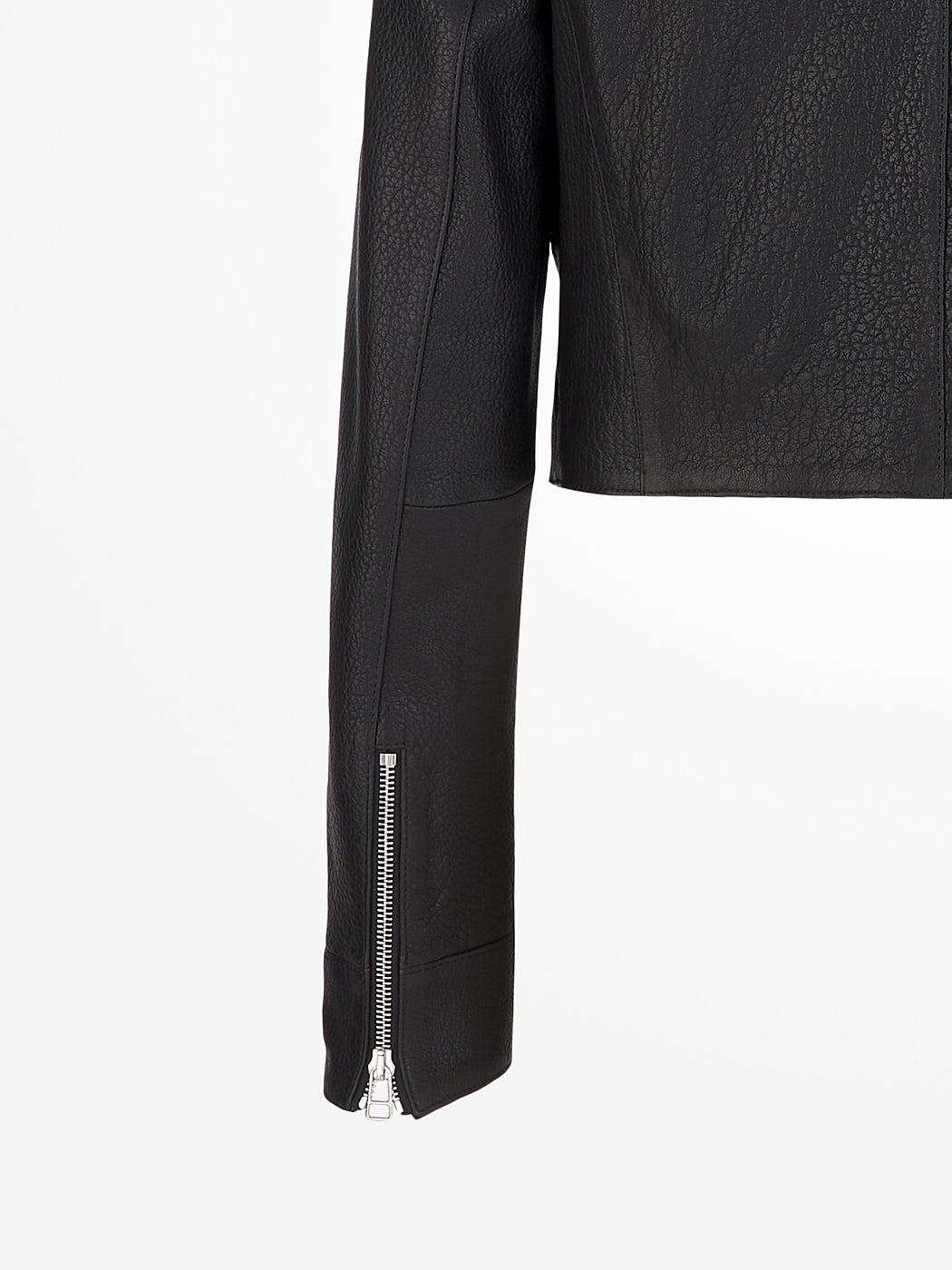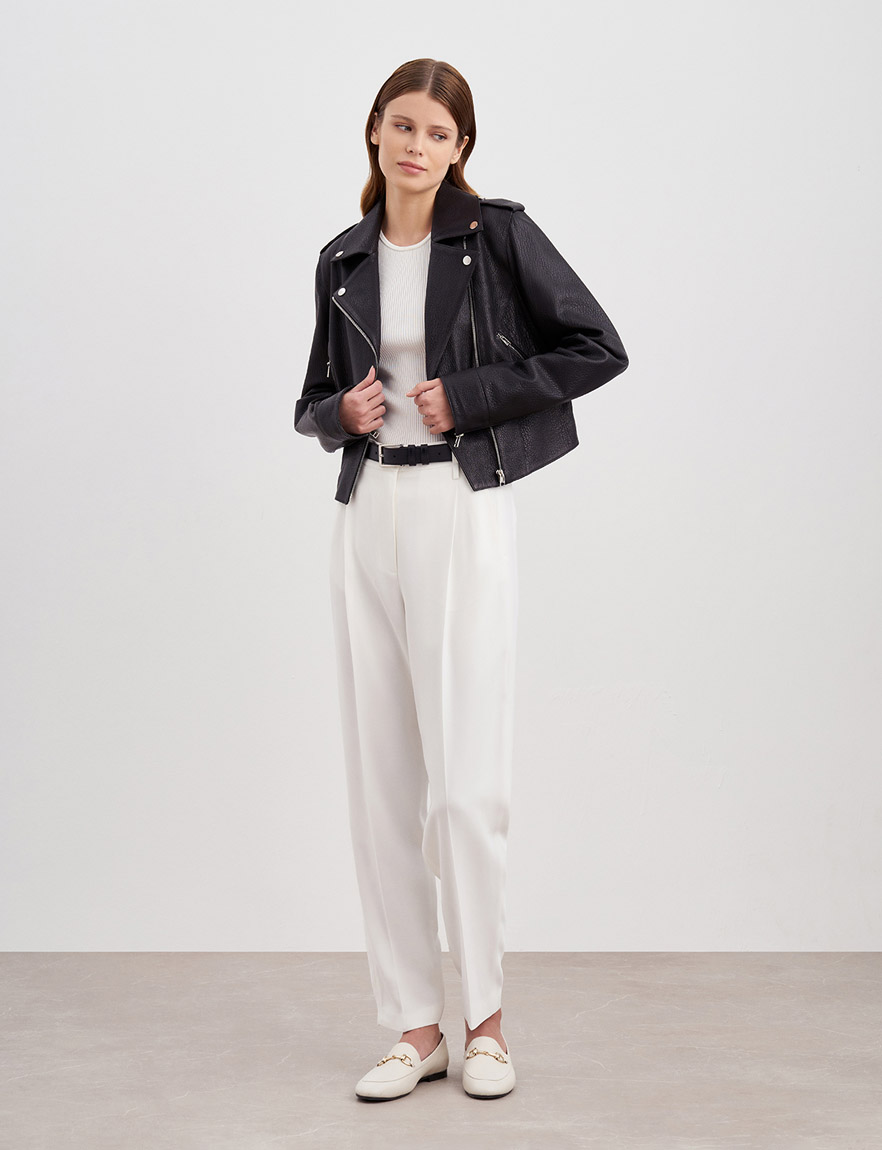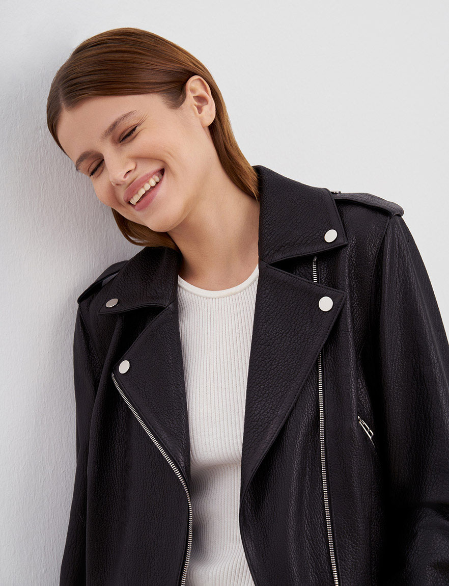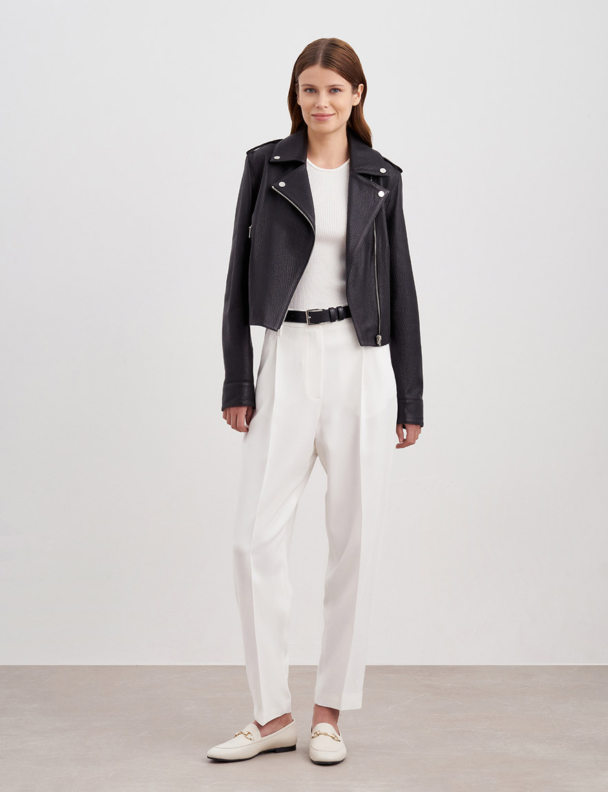 Куртка-косуха из фактурной натуральной кожи. Асимметричная застежка на молнию, отложной ворот, карманы на молнии. Дополнит как дерзкие образы с массивными ботинками, так и женственные с платьями-комбинациями и лодочками. Универсальный и актуальный вне времени элемент гардероба, который подойдет для повседневной жизни, вечерних прогулок и выходов в свет. На модели размер S. Параметры модели: рост 177, 84-62-93.