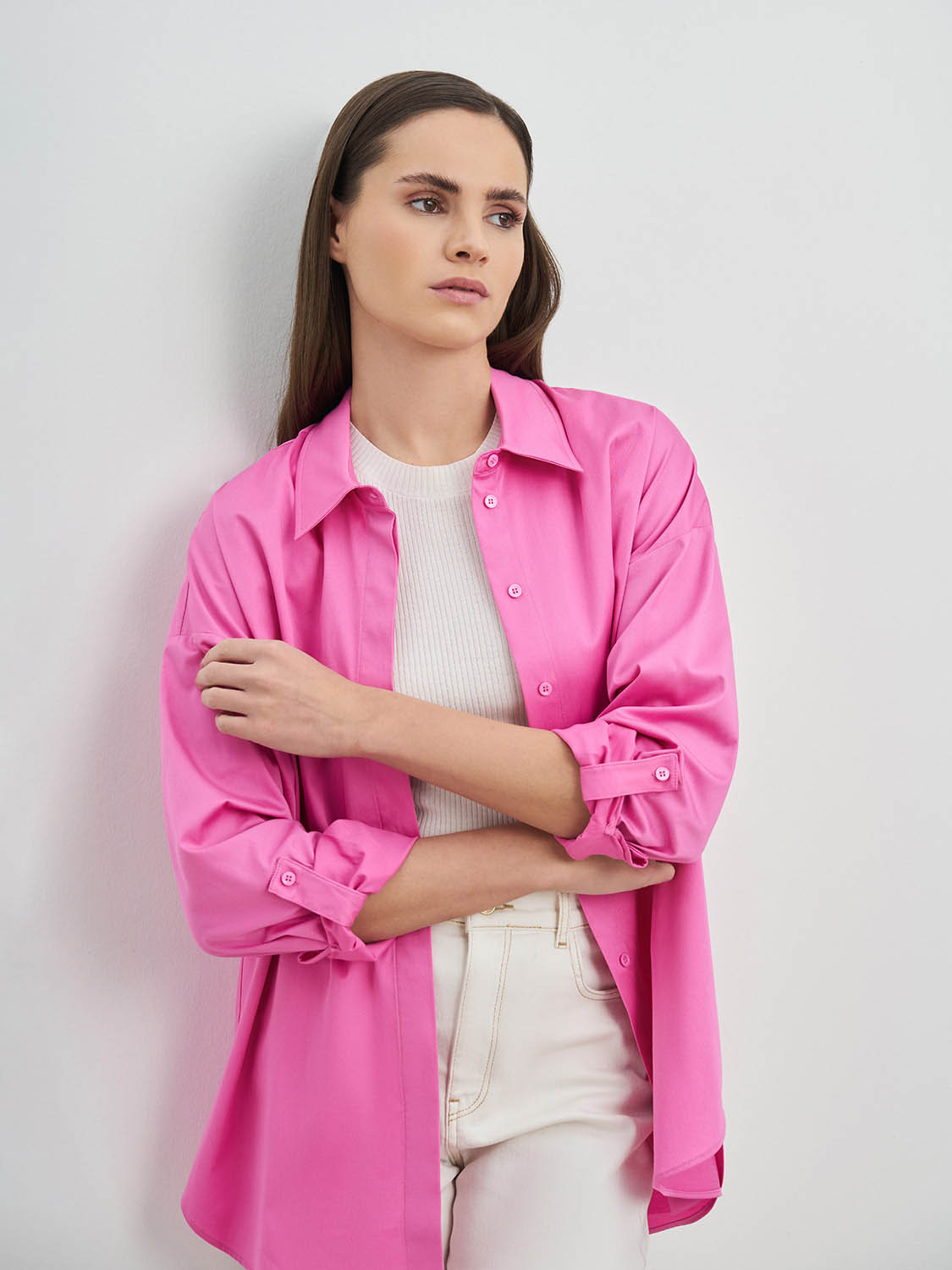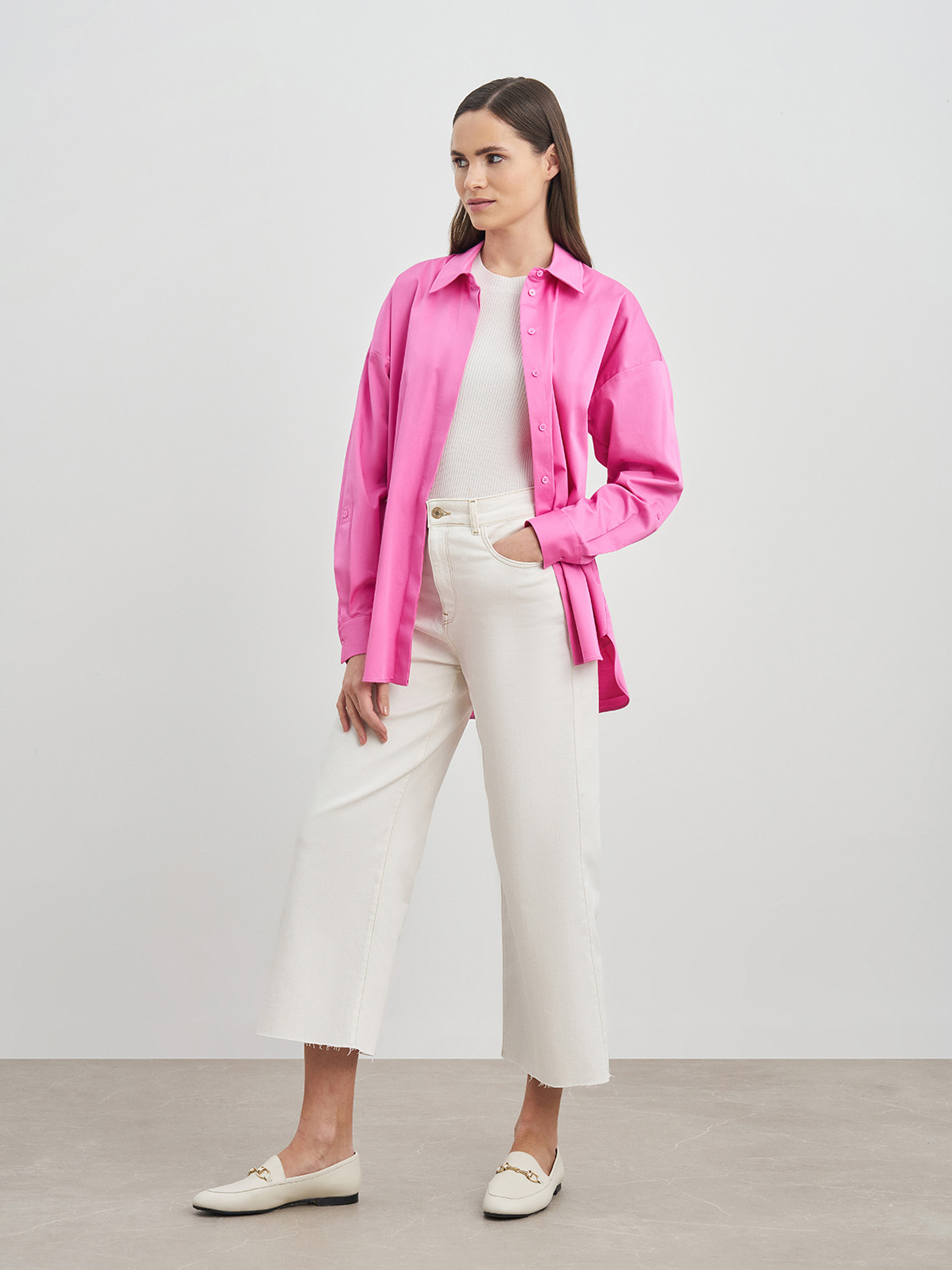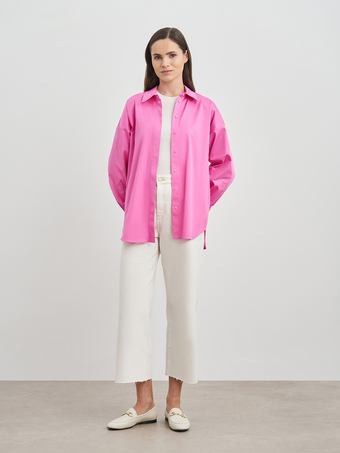 Хлопковая рубашка оверсайз со спущенной линией рукава. Классический ворот, застежка и манжеты на пуговицах, нагрудный карман. Благодаря натуральному составу ткани, рубашка приятна телу, свободно сидит по фигуре и подойдет под любой её тип. Стильно сочетается с кэжуал образами - джинсами, лоферами или кедами, а также с классическими брюками, юбками и жакетами. Универсальный и незаменимый вариант для работы и офиса, деловых встреч и повседневной жизни. На модели размер S. Параметры модели: рост 173, 80-63-91.