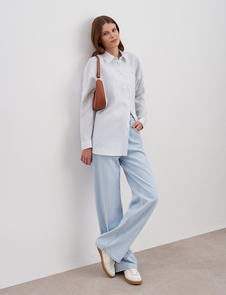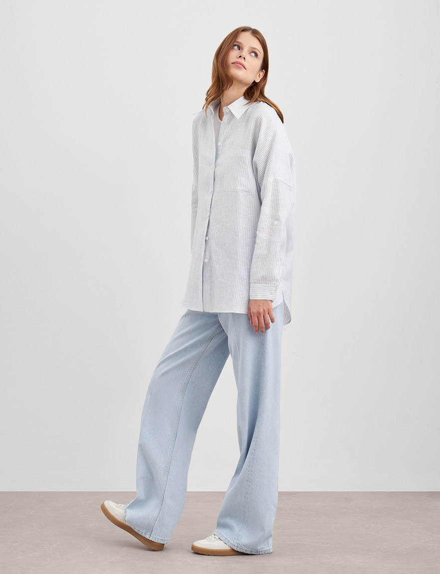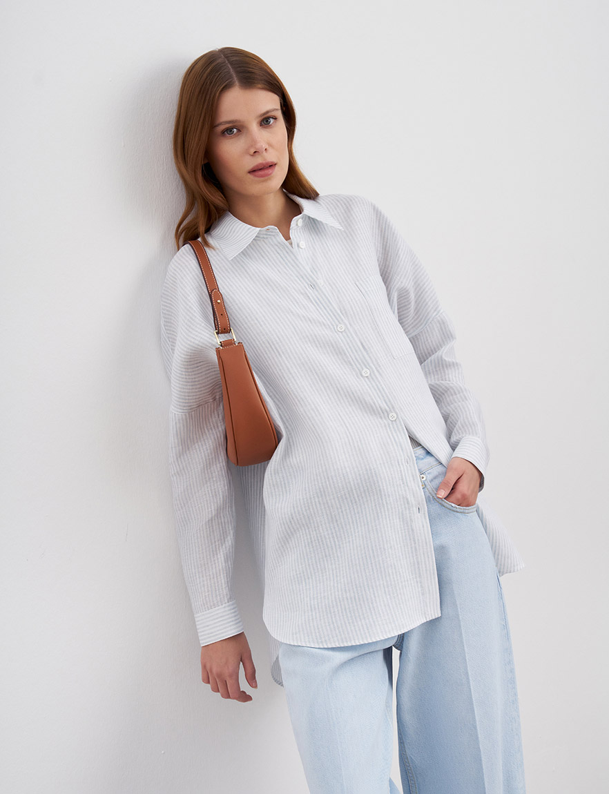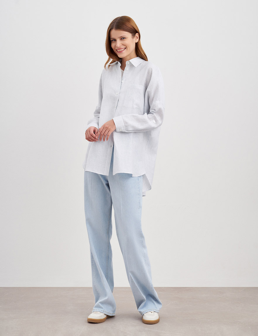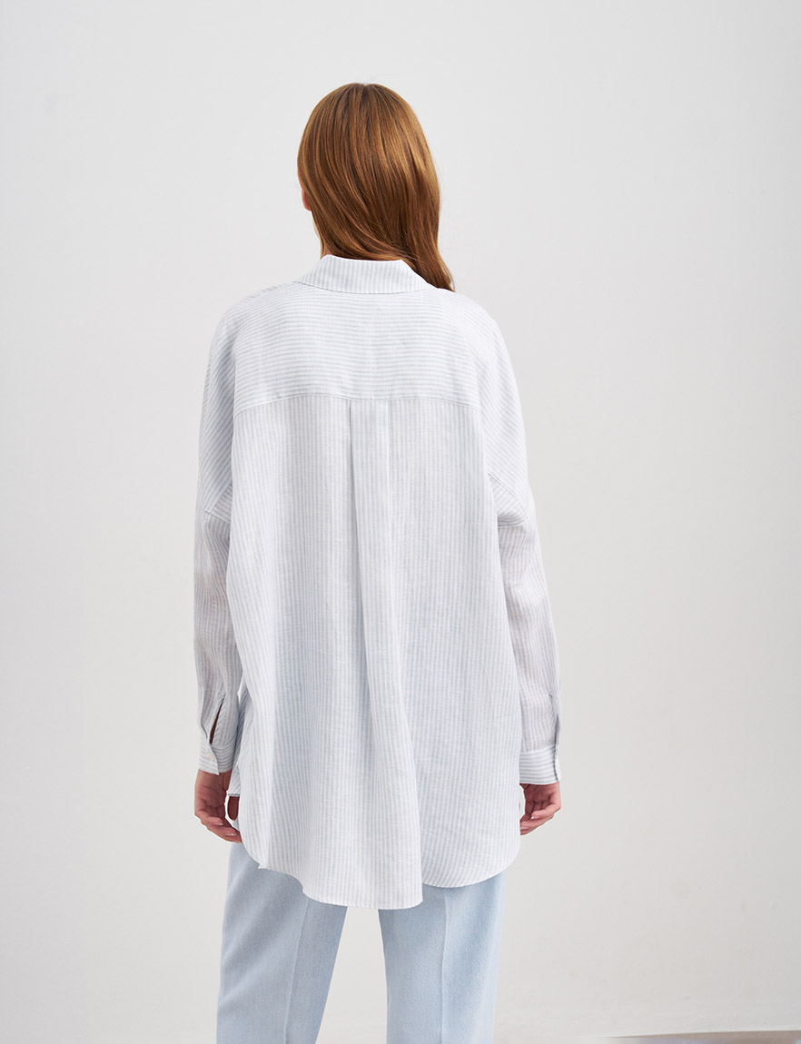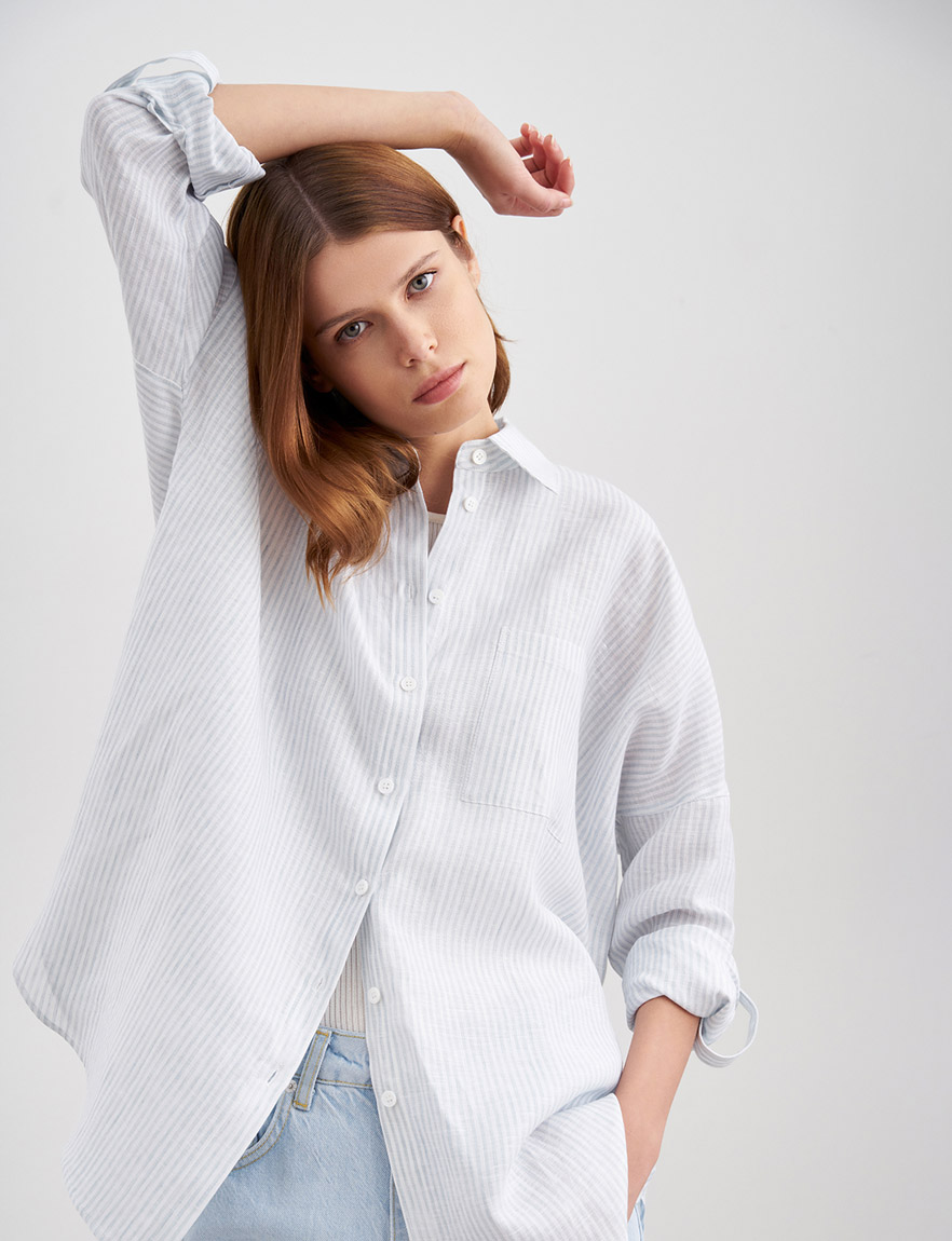 Удлиненная рубашка оверсайз из натурального льна. Длинные рукава с манжетами, которые можно подвернуть в ¾, узор в вертикальную полоску, застежка спереди на пуговицы и нагрудный карман. Ткань легкая и гигроскопичная, благодаря чему в рубашке комфортно даже в самую жаркую погоду. Сочетайте как самостоятельный элемент гардероба с джинсами, кедами или лоферами, так и вторым слоем с топами и футболками для создания повседневных образов и летних прогулок. На модели размер S. Параметры модели: рост 178, 80-60-88.