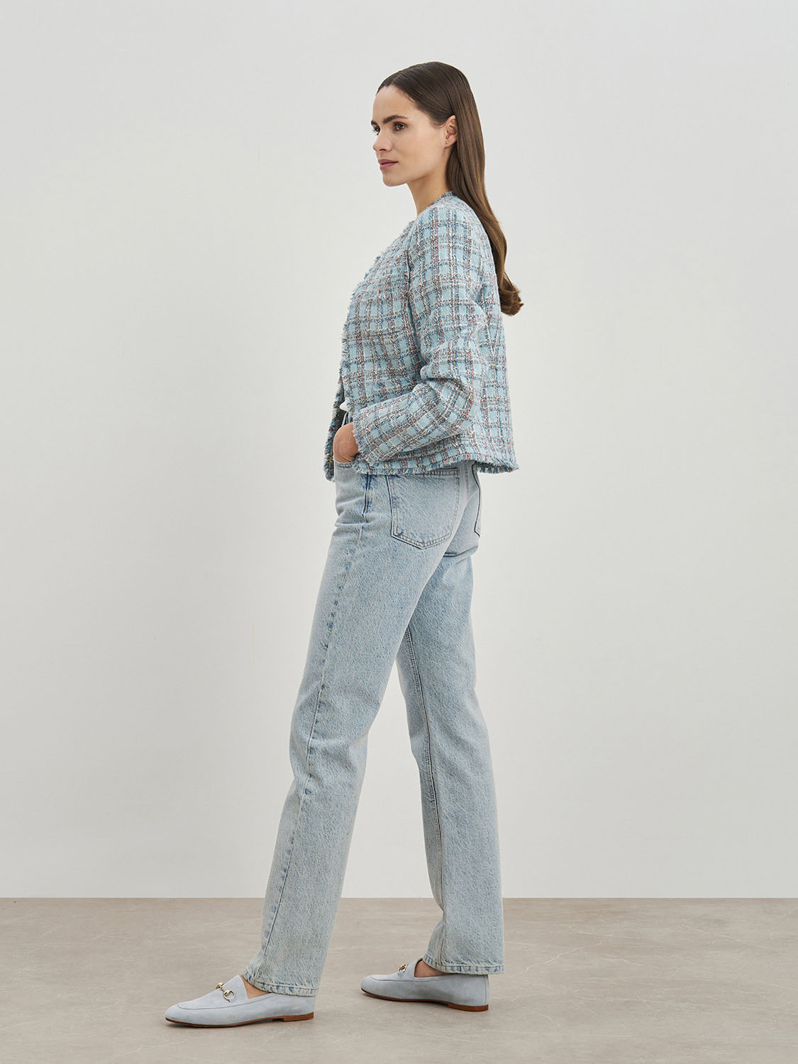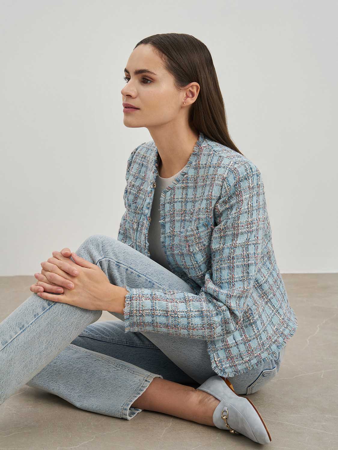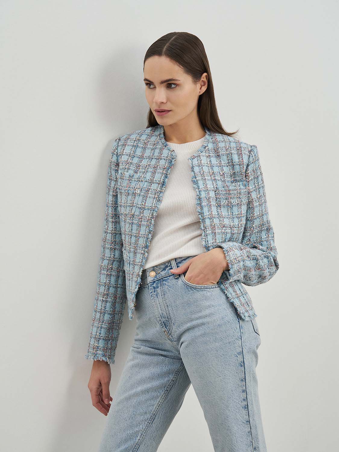 Изящный укороченный жакет из твидовой ткани. Приталенный крой, дышащая подкладка, декоративная бахрома и классический узор в клетку. Жакет добавит изящности в повседневные и деловые образы и отлично подойдет для вечерних мероприятий и торжеств. Сочетайте с твидовой юбкой, платьем или шортами, легкой блузой или топом. На модели размер S. Параметры модели: рост 173, 80-63-91.