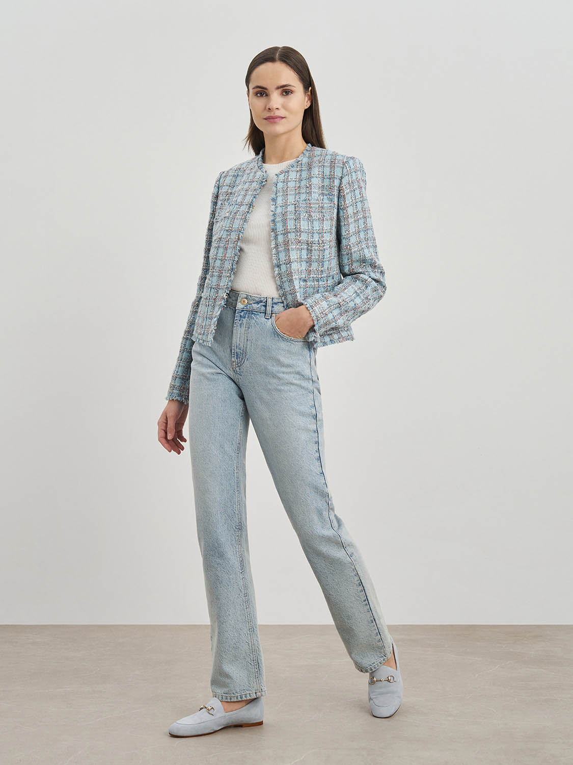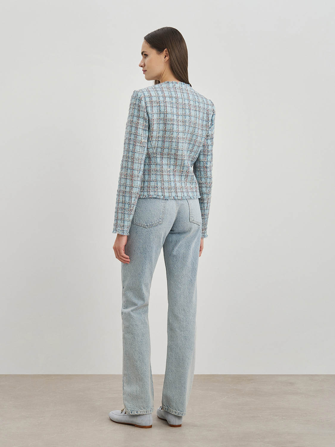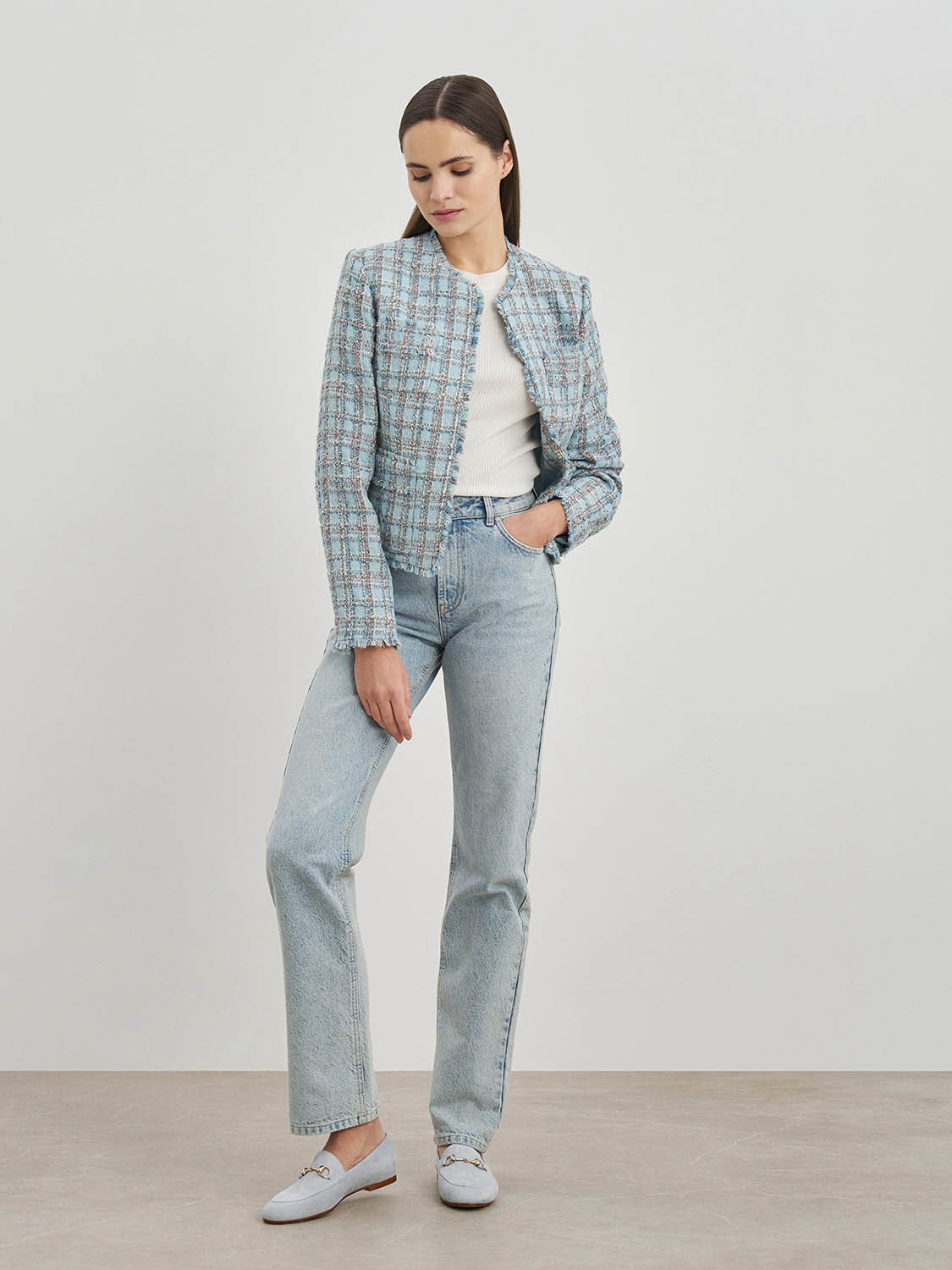 Изящный укороченный жакет из твидовой ткани. Приталенный крой, дышащая подкладка, декоративная бахрома и классический узор в клетку. Жакет добавит изящности в повседневные и деловые образы и отлично подойдет для вечерних мероприятий и торжеств. Сочетайте с твидовой юбкой, платьем или шортами, легкой блузой или топом. На модели размер S. Параметры модели: рост 173, 80-63-91.