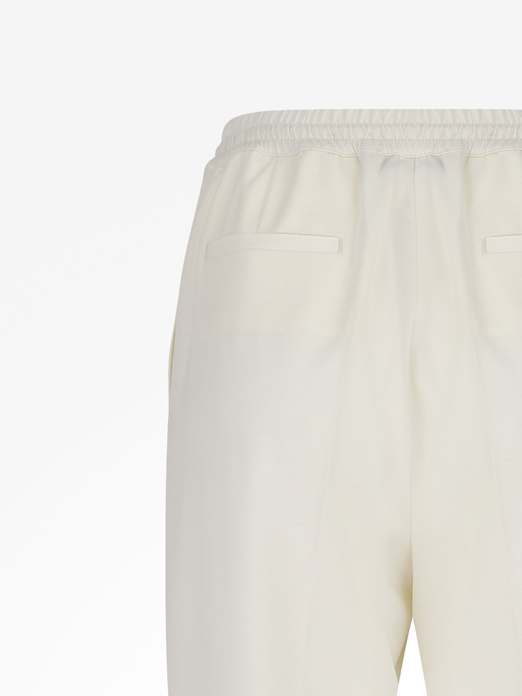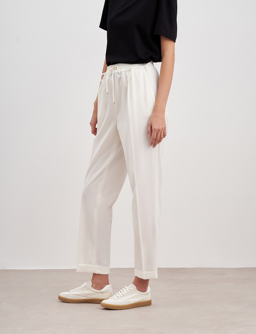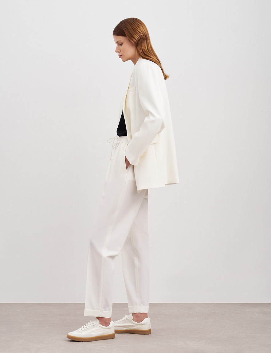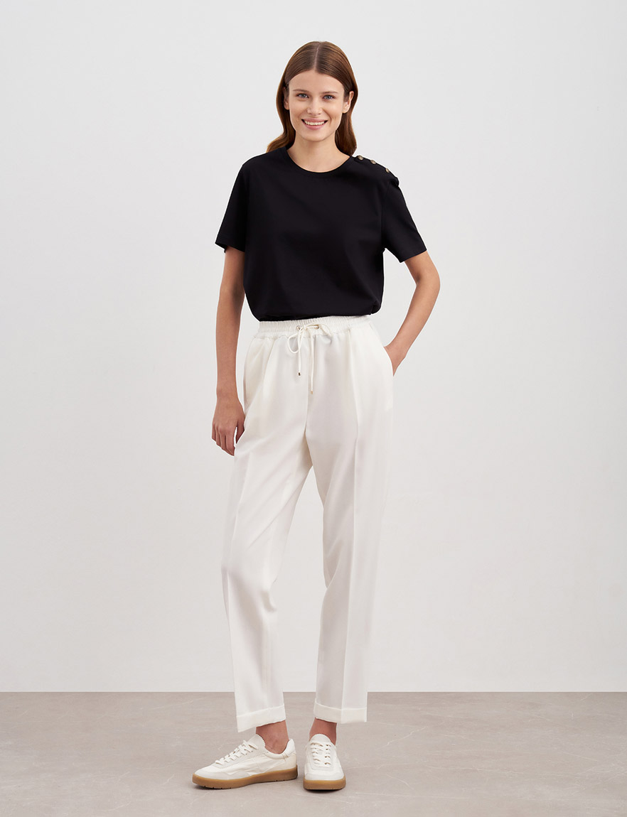 Комфортные брюки прямого кроя на резинке с кулиской. Классические стрелки с защипами, боковые прорезные карманы, легкая смесовая ткань с вискозой и шерстью, благодаря которой брюки не растягиваются, сохраняют форму и не требуют сложного ухода. Сочетайте с топами, блузами, жакетами, лоферами или босоножками. На модели размер S. Параметры модели: рост 178, 80-60-88.