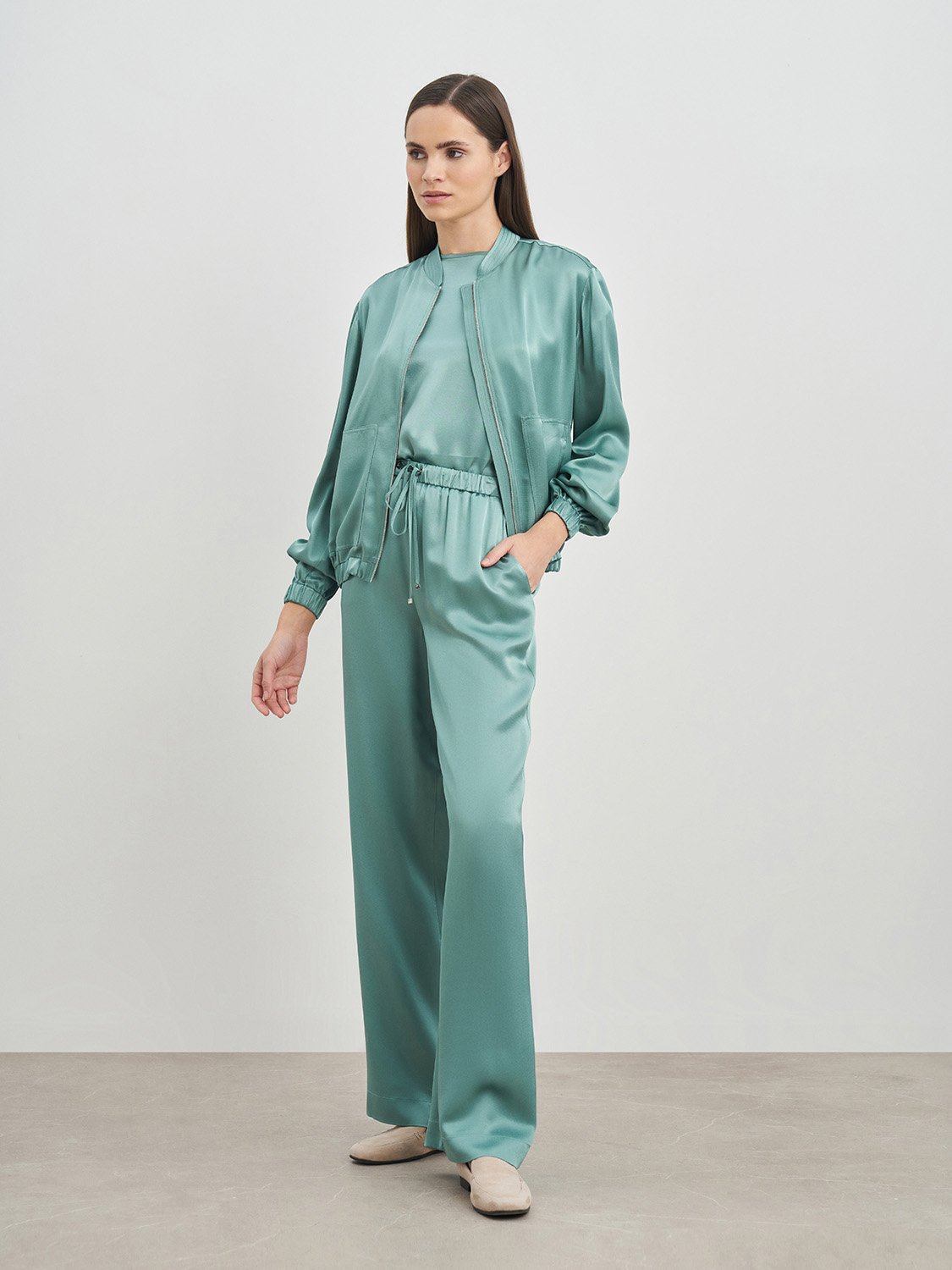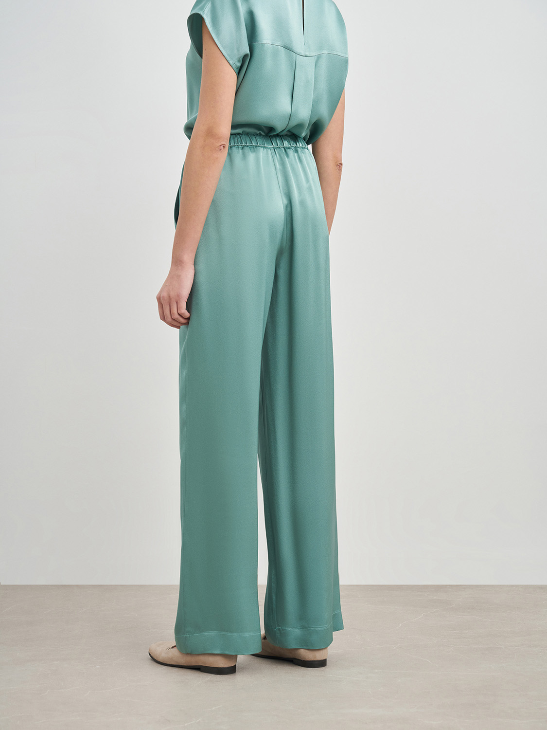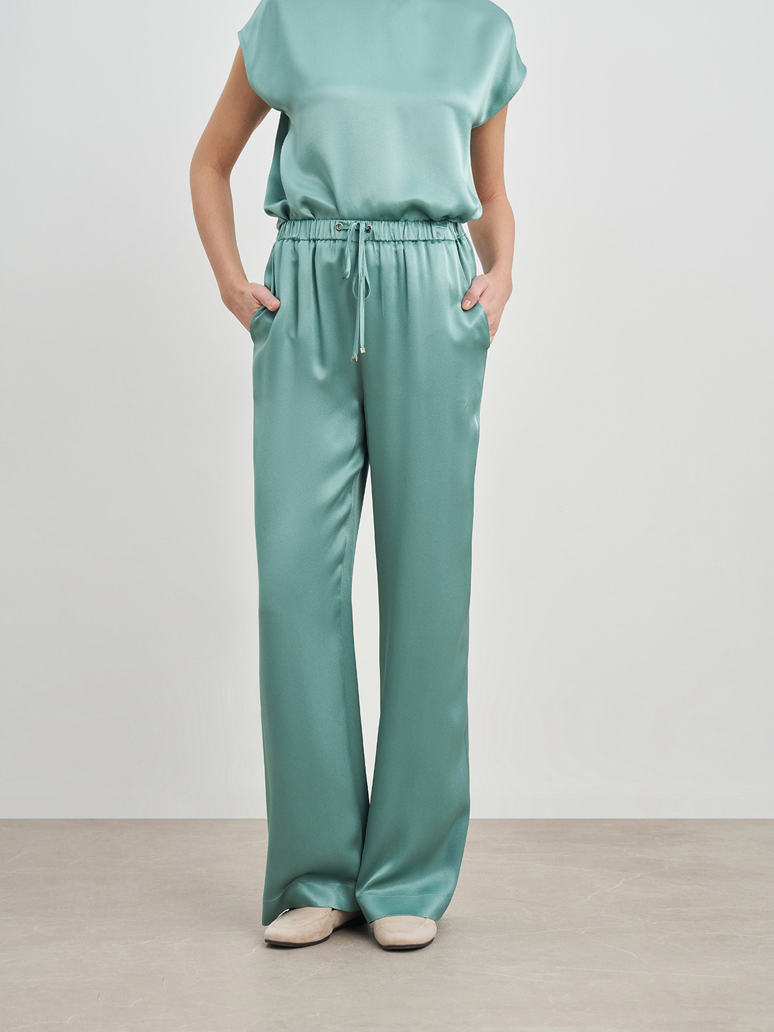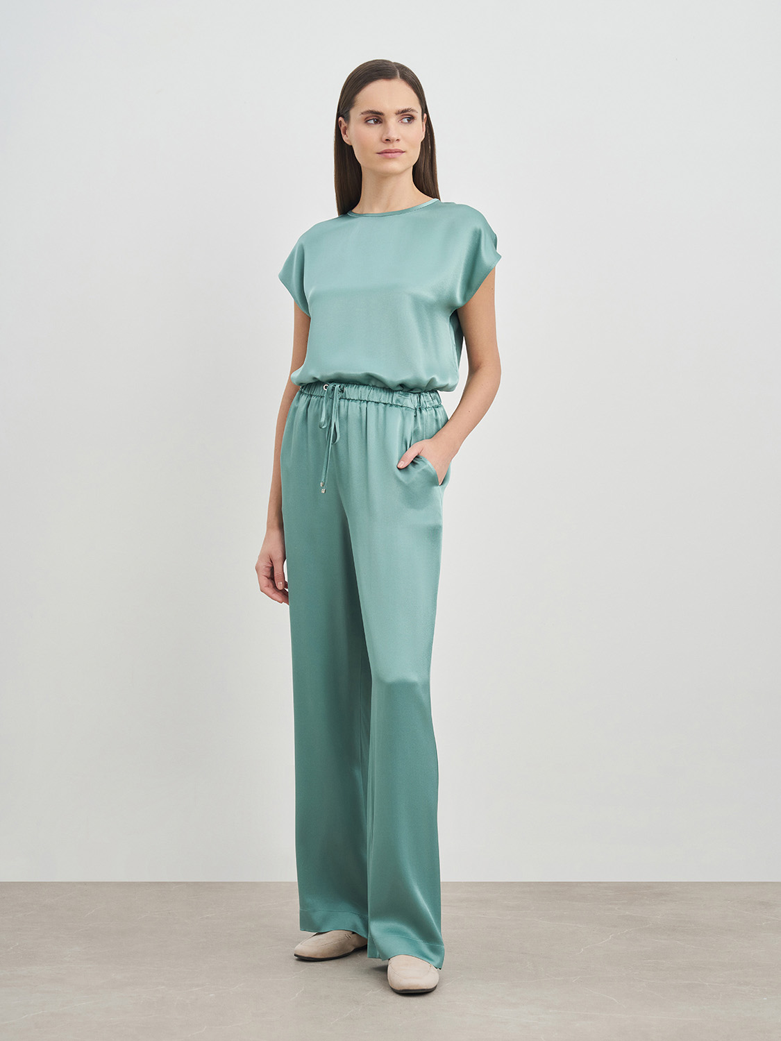 Атласные брюки-палаццо из струящейся вискозы. Высокая посадка, комфортная резинка на поясе с кулиской, боковые карманы. Брюки свободно сидят по фигуре, не сковывают движения, не вытягиваются и не теряют форму со временем. Дополнить образ можно атласным бомбером или блузой, футболкой или топом, босоножками или кедами. На модели размер S. Параметры модели: рост 174, 84-63-88.