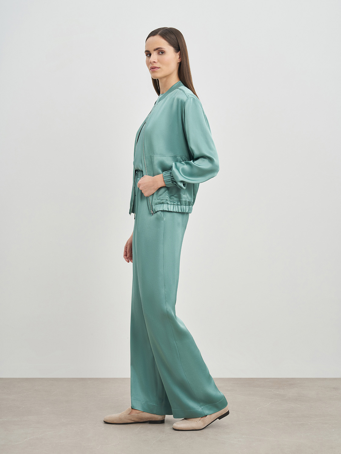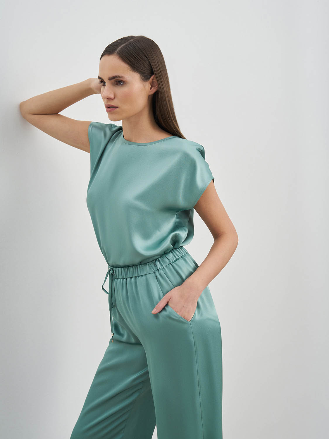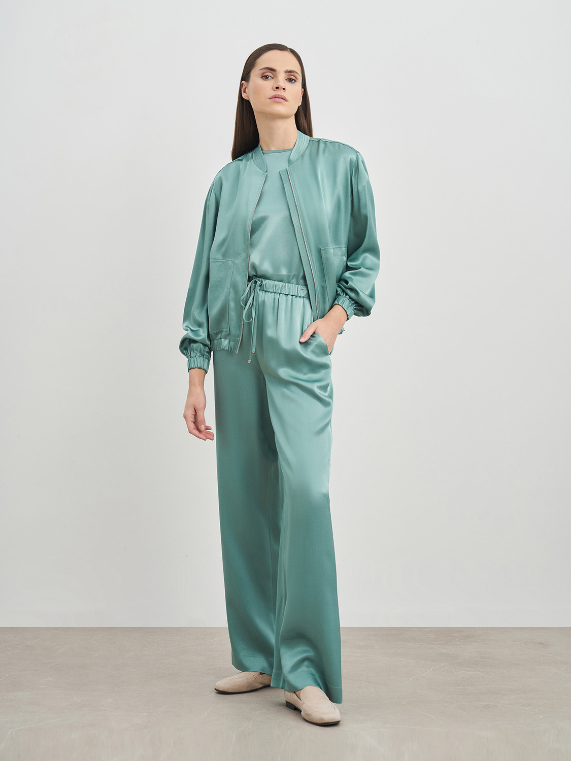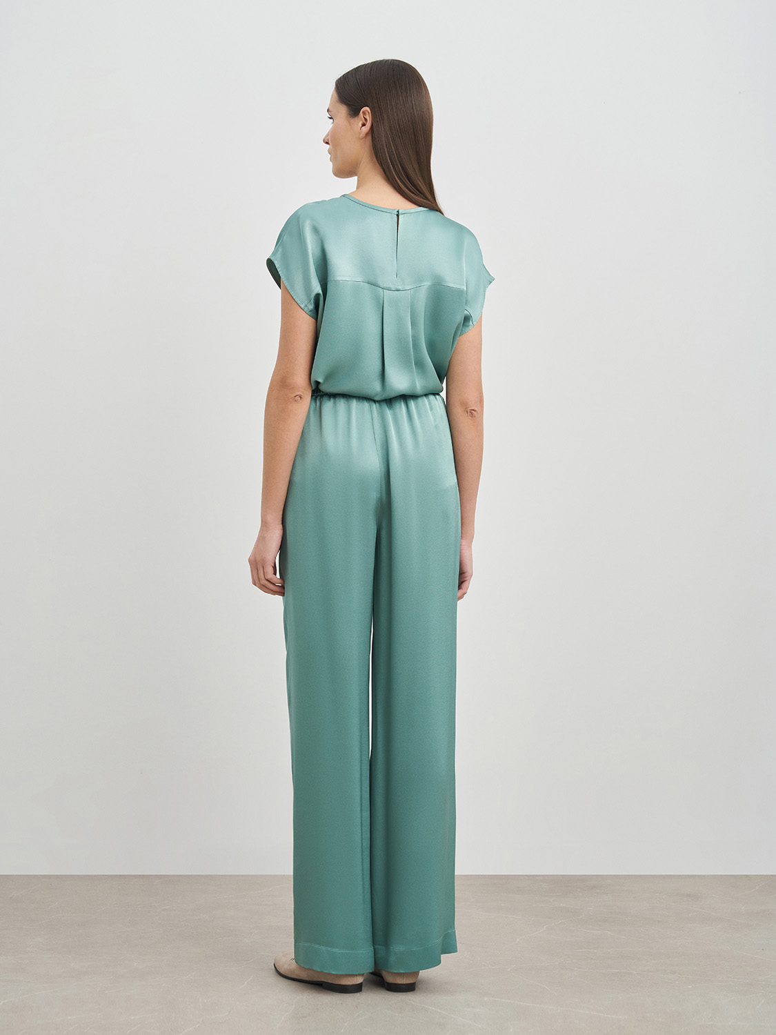 Атласные брюки-палаццо из струящейся вискозы. Высокая посадка, комфортная резинка на поясе с кулиской, боковые карманы. Брюки свободно сидят по фигуре, не сковывают движения, не вытягиваются и не теряют форму со временем. Дополнить образ можно атласным бомбером или блузой, футболкой или топом, босоножками или кедами. На модели размер S. Параметры модели: рост 174, 84-63-88.