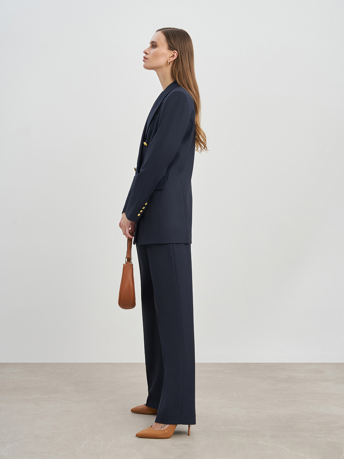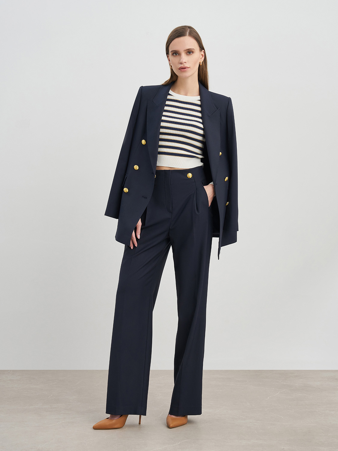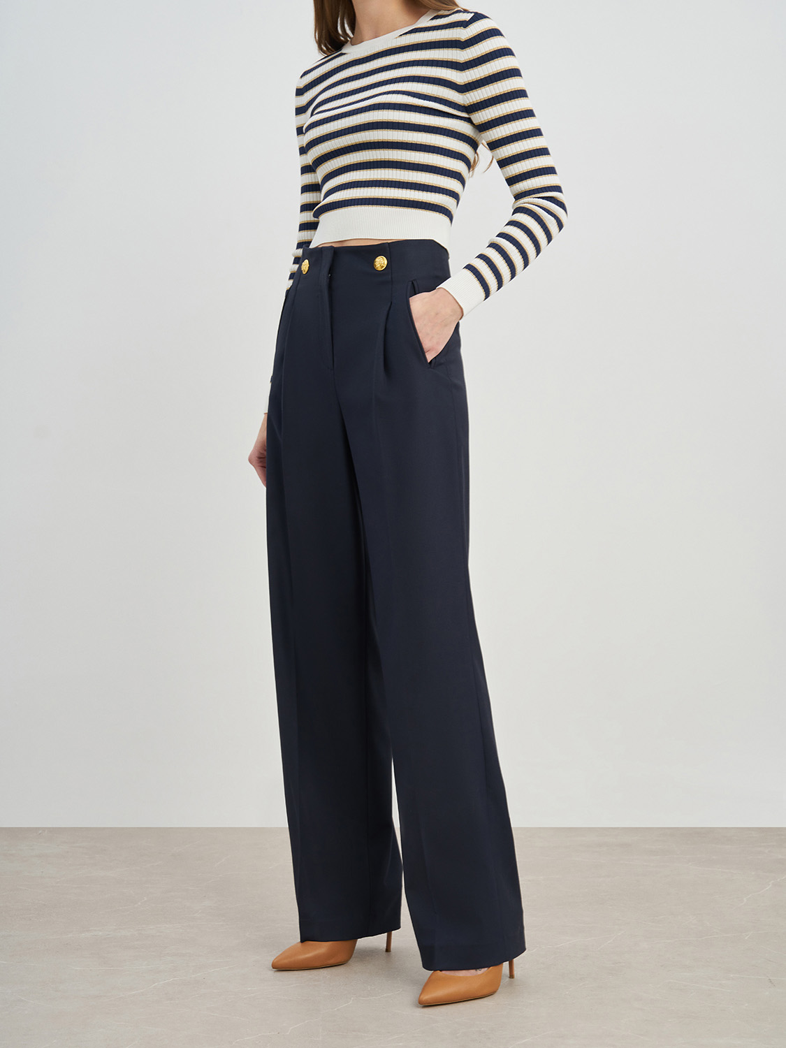 Элегантные брюки свободного кроя. Комфортная посадка, застежка на молнию, декоративные пуговицы, классические стрелки и защипы. Благодаря смесовому составу из вискозы и дышащего полиэстра - не сковывают движения и приятны на ощупь и коже, не закатываются и не собираются. Подойдут для повседневных и рабочих образов, для деловых встреч и вечерних мероприятий. Образ дополнит базовый топ или блуза, жакет в цвет, классические лодочки или ботильоны. На модели размер S. Параметры модели: рост 173, 80-63-91.