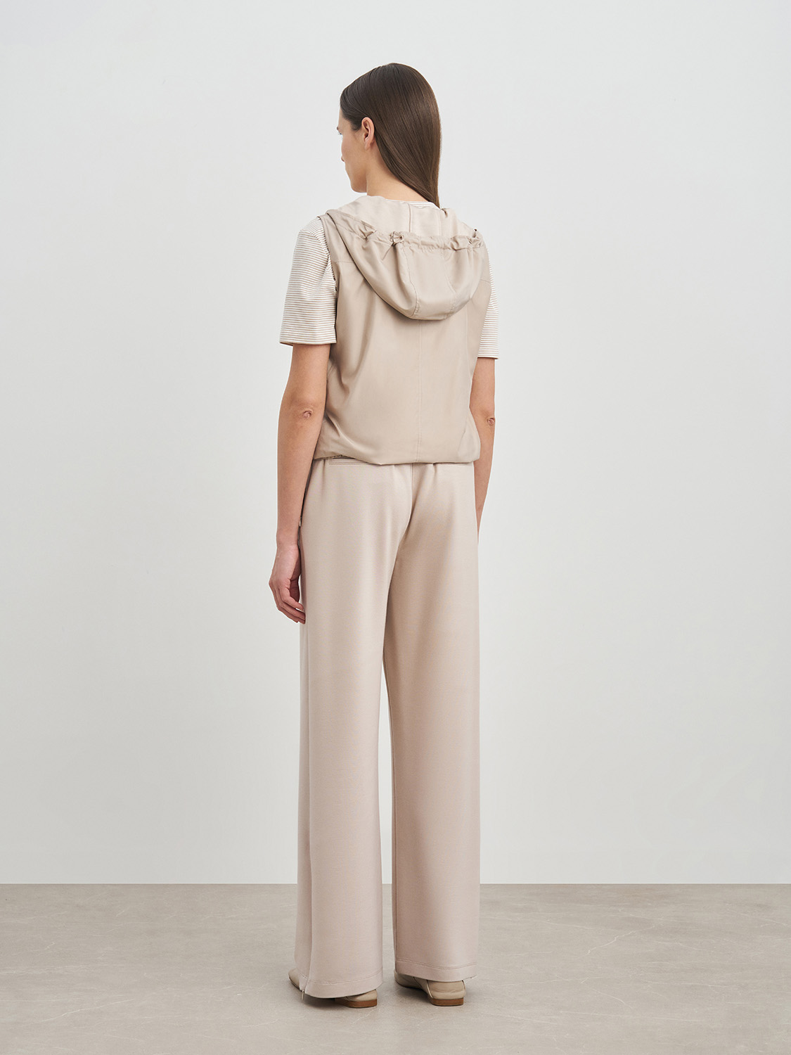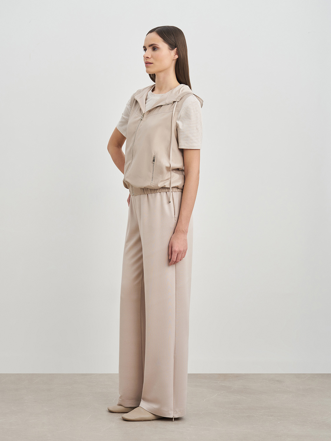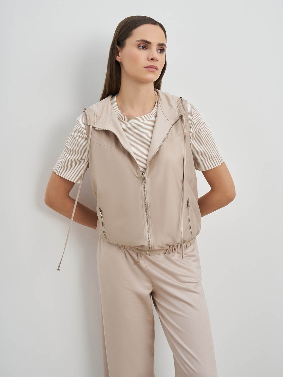 Легкая жилетка с капюшоном. Застежка на молнию, прорезные карманы, кулиска в капюшоне и комфортная резинка по низу, благодаря которым жилетка не продувается и защищает от ветра. Ткань и подкладка из дышащей вискозы и полиэстера, сохраняет свой первоначальный вид и не деформируется. Жилетка сочетается с базовыми кэжуал образами- джинсами, прямыми брюками, футболками, водолазками и кедами. На модели размер S. Параметры модели: рост 177, 175, 80-60-88.