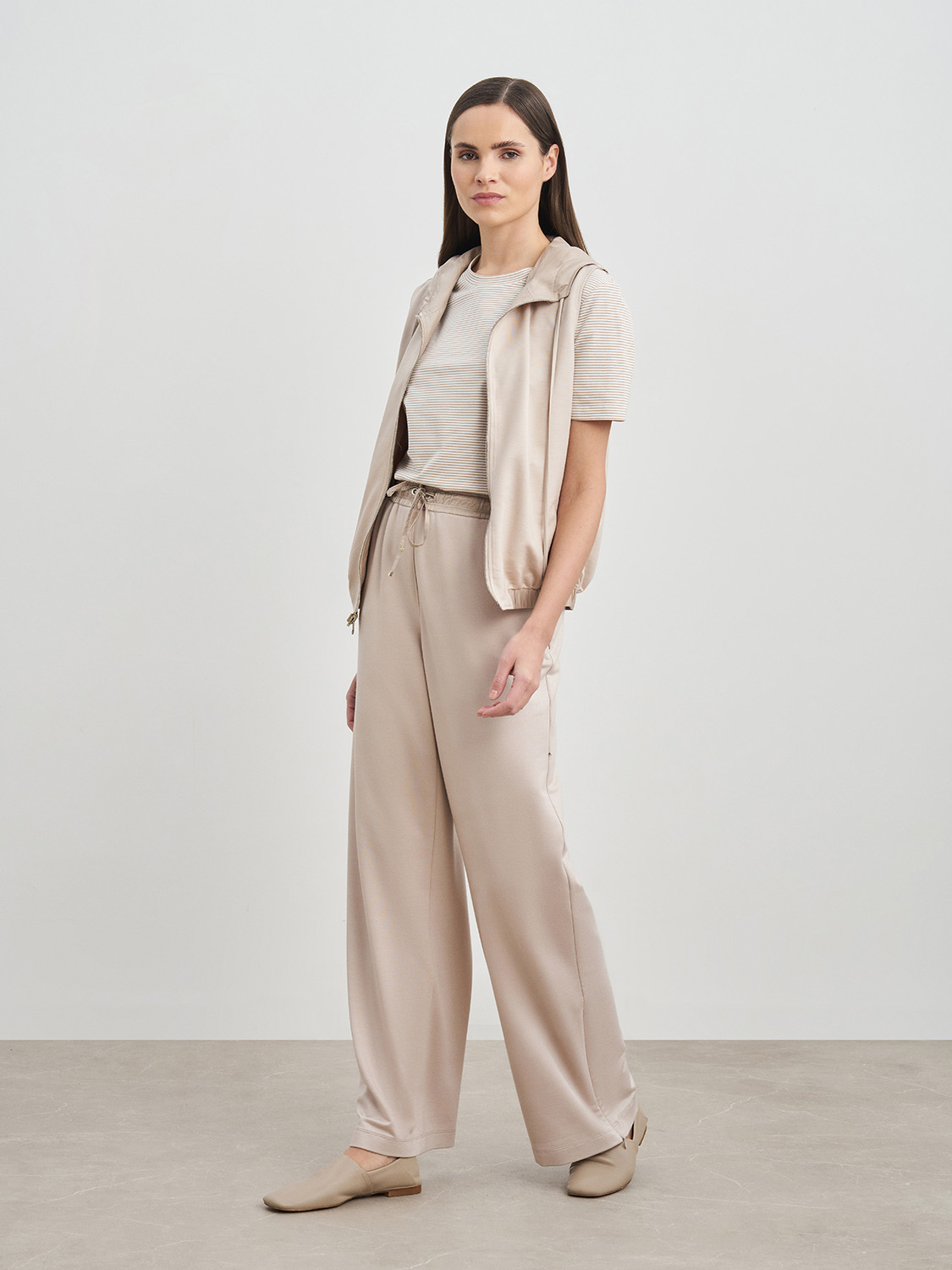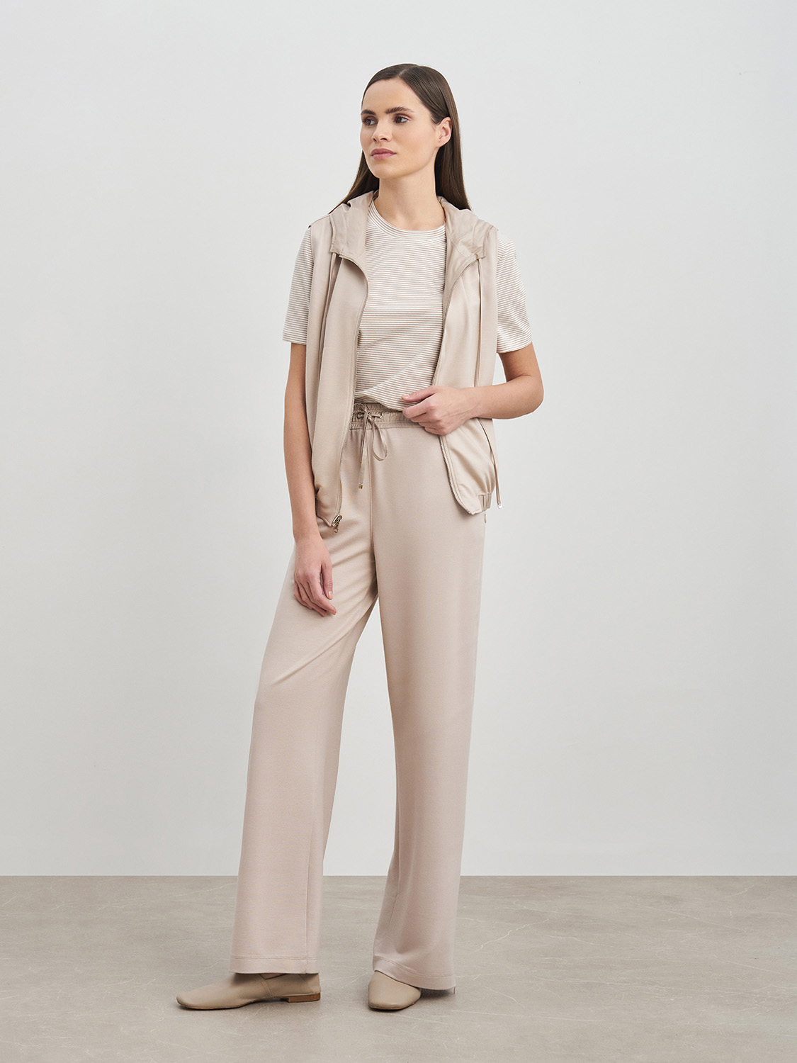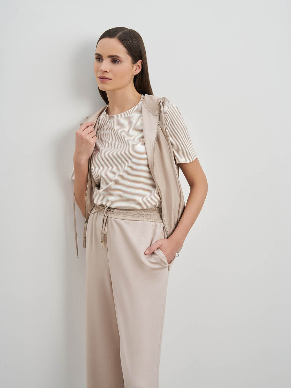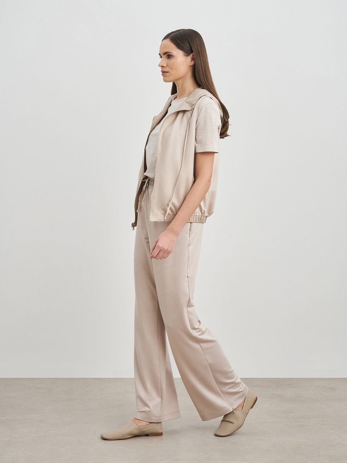 Легкая жилетка с капюшоном. Застежка на молнию, прорезные карманы, кулиска в капюшоне и комфортная резинка по низу, благодаря которым жилетка не продувается и защищает от ветра. Ткань и подкладка из дышащей вискозы и полиэстера, сохраняет свой первоначальный вид и не деформируется. Жилетка сочетается с базовыми кэжуал образами- джинсами, прямыми брюками, футболками, водолазками и кедами. На модели размер S. Параметры модели: рост 177, 175, 80-60-88.