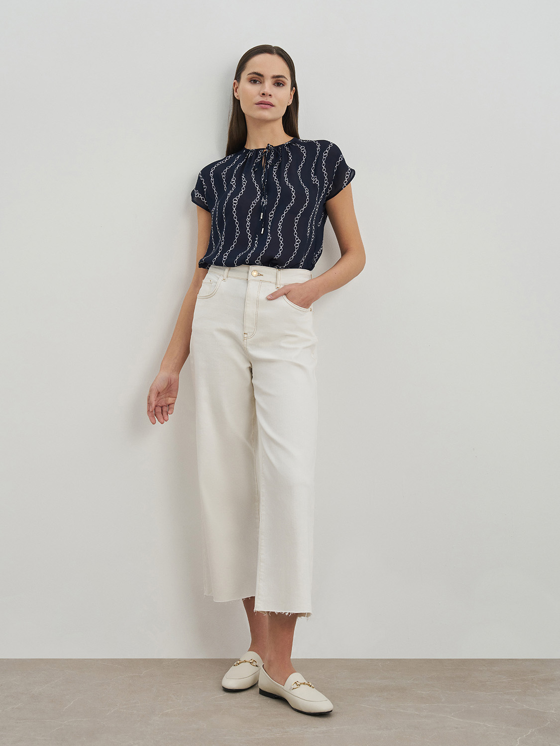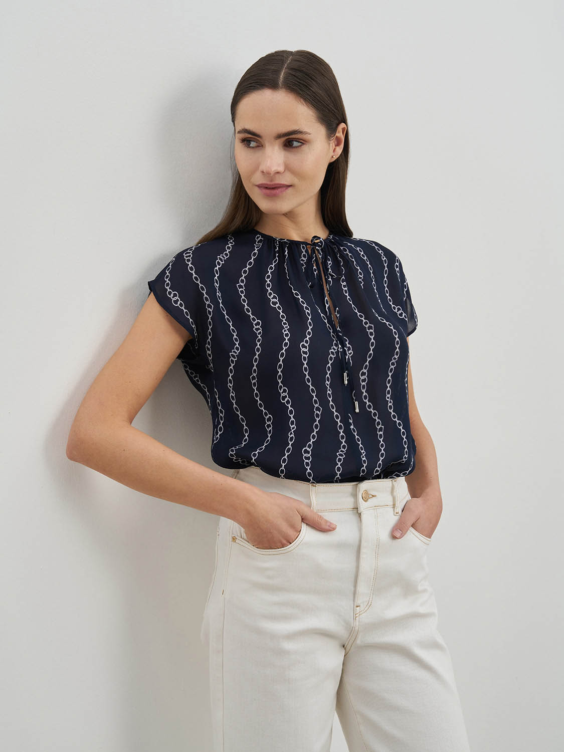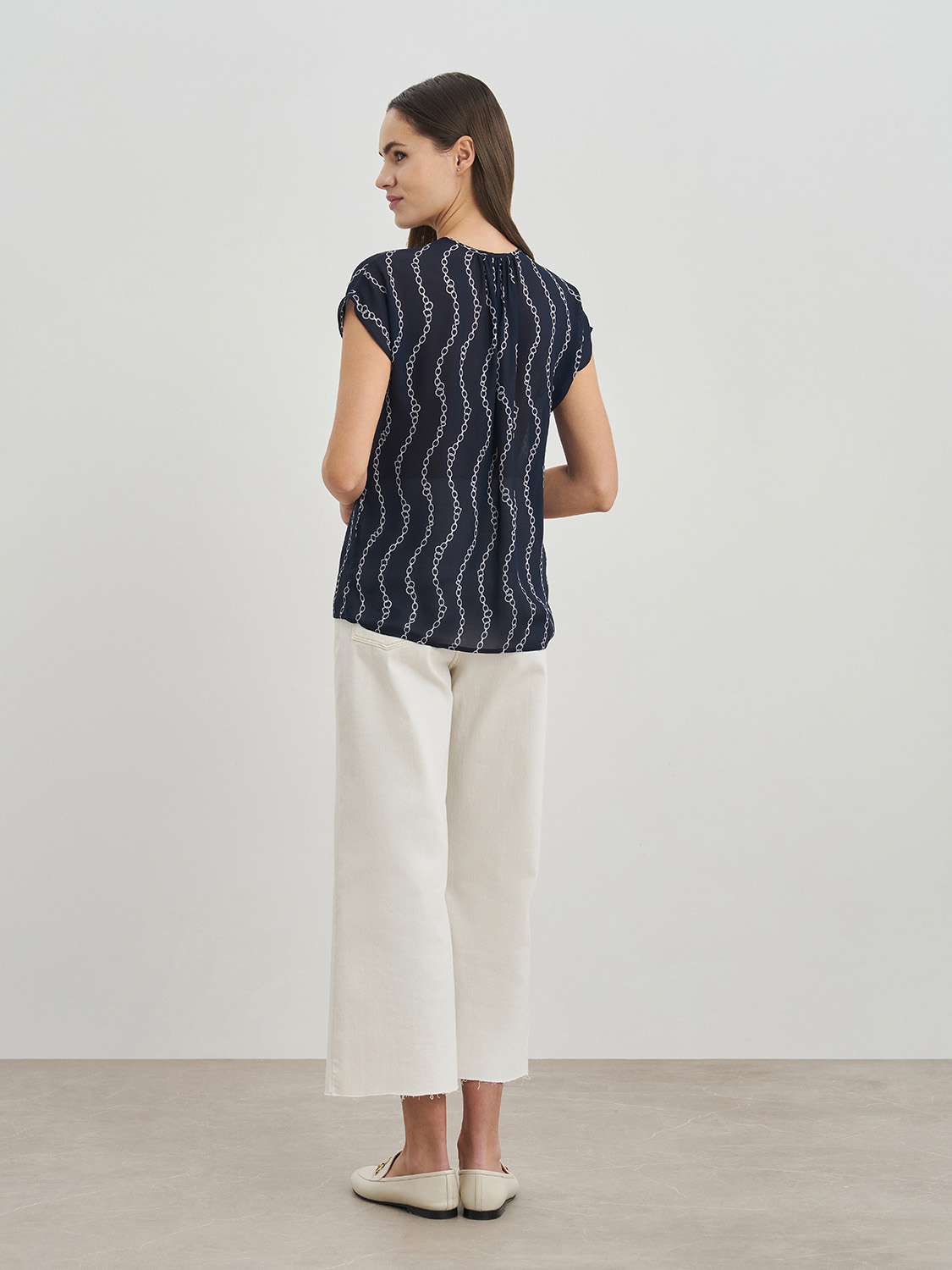 Легкая блуза с короткими рукавами. Прямой крой, ворот с кулиской, минималистичный узор. Невесомая ткань из вискозы без подкладки, благодаря которой в блузе комфортно даже в жаркую погоду. Образ дополнят джинсы, брюки или юбки, блуза подойдет первым слоем под жакеты. На модели размер S. Параметры модели: рост 174, 84-63-88.