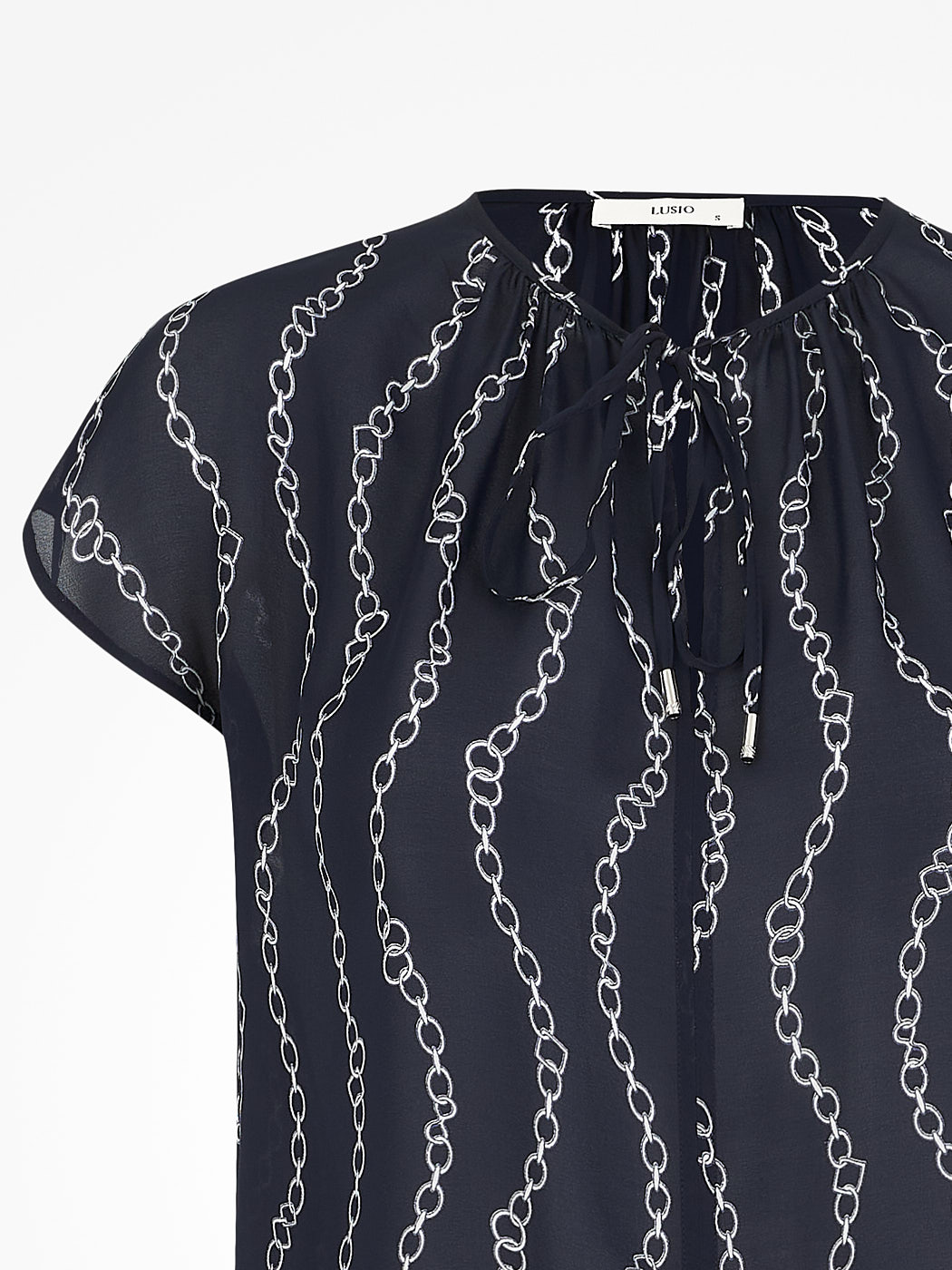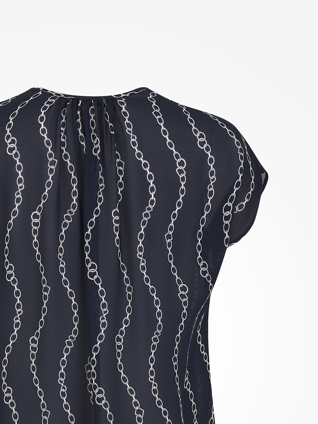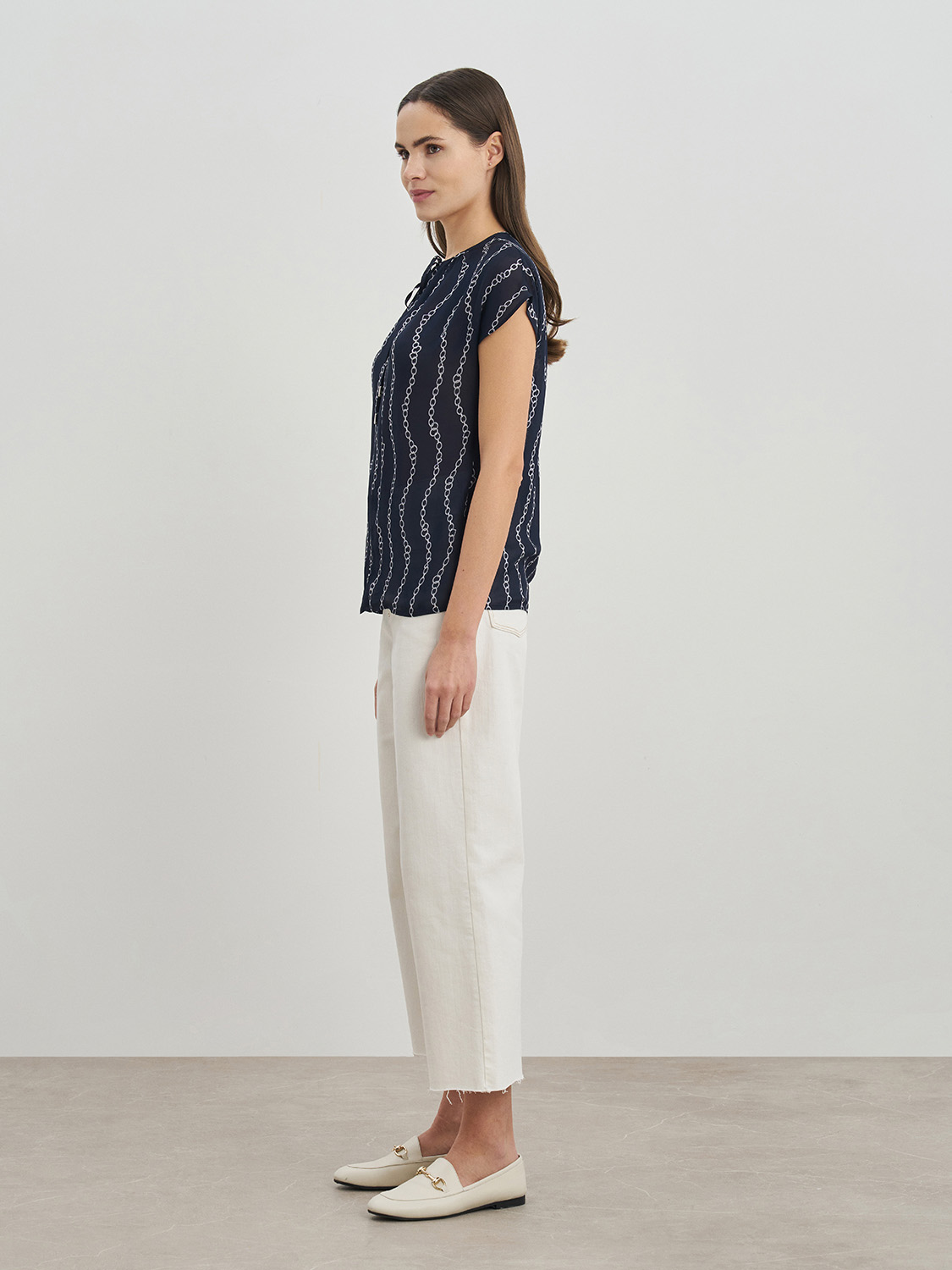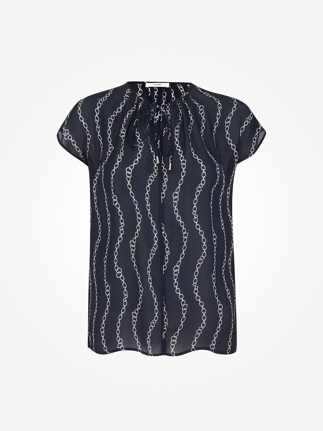 Легкая блуза с короткими рукавами. Прямой крой, ворот с кулиской, минималистичный узор. Невесомая ткань из вискозы без подкладки, благодаря которой в блузе комфортно даже в жаркую погоду. Образ дополнят джинсы, брюки или юбки, блуза подойдет первым слоем под жакеты. На модели размер S. Параметры модели: рост 174, 84-63-88.