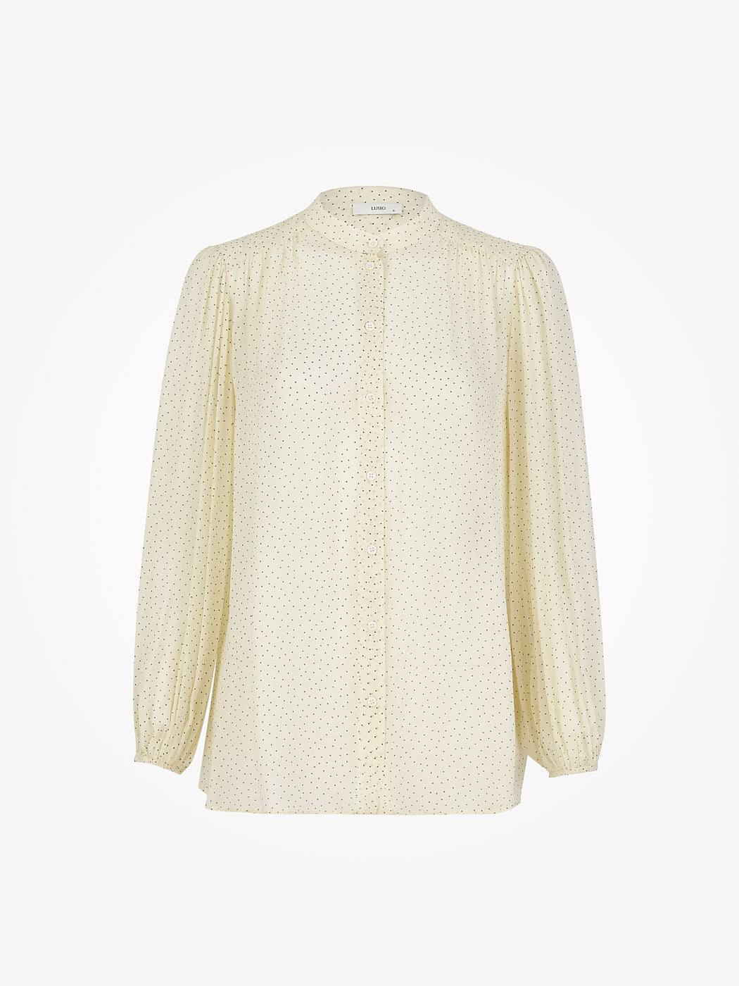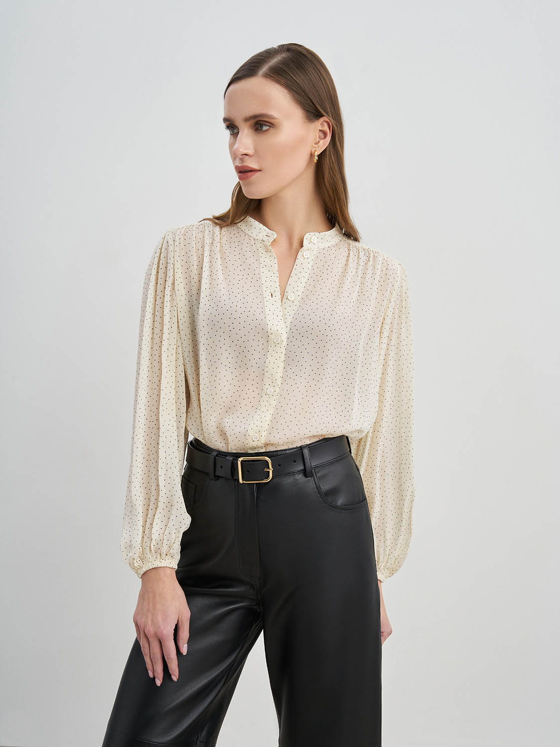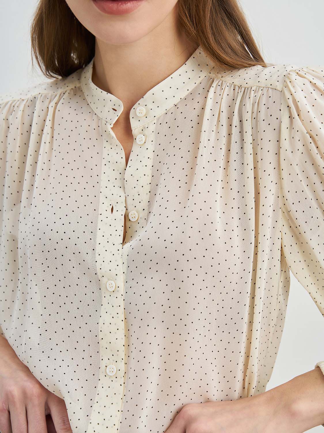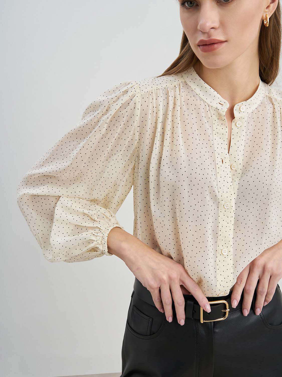 Блуза свободного кроя из вискозы. Актуальный узор в горошек, манжеты на рукавах, застежка спереди на пуговицы, воротник-стойка, без подкладки. Можно носить поверх топов, заправленной и навыпуск. Блузу легко сочетать с базовыми вещами-джинсами или брюками, юбками, туфлями-лодочками или ботильонами. Дополнит как рабочий и офисный образ на каждый день, так и вечерний и деловой. На модели размер S. Параметры модели: рост 173, 80-63-91.