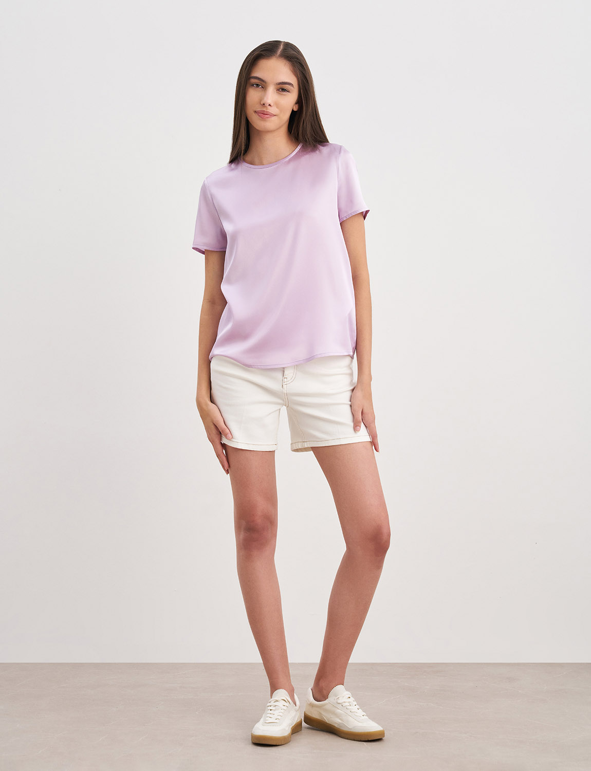 Лаконичная шелковая блуза с коротким рукавом станет элегантной альтернативой базовым футболкам. Нежнейший шелк приятен к телу и обеспечивает комфорт и мягкость. Свободный крой и круглый вырез горловины создают легкий и непринужденный стиль. Сочетайте блузу с джинсами, юбками или шортами для создания расслабленных и утонченных аутфитов. На модели размер S. Параметры модели: рост 174 см, 82-60-89.