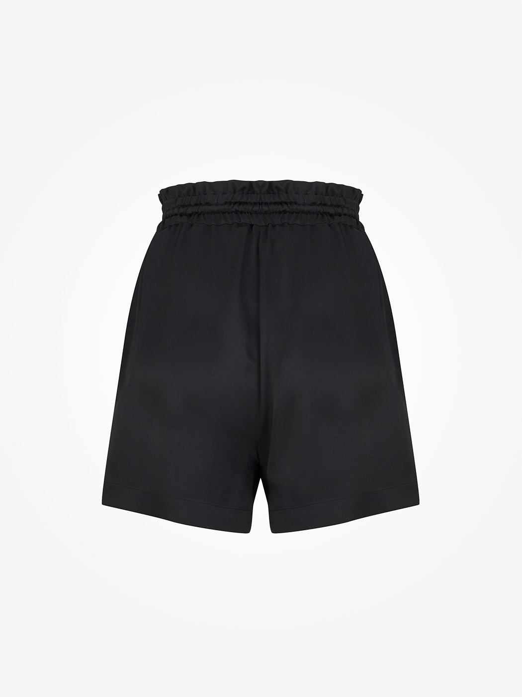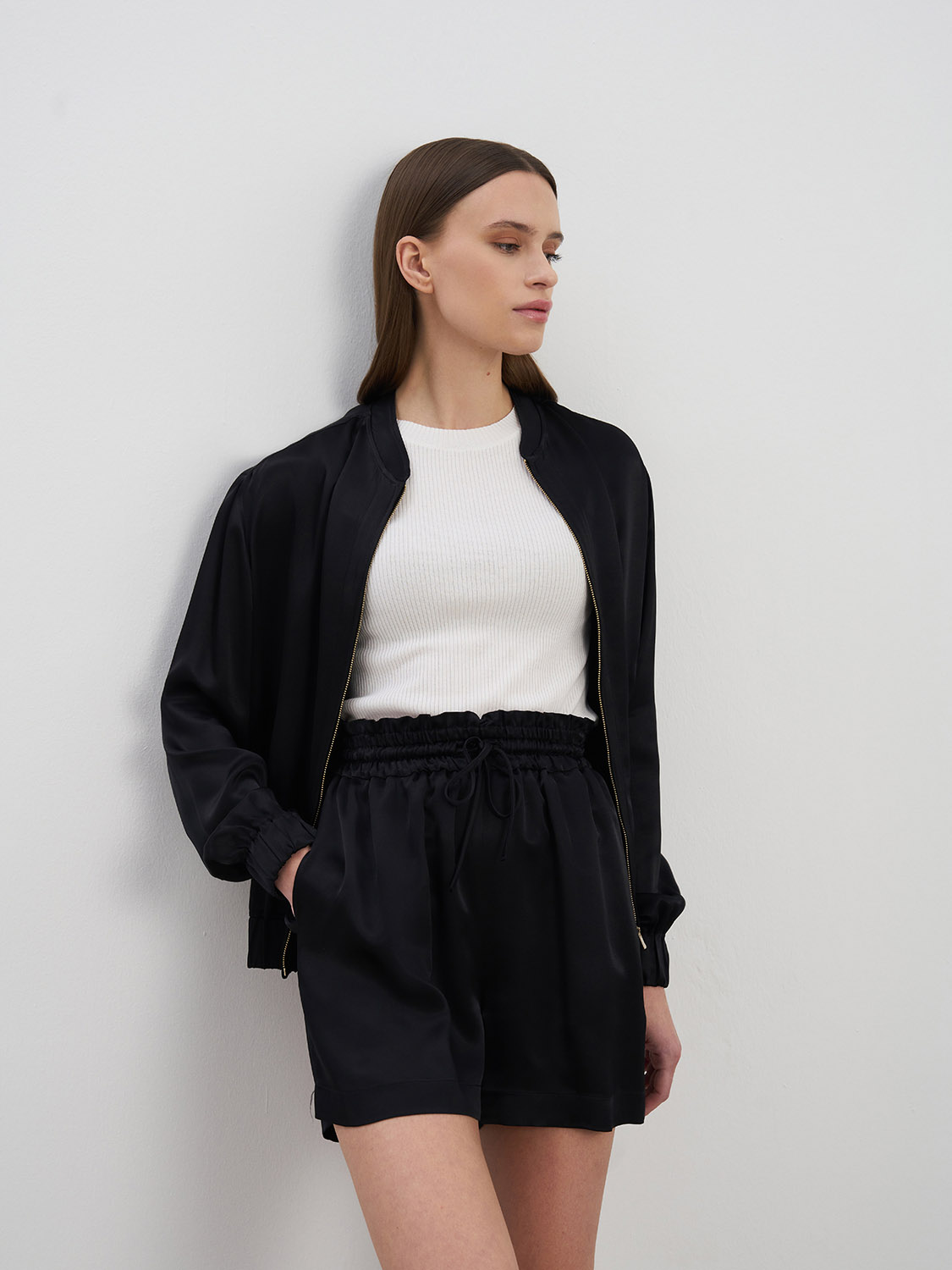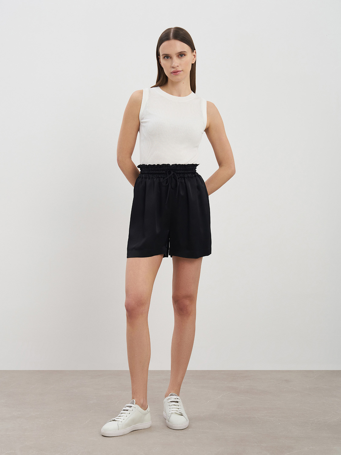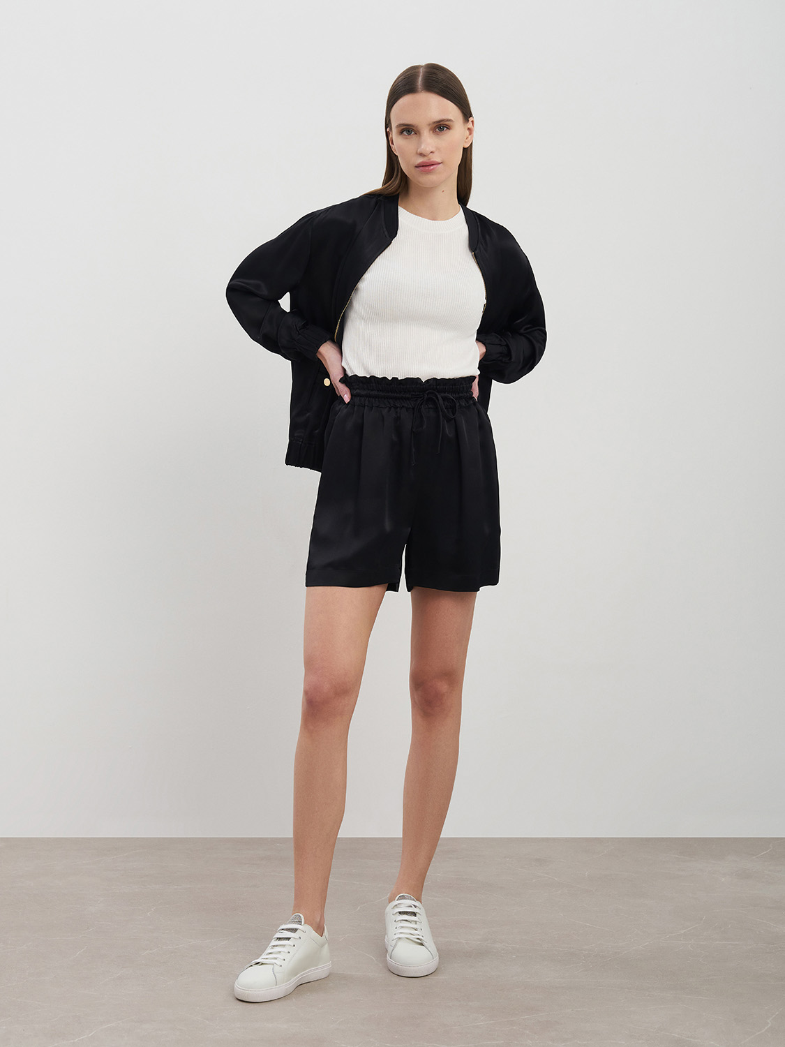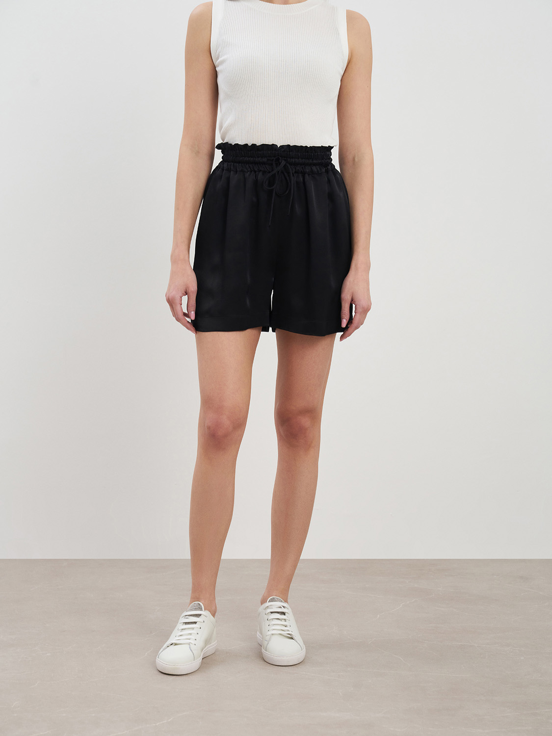 Атласные шорты свободного кроя из мягкой вискозы. Комфортная резинка с кулиской на талии, боковые прорезные карманы, мягкая и приятная телу ткань с деликатным сиянием. Шорты дополнят летние расслабленные образы с топами, футболками, атласным бомбером и кедами. На модели размер S. Параметры модели: рост 173, 80-63-91.