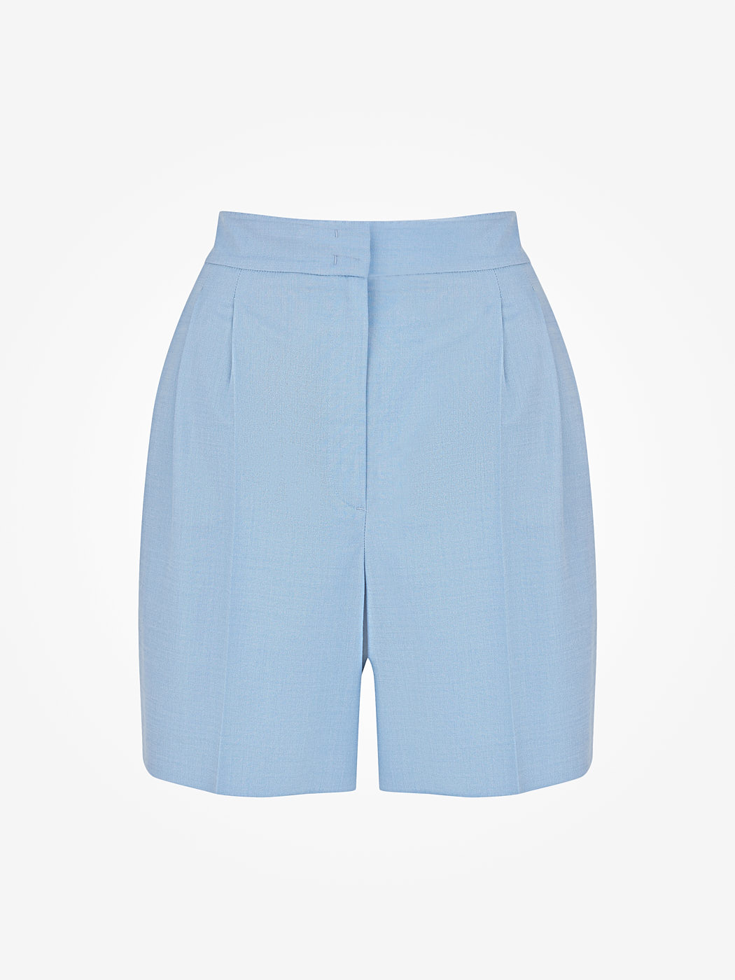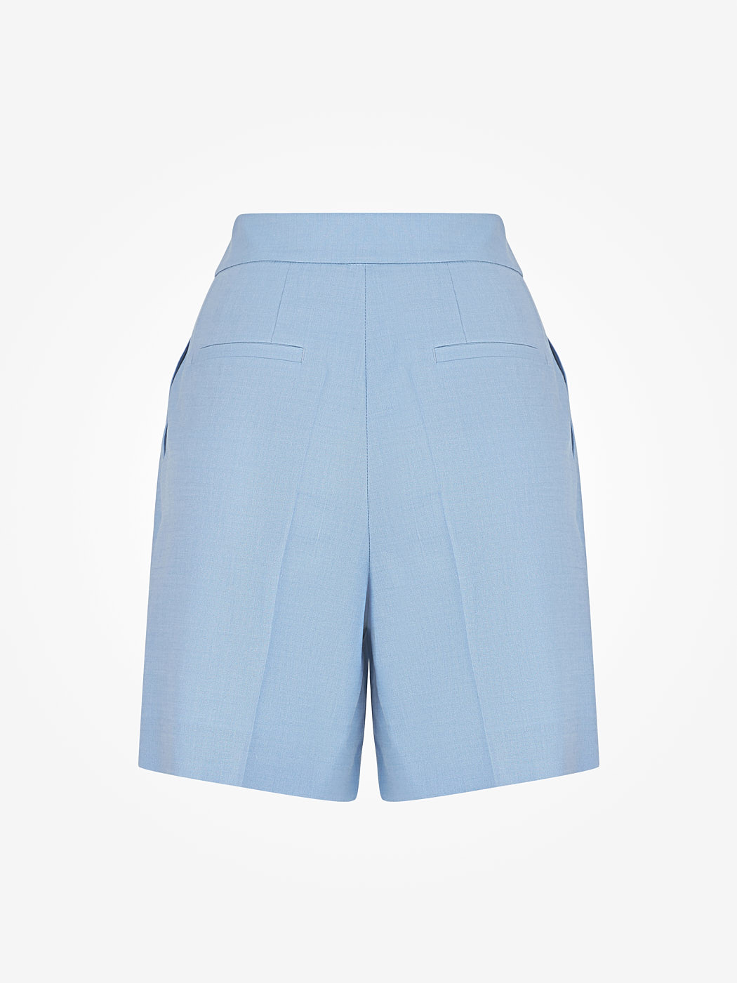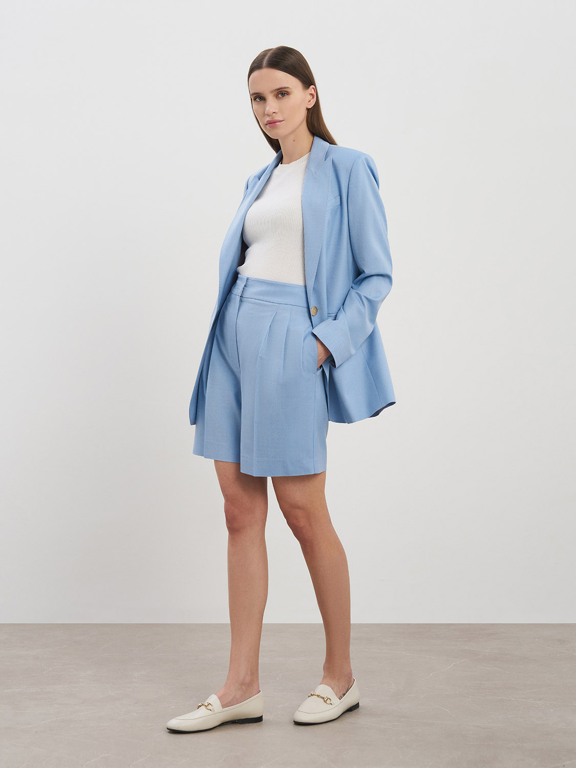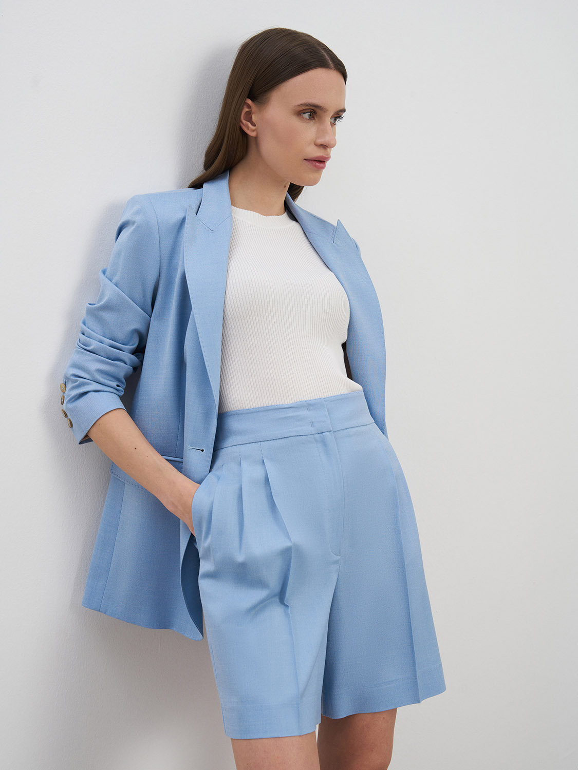 Костюмные шорты-бермуды из смесовой ткани с добавлением натуральной шерсти. Высокая посадка, боковые прорезные карманы, классические стрелки и защипы. Благодаря смесовому составу ткани, шорты сохраняют форму, комфортны в жаркую погоду, ткань приятная на ощупь и коже. Сочетайте с жакетом изо льна, топами, футболками, лоферами или сандалиями. На модели размер S. Параметры модели: рост 173, 80-63-91.