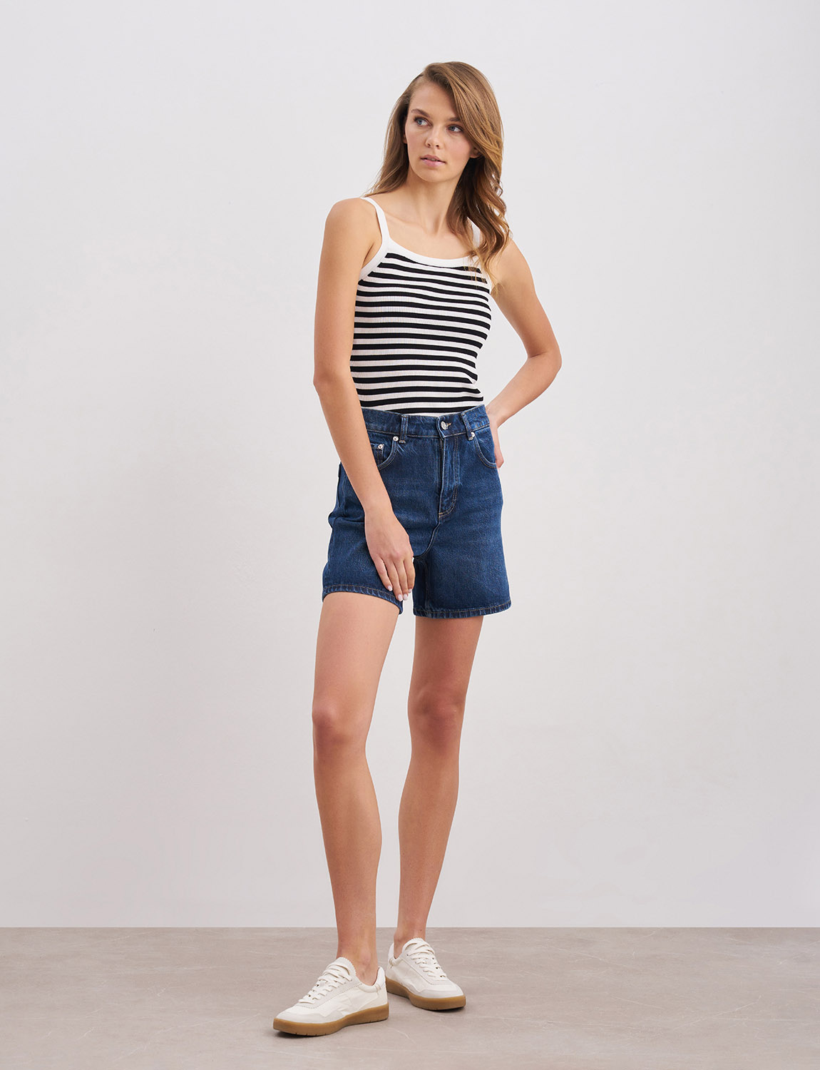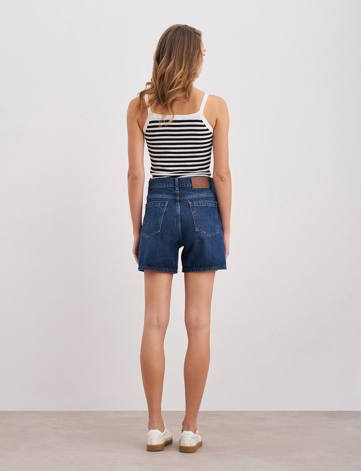 Классические джинсовые шорты из смесового хлопка. Комфортная длина, свободный крой, боковые карманы и карманы на бедрах, застежка на молнию с пуговицей. Джинсовые шорты-базовый элемент повседневного летнего гардероба, сочетайте с топами, рубашками, кедами или сандалиями. На модели размер 26. Параметры модели: рост 180, 83-60-88.