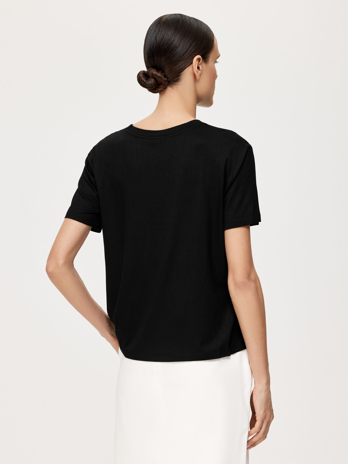 Универсальная футболка свободного кроя со слегка опущенной линией плеча – основа для повседневных образов. Классическая округлая горловина. Выполнена из мягкой и нежной вискозы, приятной к телу, хорошо пропускающей воздух и охлаждающей в жару. Сочетается с различными элементами гардероба: с джинсами, брюками, юбками и шортами. Накидывайте жакеты, жилеты и кардиганы для многослойных вариантов. На модели размер S. Параметры модели: рост 178, 82-62-89.