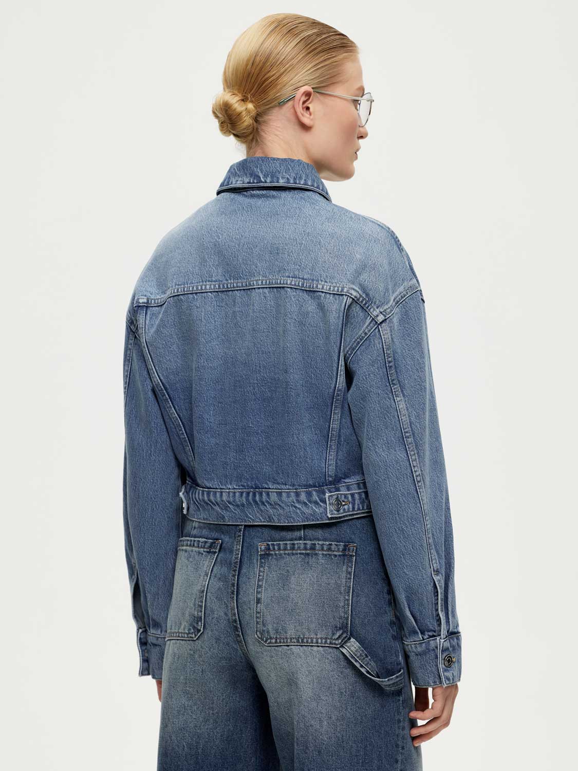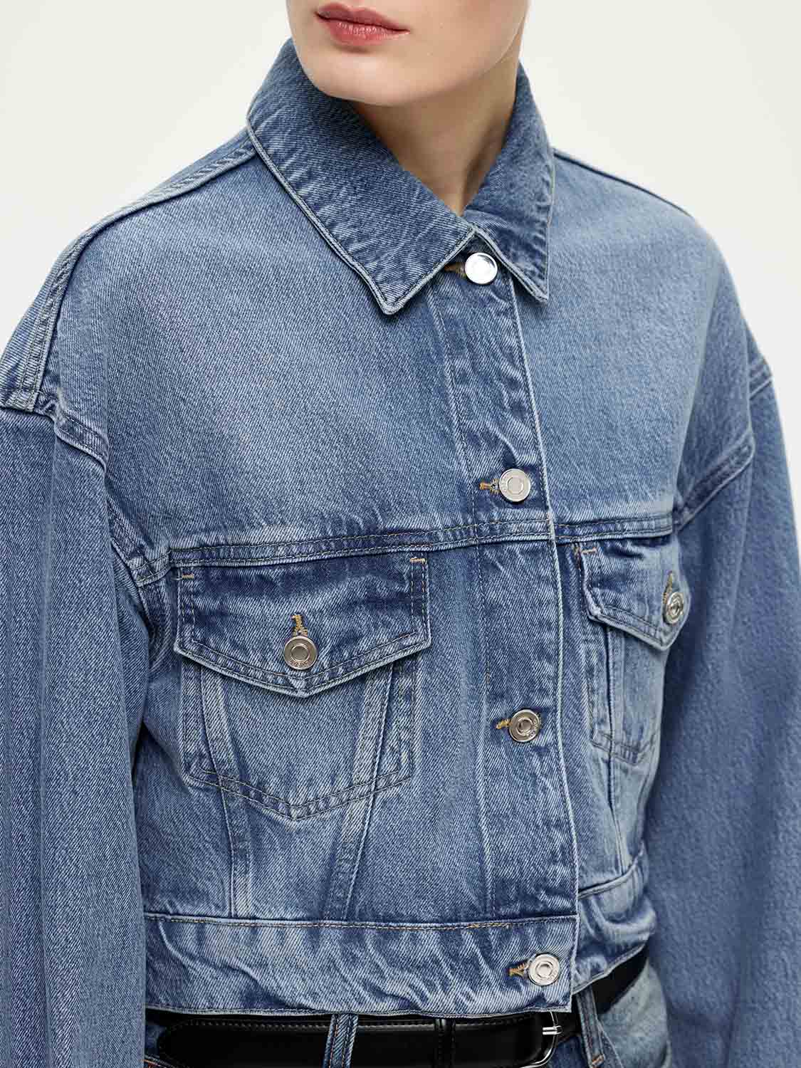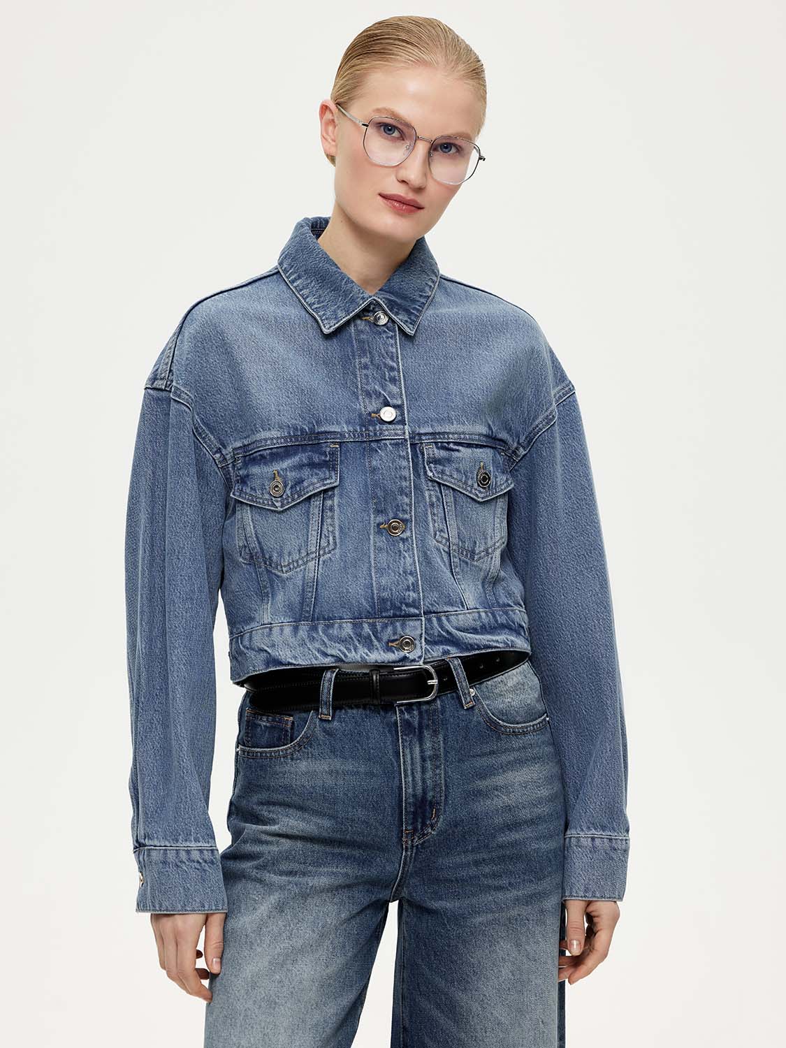 Укороченная джинсовая куртка сшита из мягкого дышащего хлопка. В состав ткани добавили прочный шелковистый тенсел с антибактериальными свойствами, поэтому она не вытянется со временем и будет дольше сохранять свежий вид после стирки. Опущенный рукав, свободный крой делают куртку комфортной в носке, а также позволяют надевать под низ объемные вещи. Куртка с отложным воротником, накладными карманами и металлическими пуговицами. Выразительности придает легкая выбеленность, эффект делаве. Комбинируйте с джинсами из нашей коллекции, создавая total denim образы, или с платьями, юбками и брюками, играя на контрасте фактур. На модели размер S. Параметры модели: рост 175, 80-63-89.