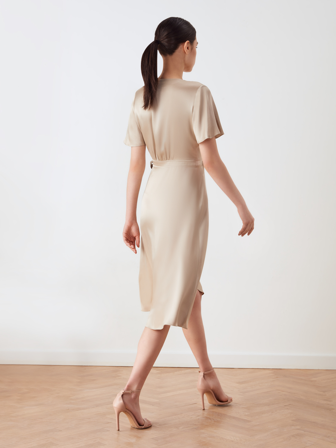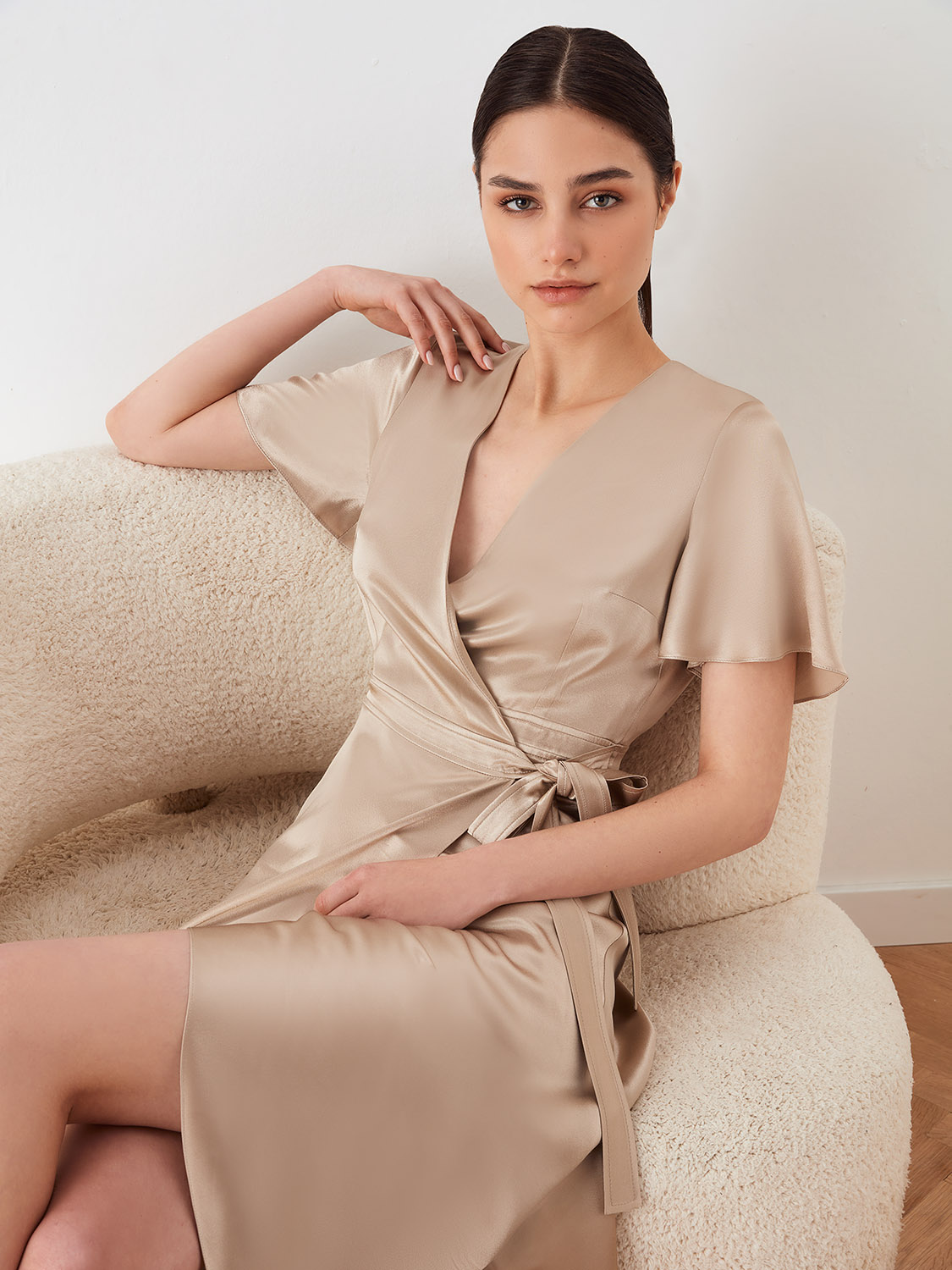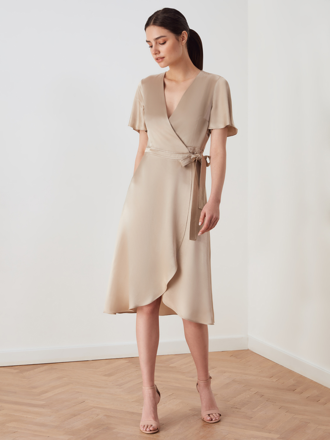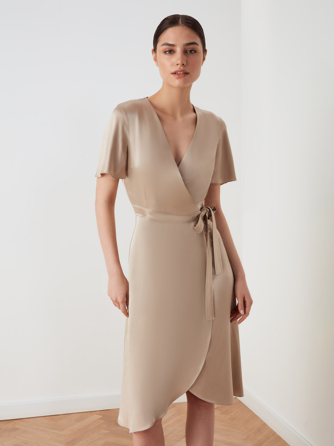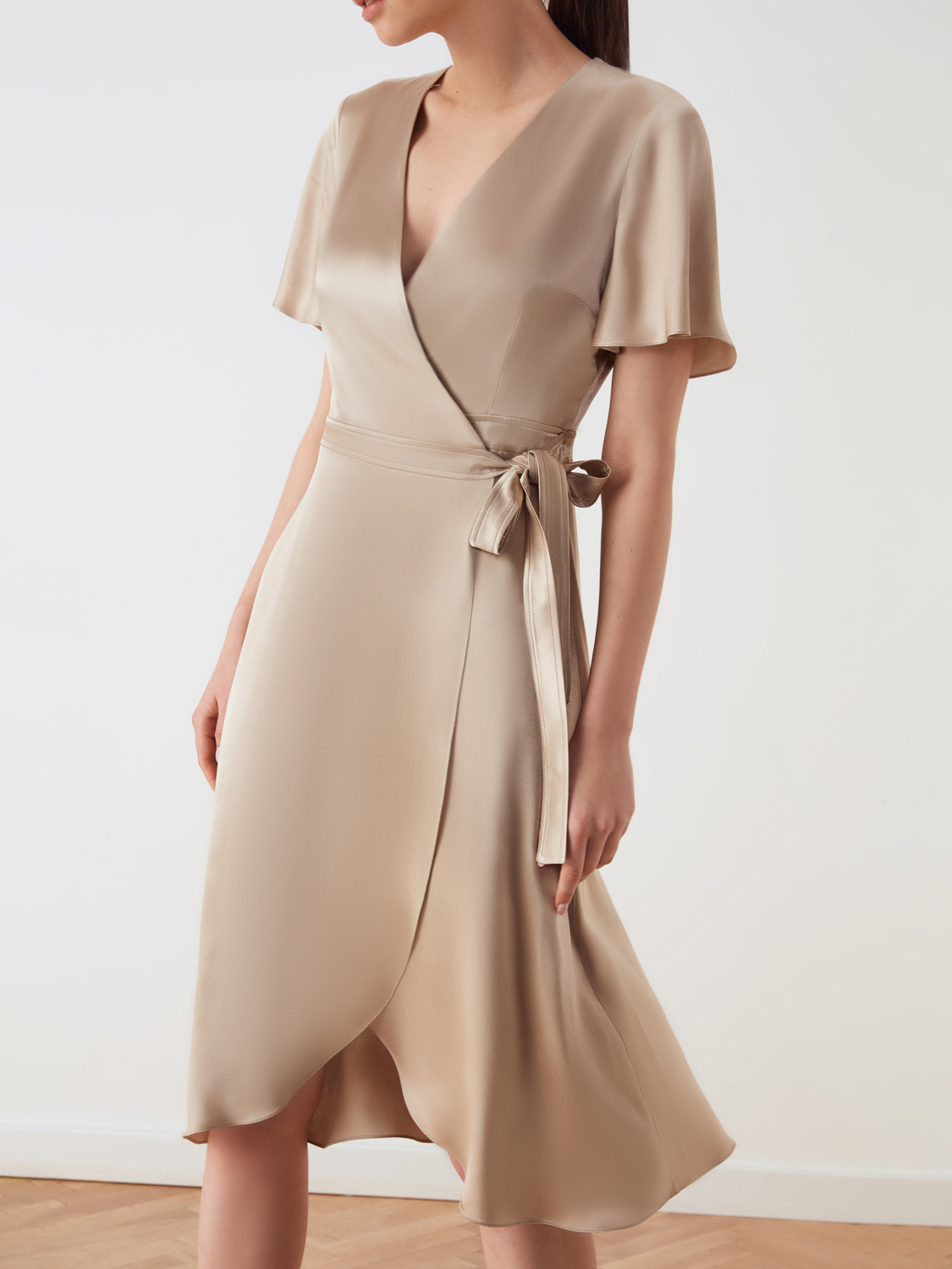 Элегантное платье миди на запах из струящейся вискозы. Пояс на талии и V-образный вырез в зоне декольте придают фигуре изящный силуэт. Свободный летящий низ и рукава лаконично сочетаются с любым типом фигуры, а универсальный крой позволяет регулировать размер под ваши параметры. Платье подойдет для прогулок, встреч, различных мероприятий и торжеств. Его легко сочетать с вещами базового гардероба-с туфлями и босоножками, пиджаком и блейзером.