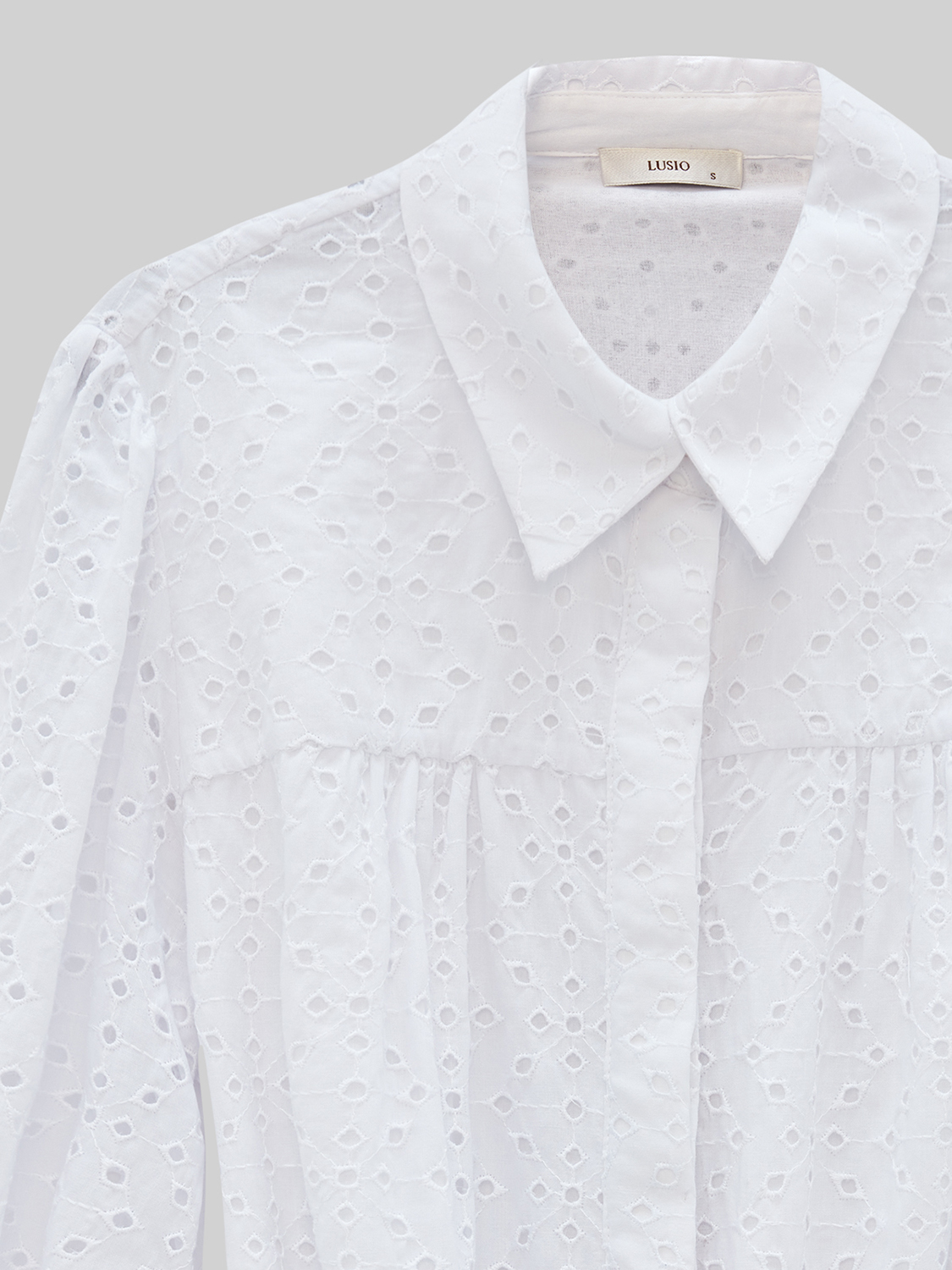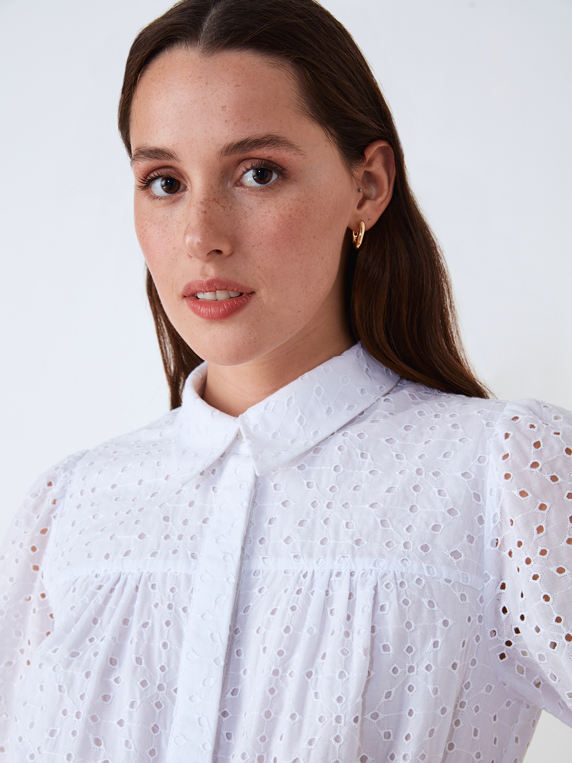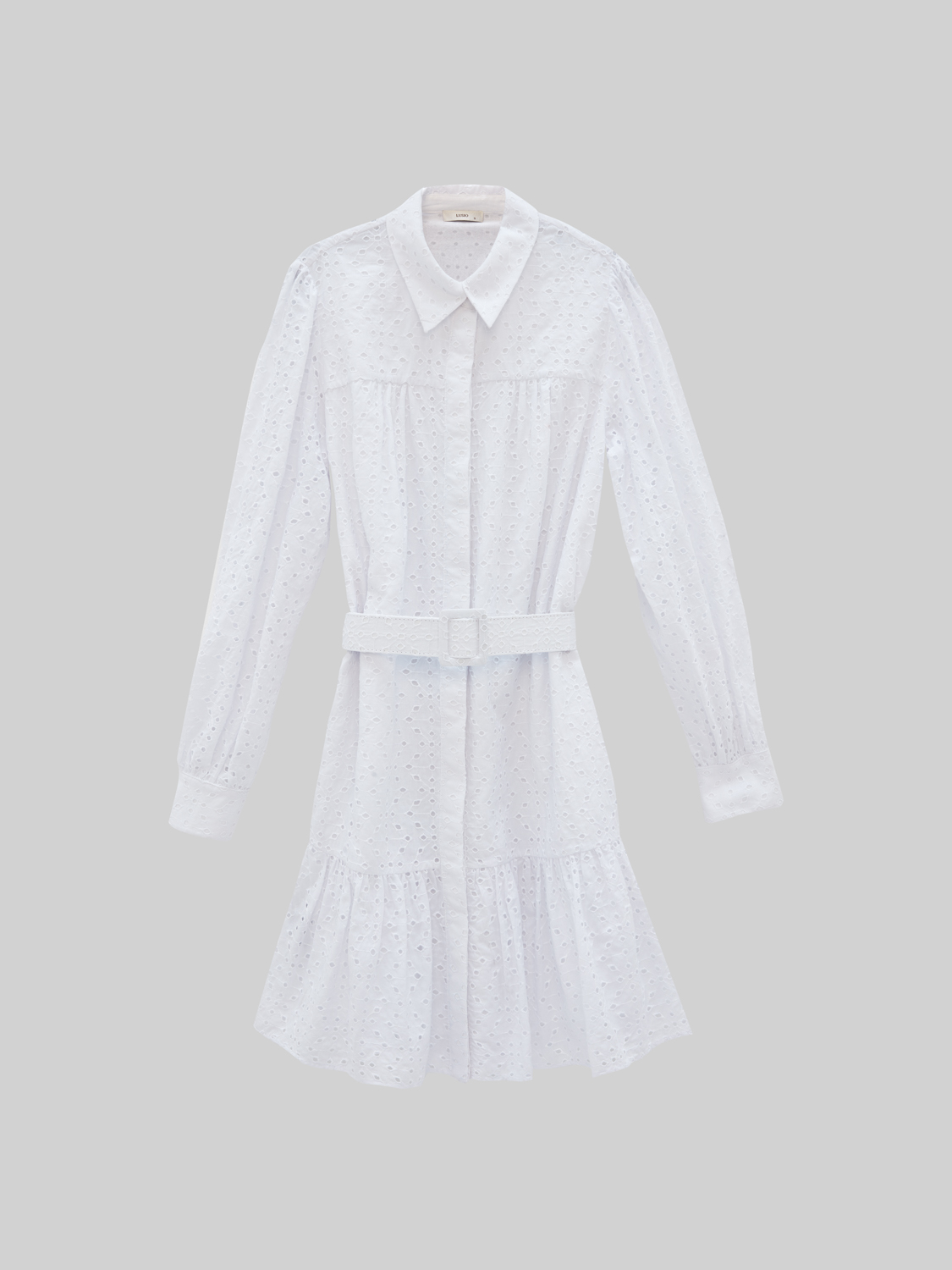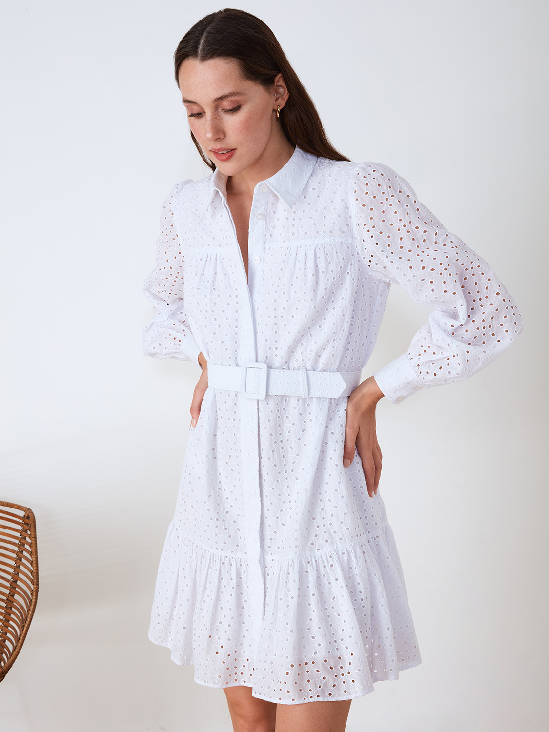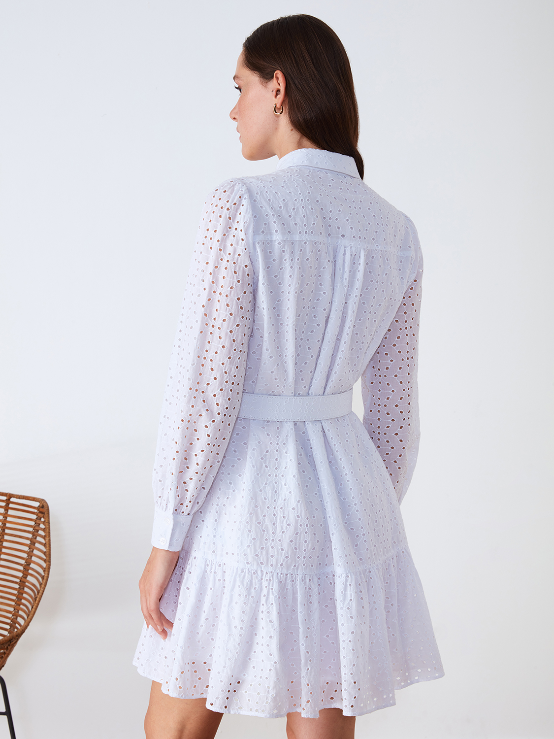 Платье мини с длинными рукавами и кружевом из натурального хлопка. Классический ворот, застежка со скрытой планкой, съемный пояс на талии, дышащая подкладка из вискозы. Платье дополнит повседневные летние образы в сочетании с легкими босоножками или сандалиями. На модели размер S. Параметры модели: рост 177, 81-62-92.