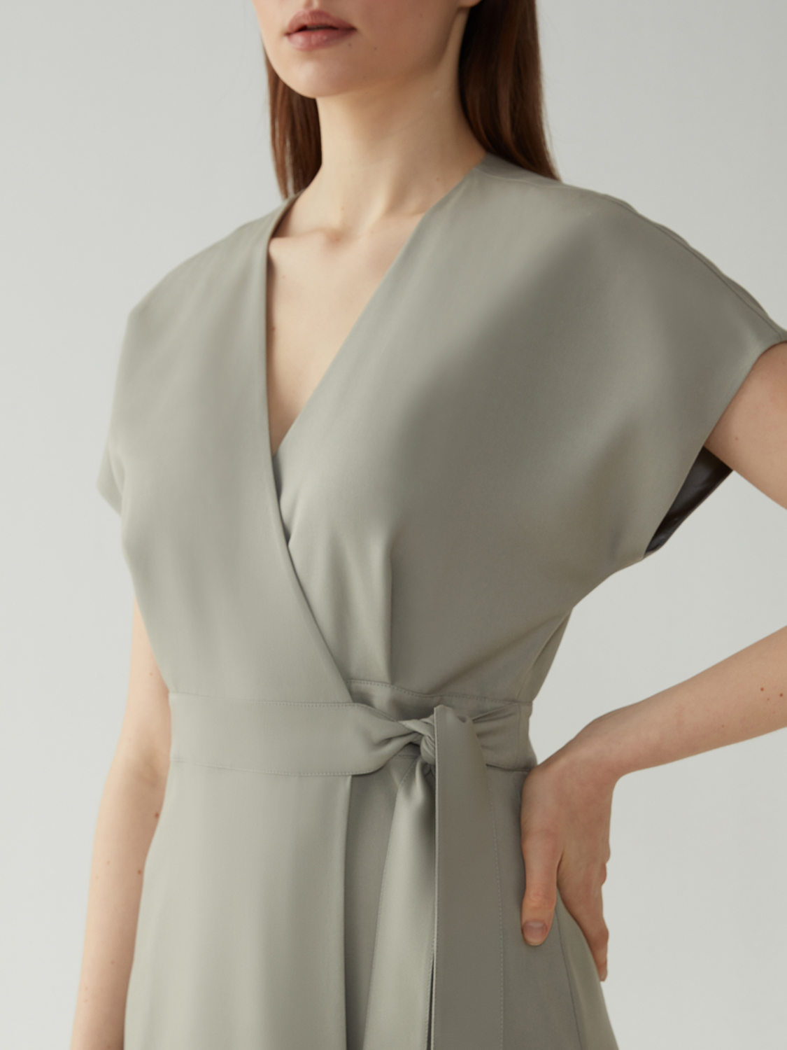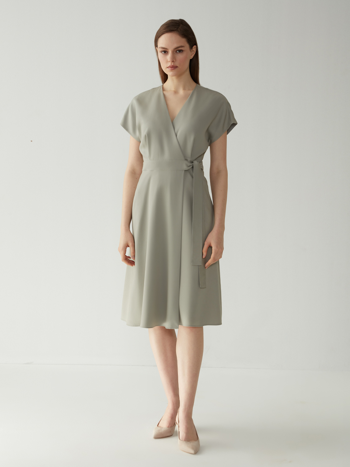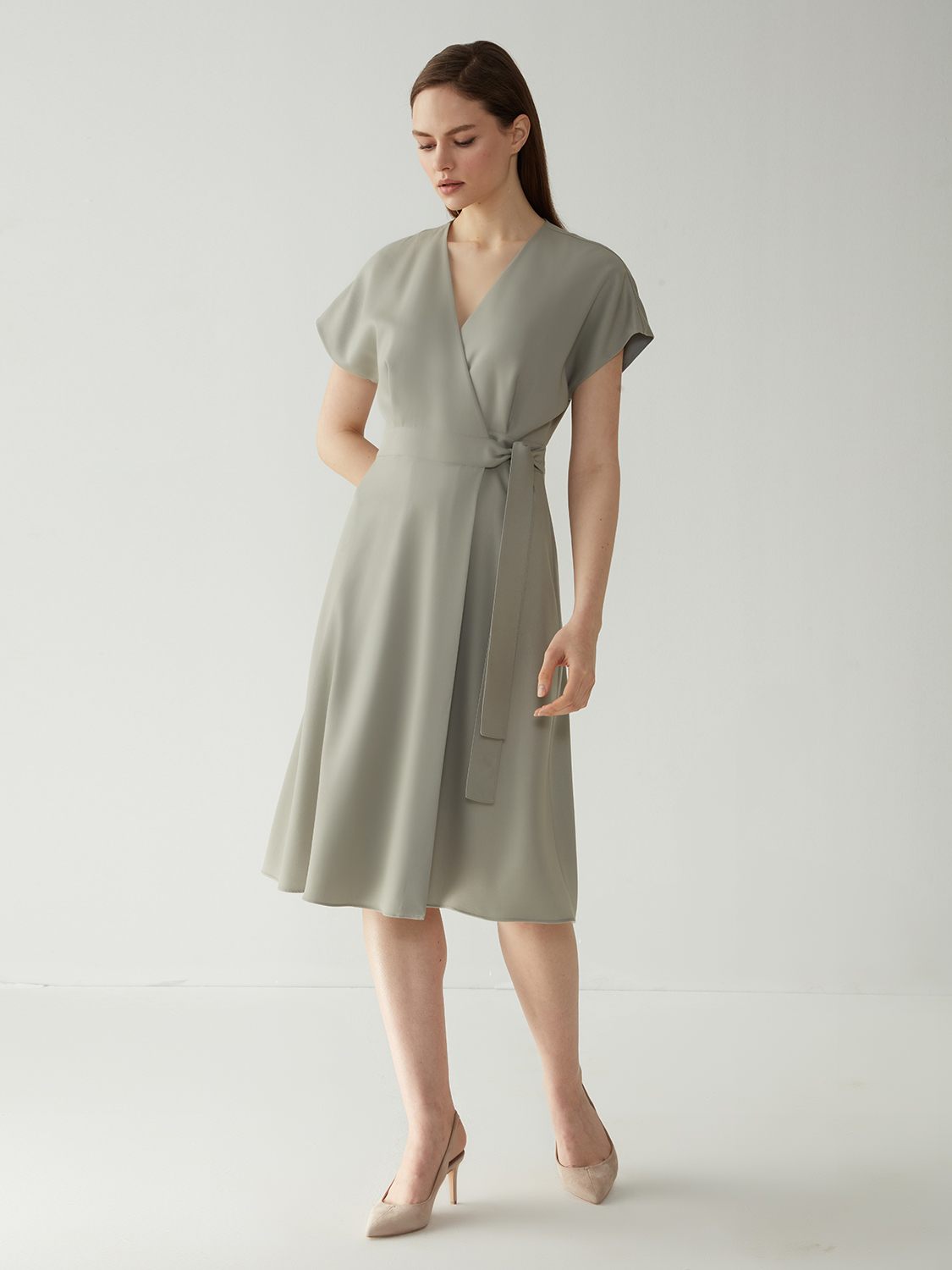 Невероятно женственное и элегантное платье миди на запах. Пояс на талии и V-образный вырез в зоне декольте придают фигуре изящный силуэт.