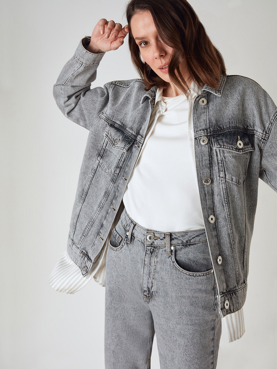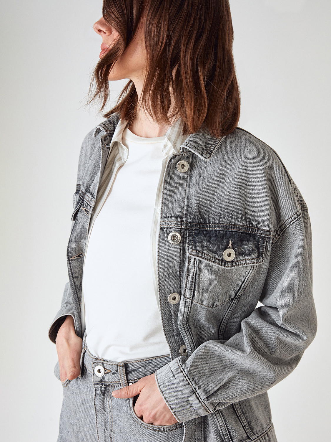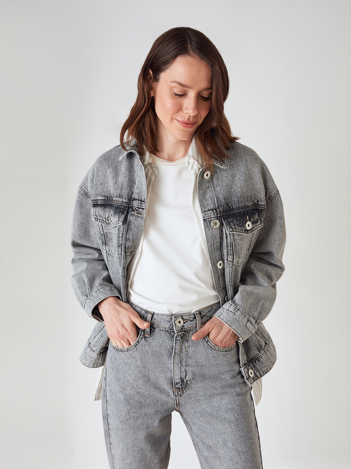 Базовая джинсовая куртка оверсайз. Плотный, дышащий деним, спущенная линия рукава, манжеты и застежка на пуговицах. Свободно сидит по фигуре, сочетается с любыми кэжуал образами-джинсами, футболками и топами, кедами. Универсальный вариант для повседневной жизни, работы, прогулок в прохладную погоду и встреч.